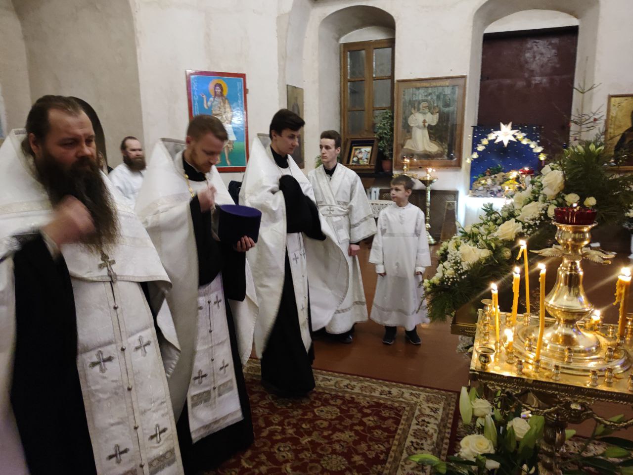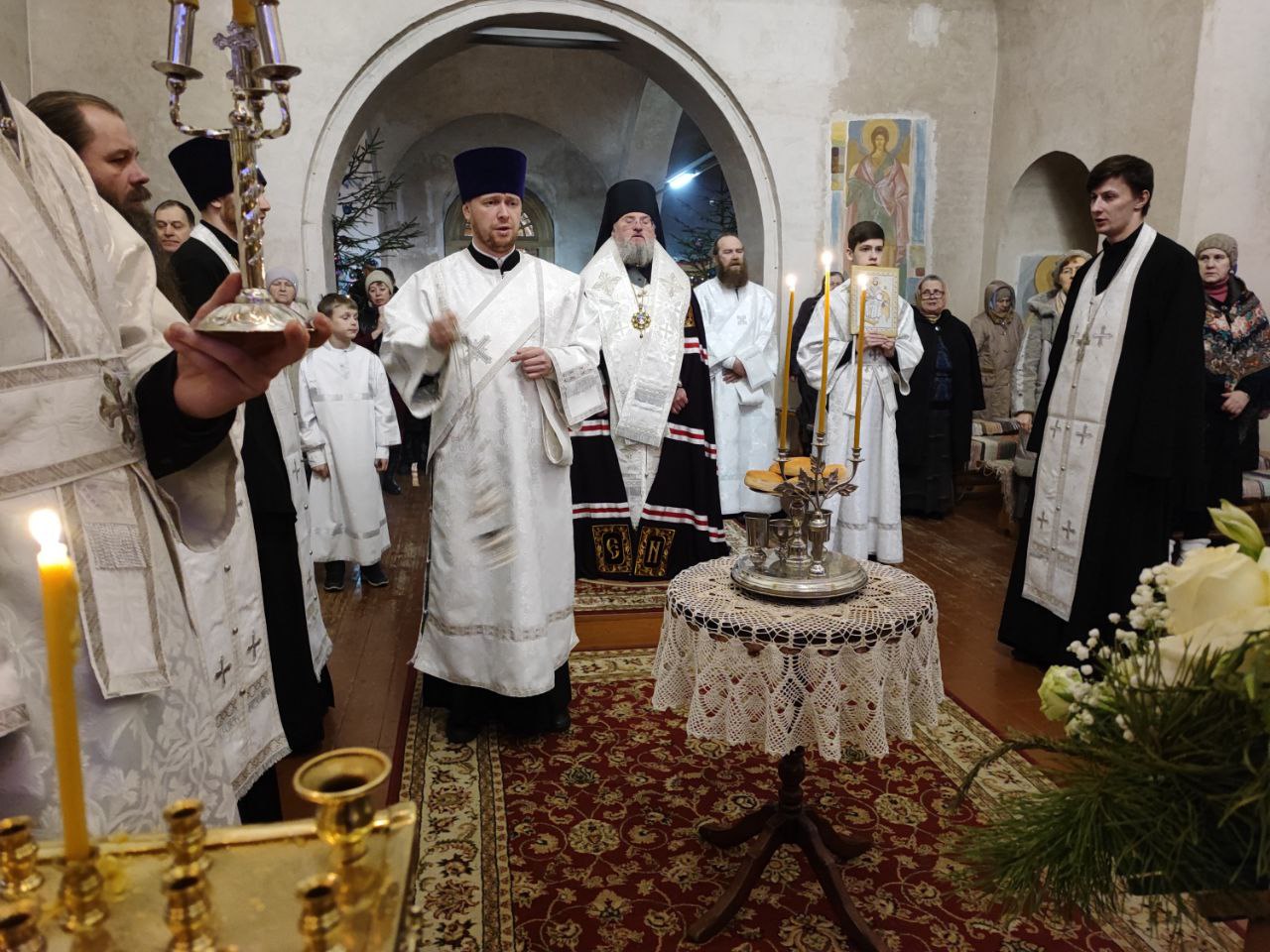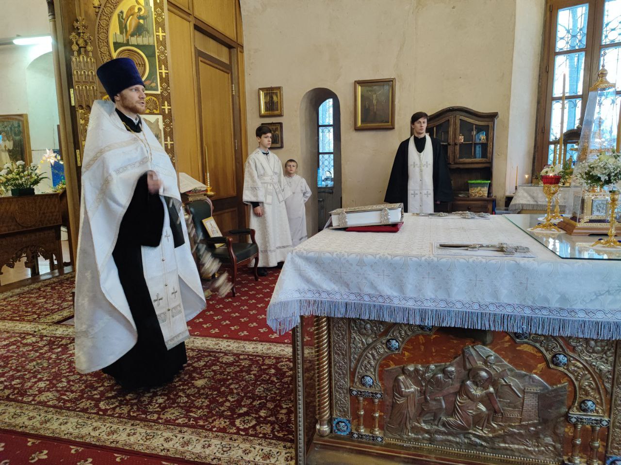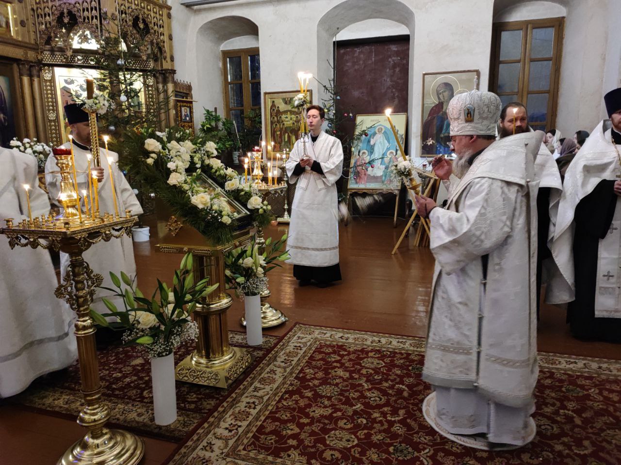 Архипастырю солужили: настоятель храма иеромонах Паисий (Курмаз), иерей Елисей Тимофеев, иерей Филипп Лисенков, иерей Евгений Чуркин, диакон Евгений Ковригин и диакон Дмитрий Лутков.