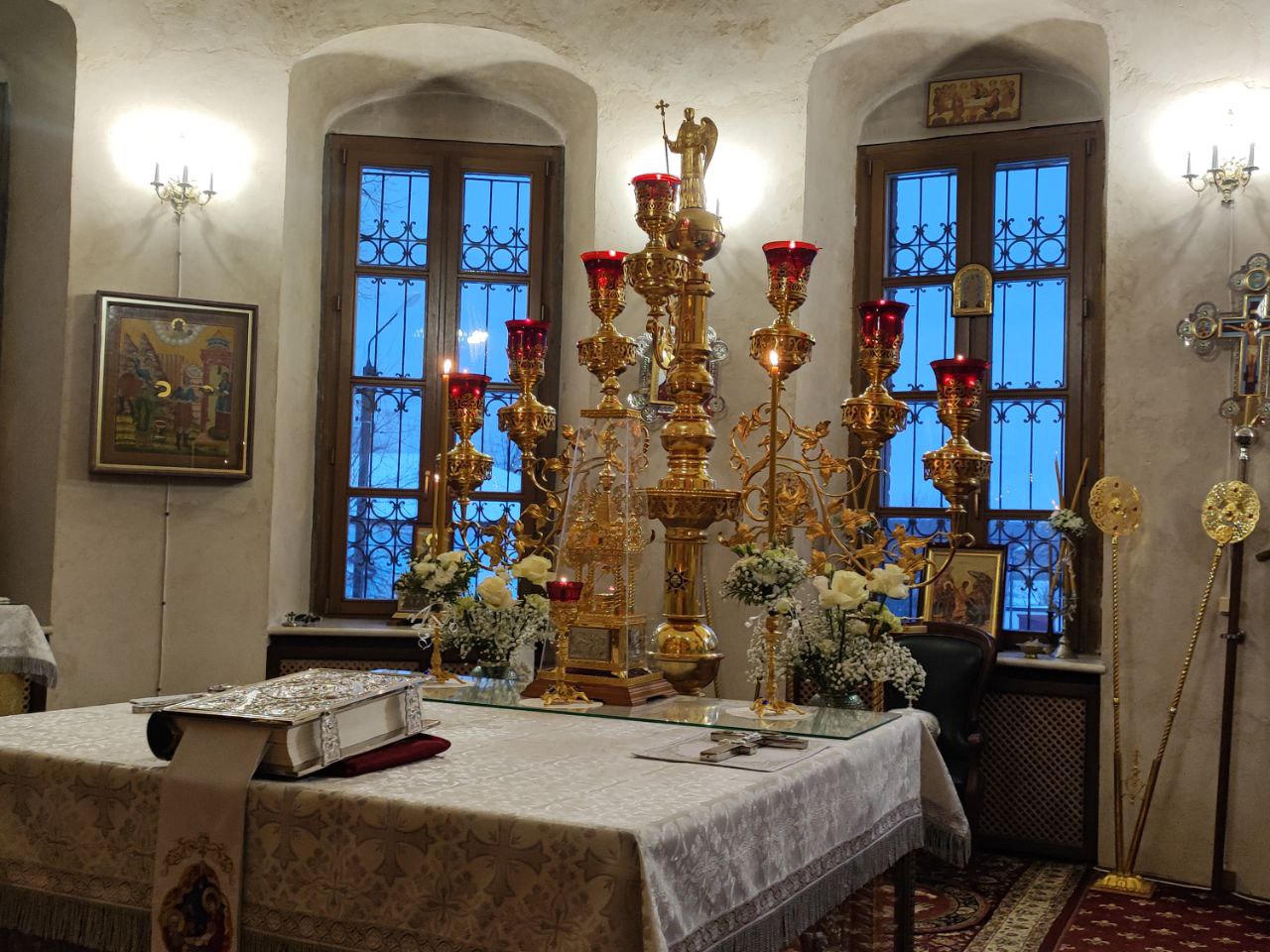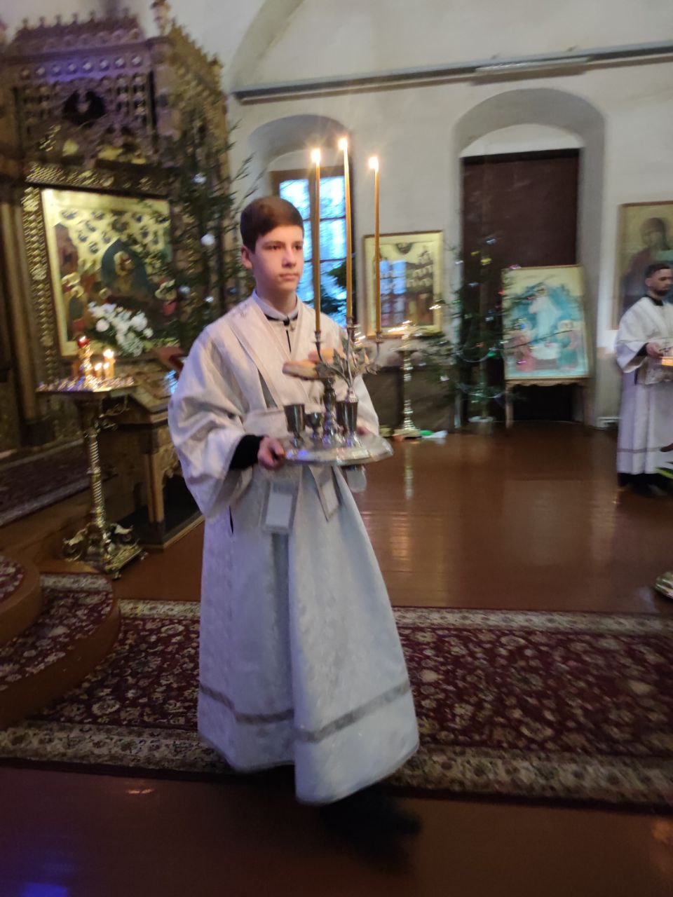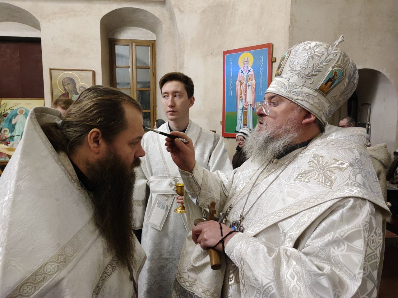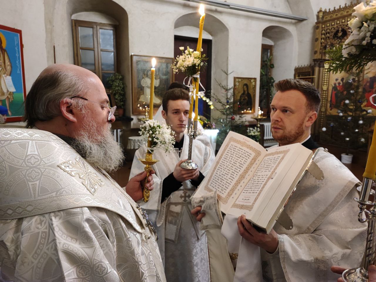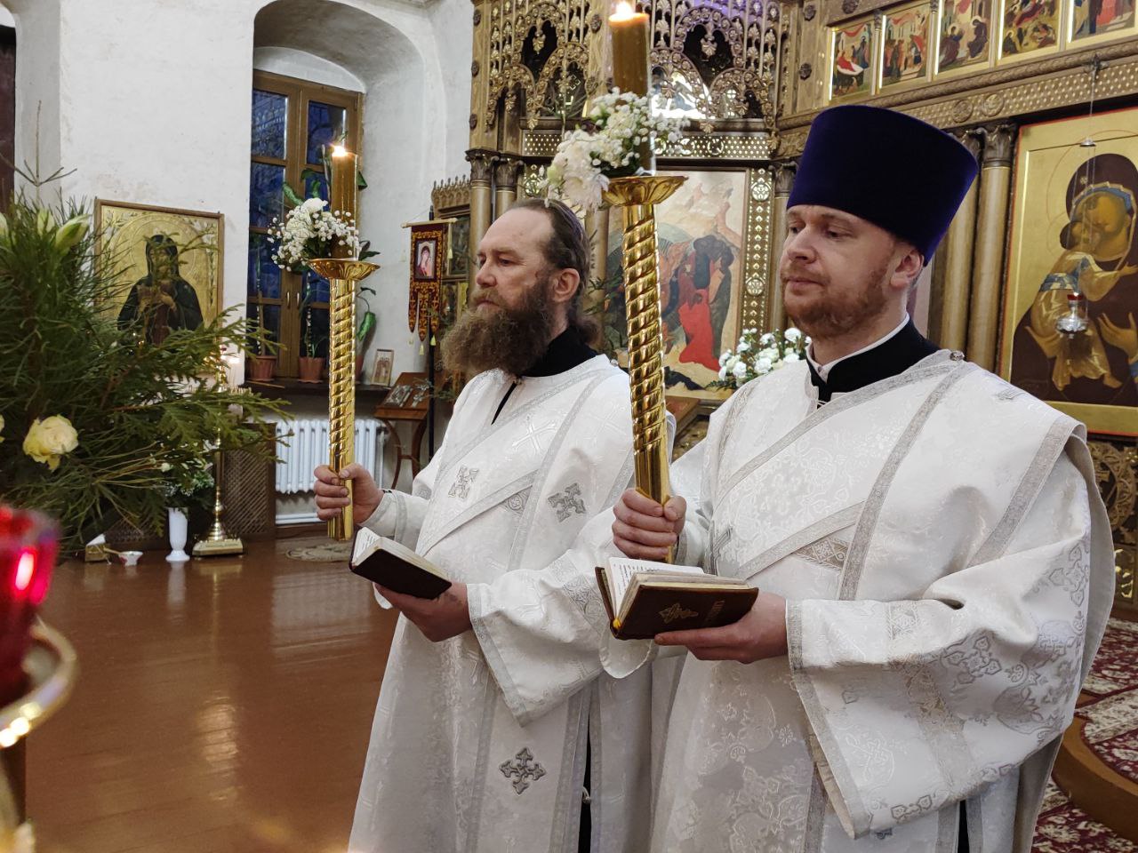Архипастырю солужили: настоятель храма иеромонах Паисий (Курмаз), иерей Елисей Тимофеев, иерей Филипп Лисенков, иерей Евгений Чуркин, диакон Евгений Ковригин и диакон Дмитрий Лутков.