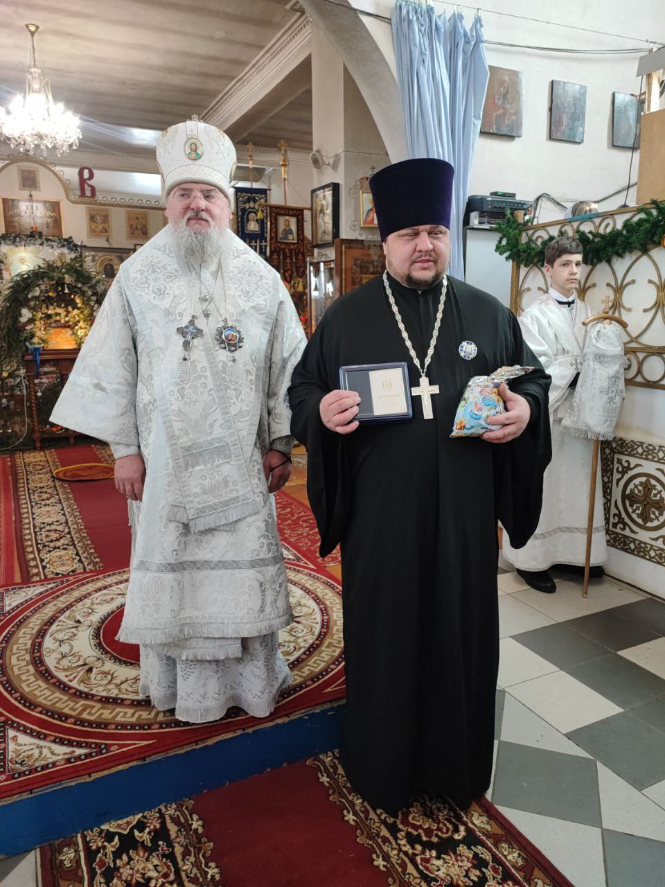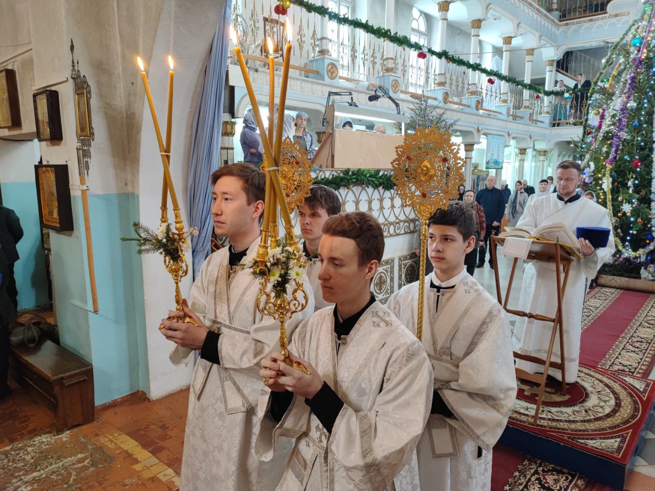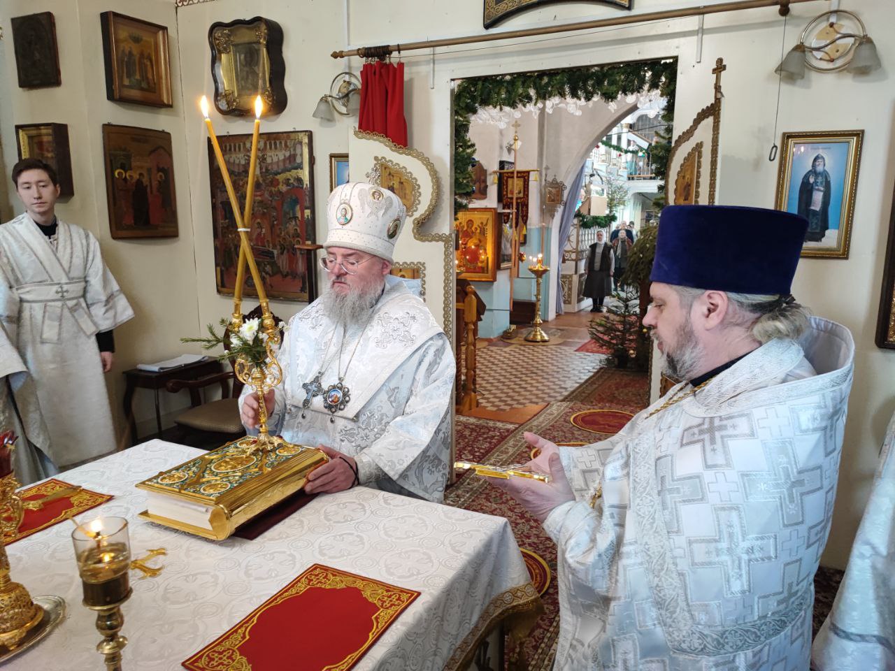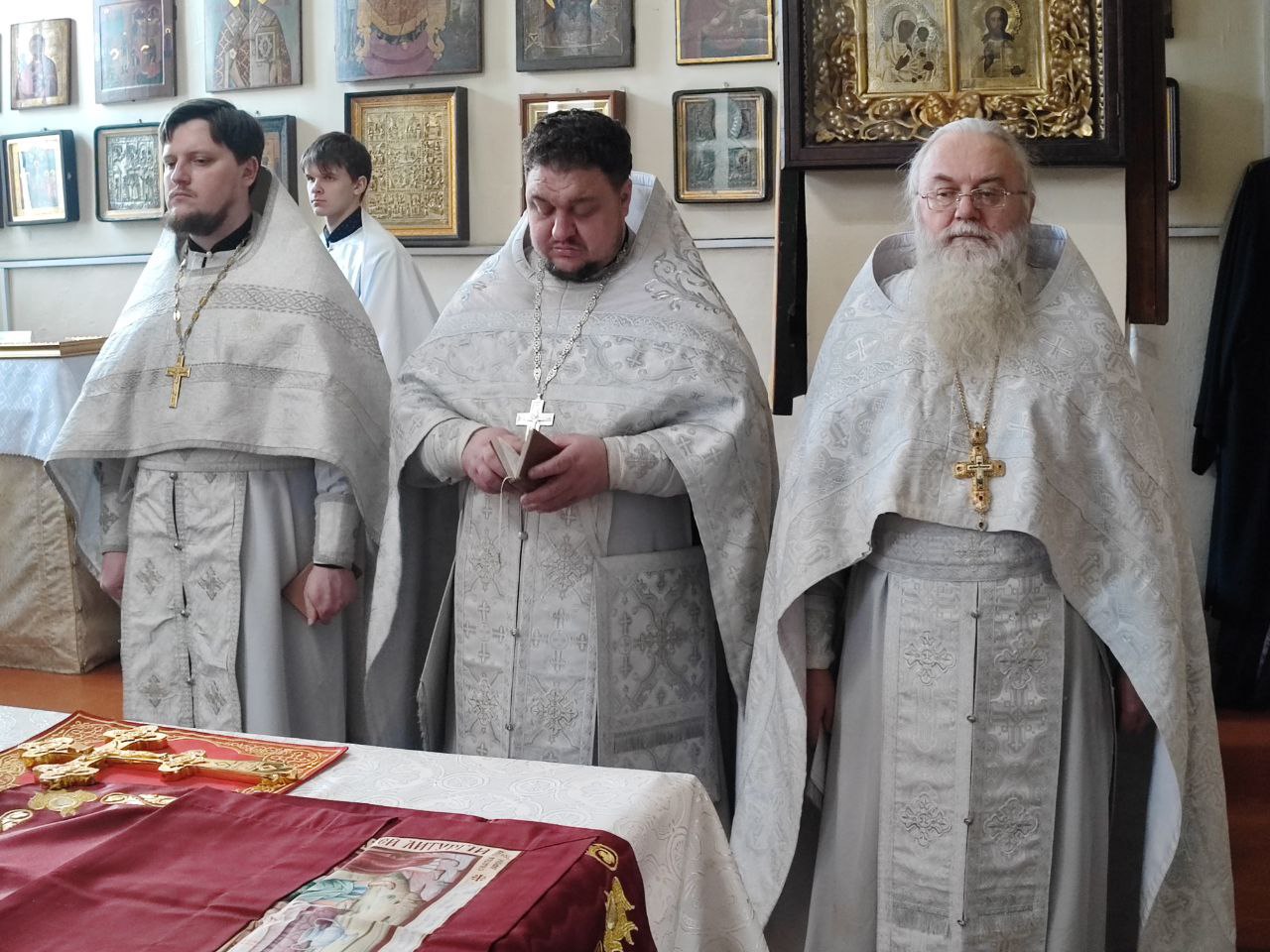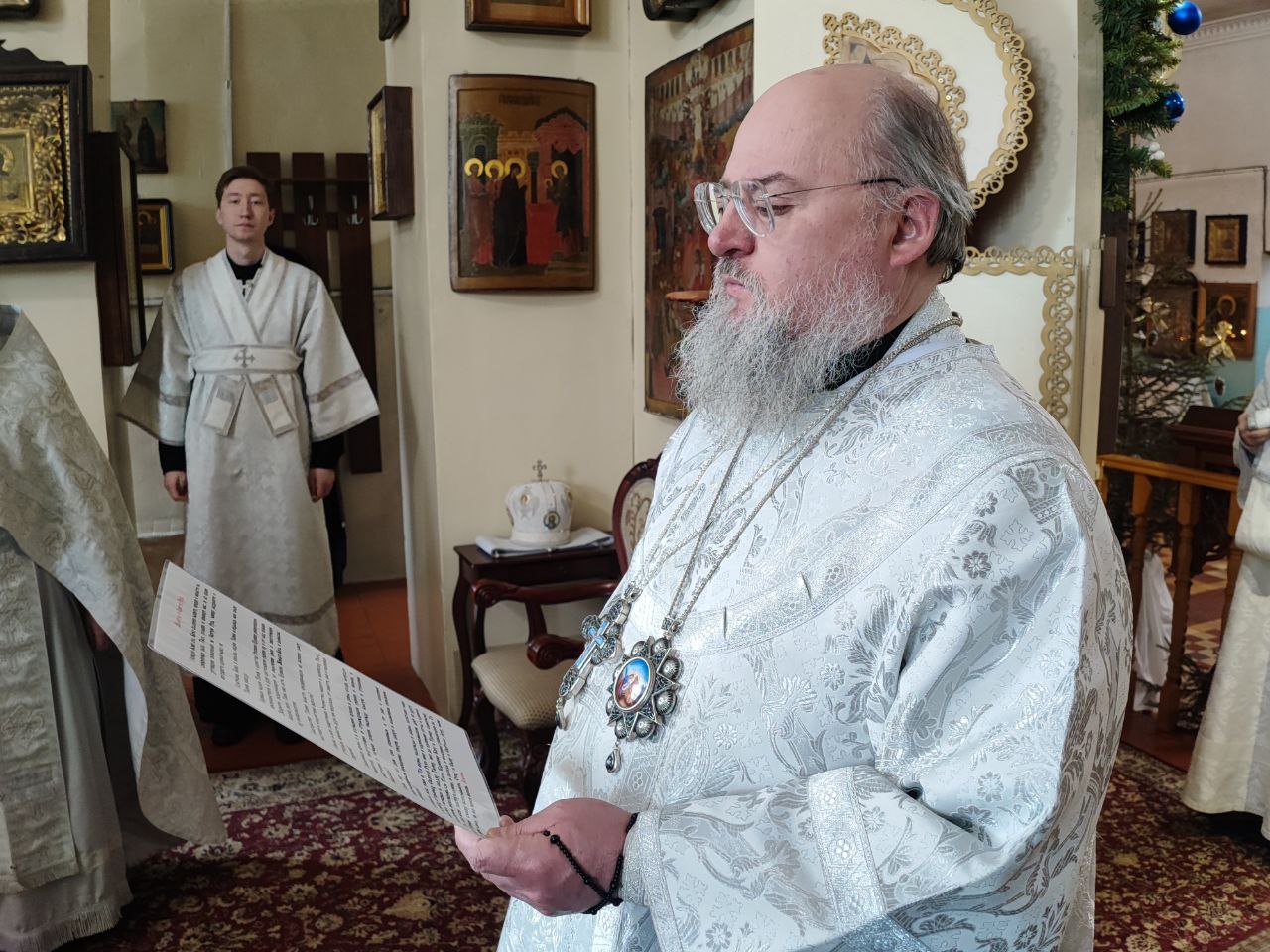 Его Преосвященству сослужили: настоятель собора, благочинный округа митрофорный протоиерей Алексий Жиганов, протоиерей Михаил Карпенко, протоиерей Александр Рябов, иерей Алексий Сначев, иерей Иоанн Майоров, иерей Георгий Краснов, диакон Евгений Ковригин и диакон Андрей Соколов.