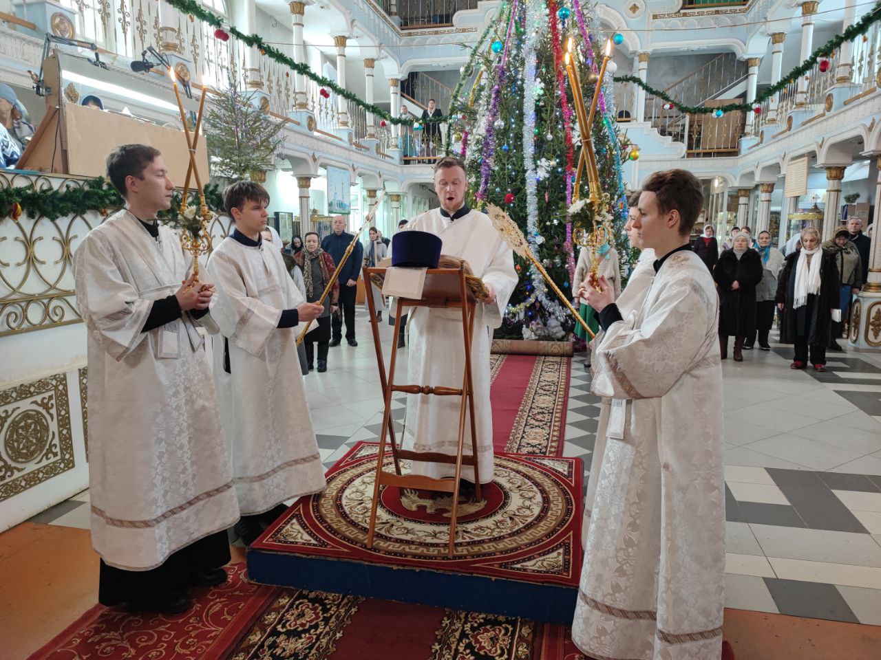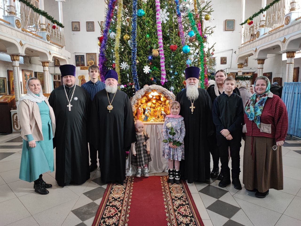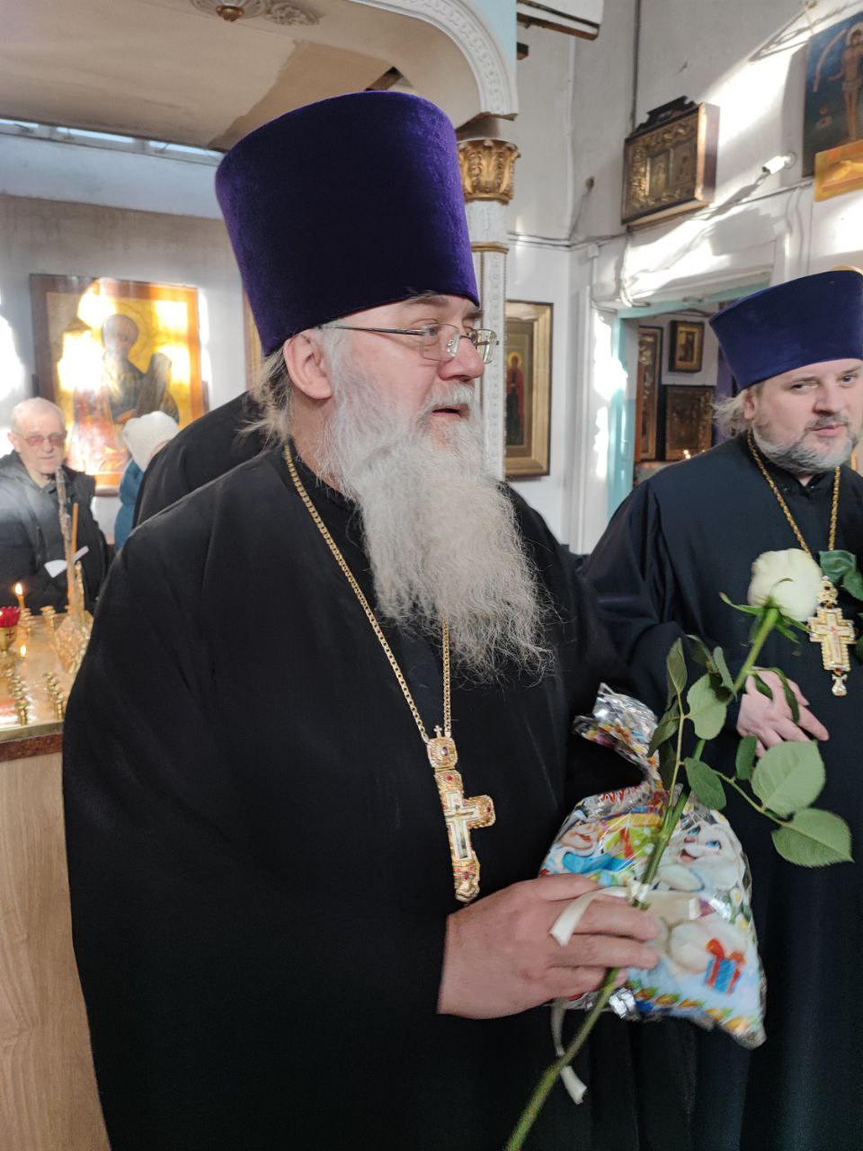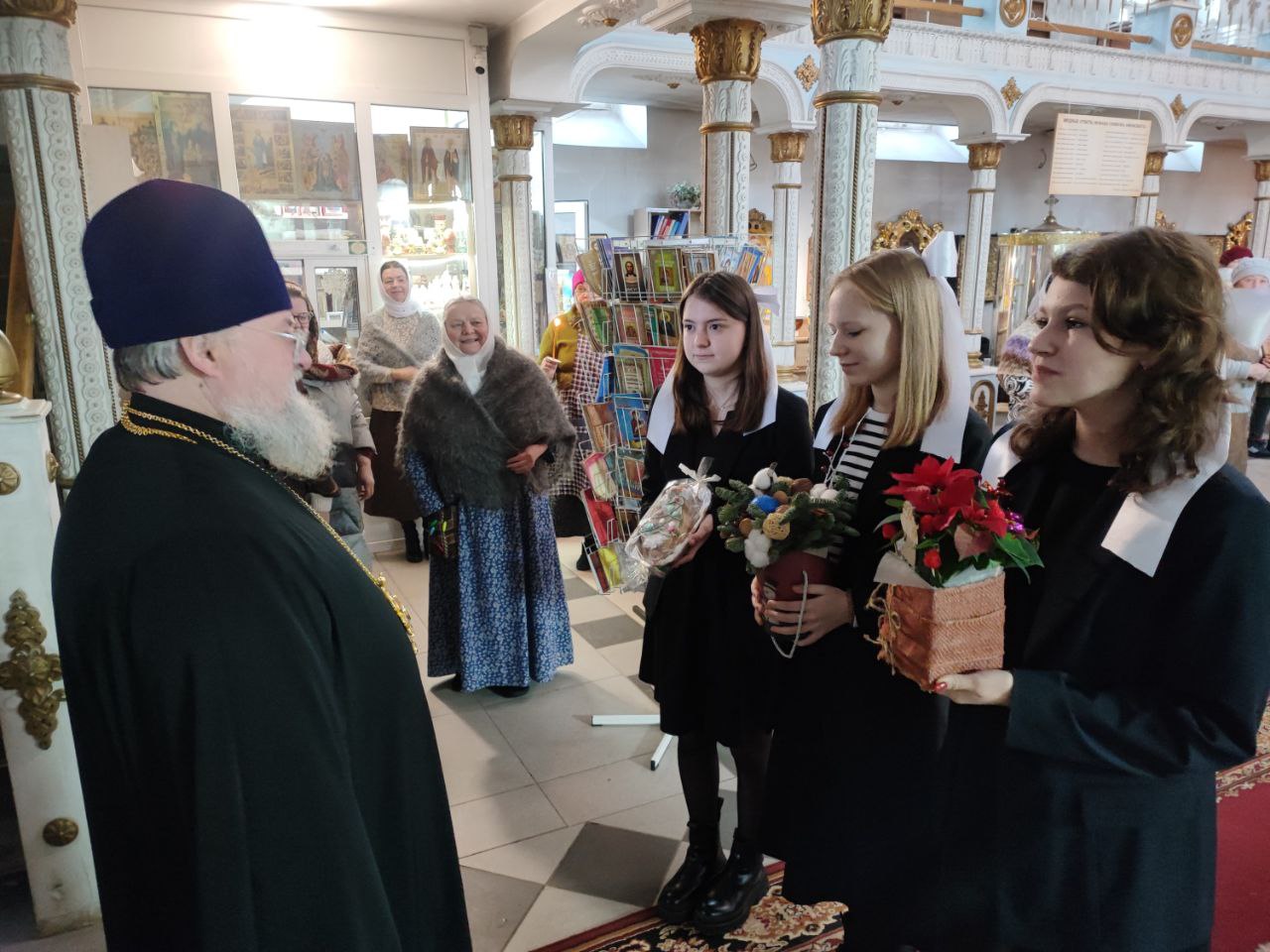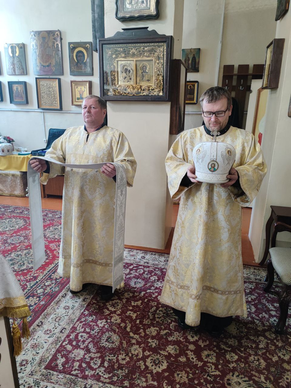 Его Преосвященству сослужили: настоятель собора, благочинный округа митрофорный протоиерей Алексий Жиганов, протоиерей Михаил Карпенко, протоиерей Александр Рябов, иерей Алексий Сначев, иерей Иоанн Майоров, иерей Георгий Краснов, диакон Евгений Ковригин и диакон Андрей Соколов.