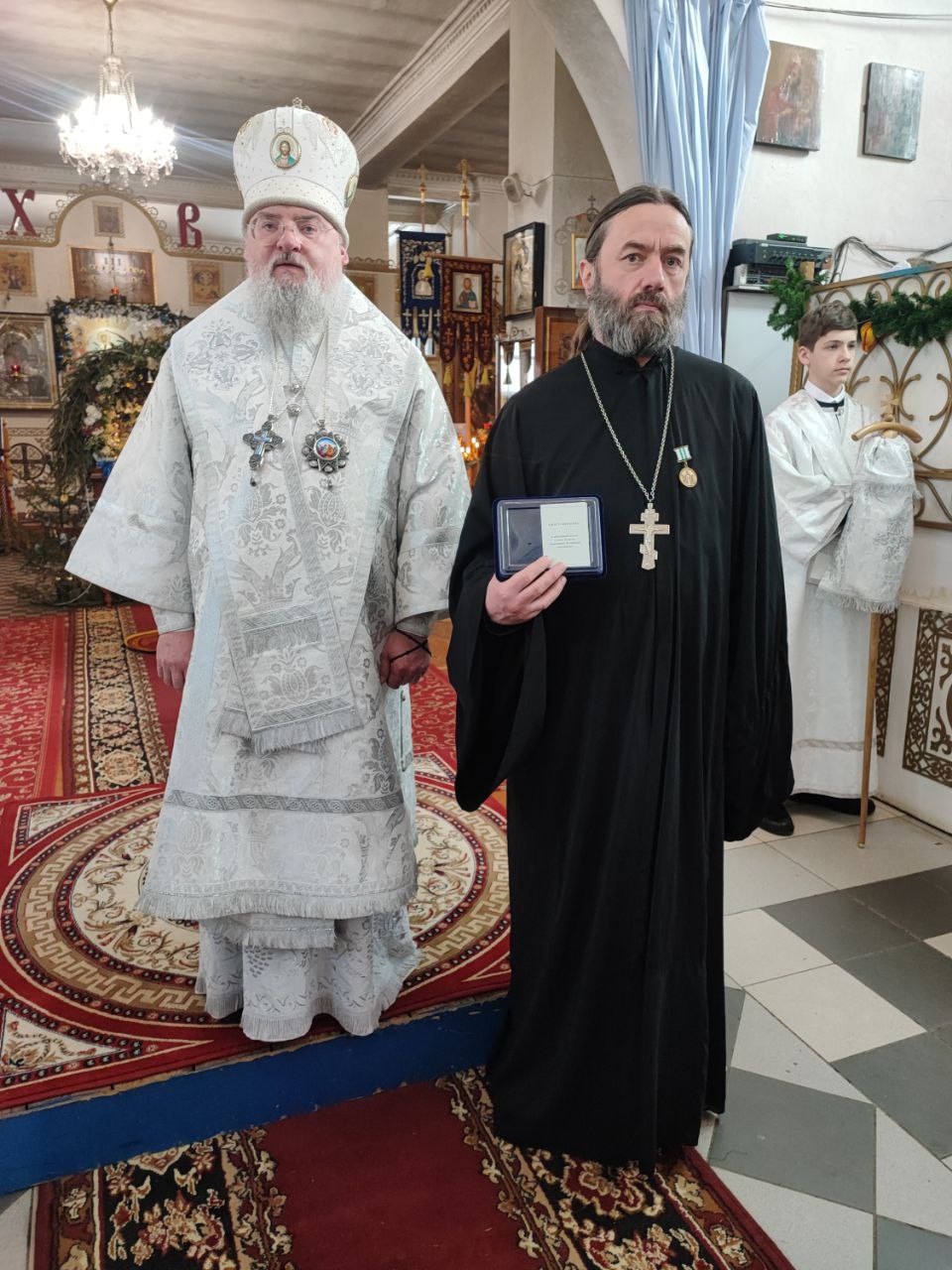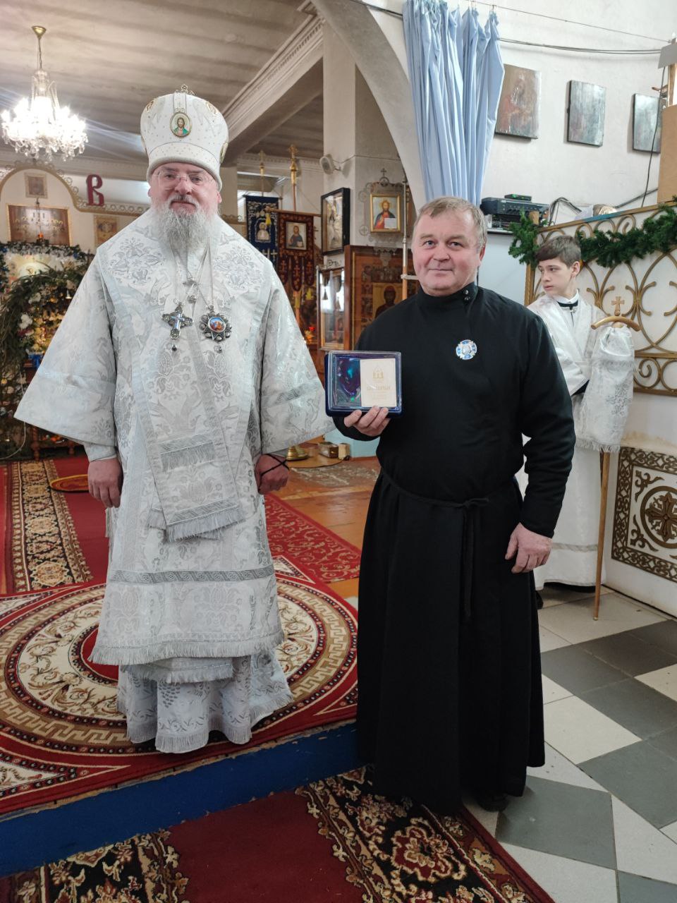 По благословению Главы Калужской митрополии митрополита Калужского и Боровского Климента, архипастырь вручил юбилейную медаль «10-летия образования Калужской митрополии» настоятелю храма благоверного Александра Невского в селе Заречный Людиновского района иерею Георгию Краснову.