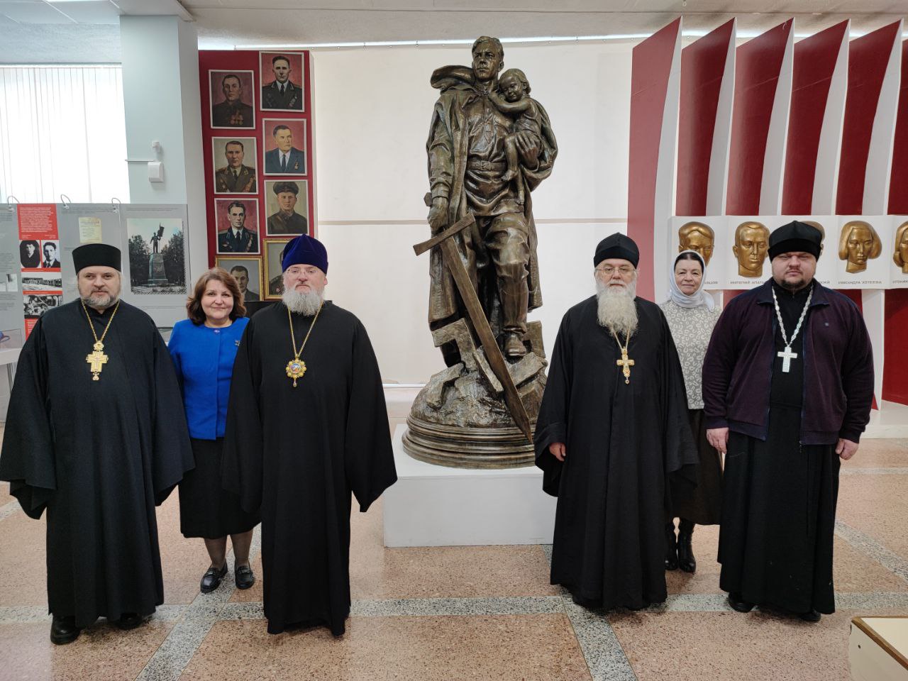 Здесь же на втором этаже владыка со священнослужителями посмотрели памятник «Воину – освободителю» (это авторская копия работы скульптора Е. В. Вучетича), установленному в экспозиции, посвящённой Великой отечественной войне.