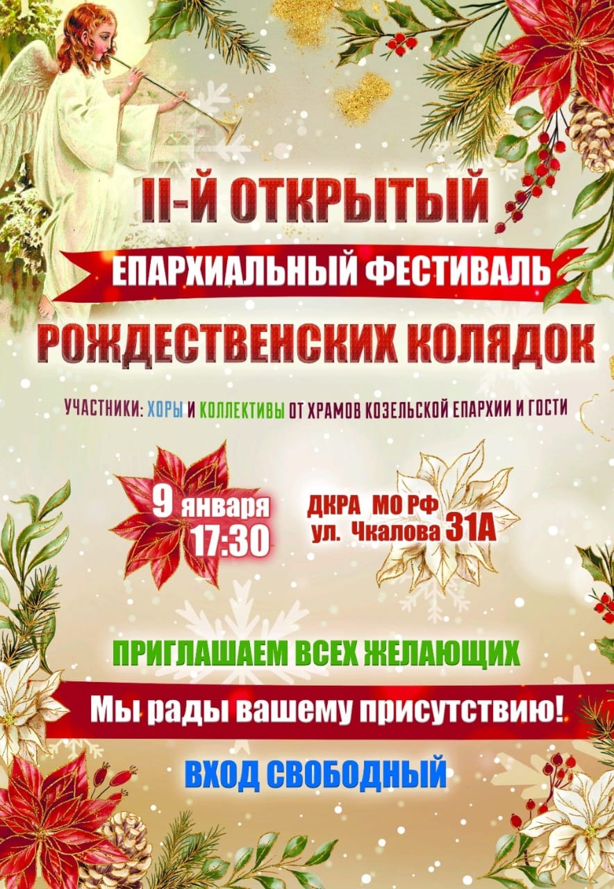 По благословению епископа Козельского и Людиновского Никиты, 9 января 2024 года в городе Козельске в здании ДКРА МО РФ, прошел II Епархиальный фестиваль колядок посвященный празднику Рождества Христова.