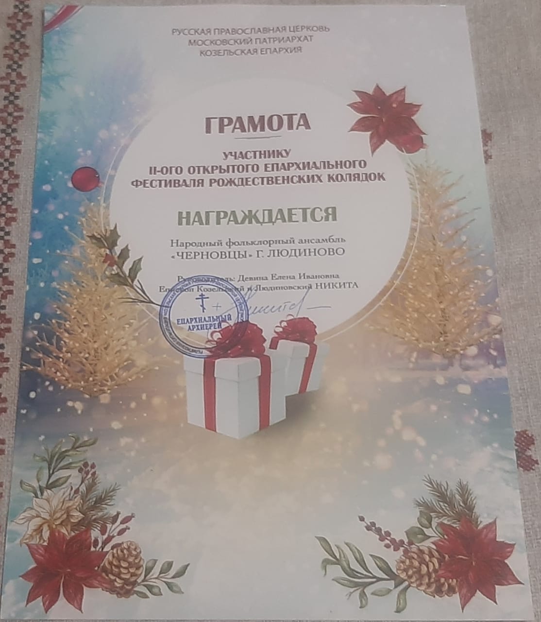 Со своими колядками, славя родившегося Христа, на Фестивале среди других песенных коллективов, выступил фольклорный народный ансамбль «Черновцы» при Казанском соборе города Людиново, руководитель Девина Елена Ивановна.