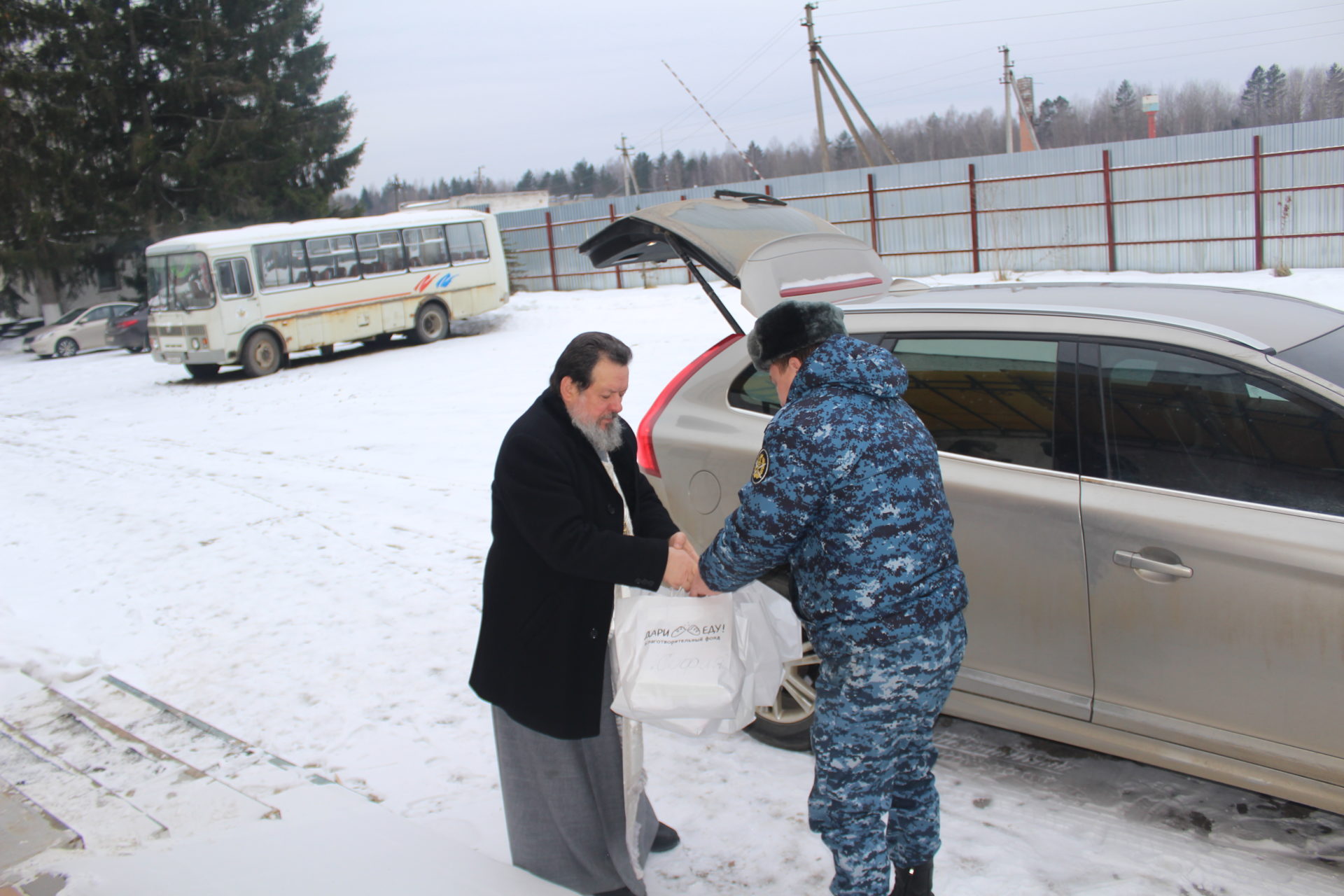 Отец Василий вручил в подарок книги А. И. Осипова «Бог», а так же передал Рождественские подарки для осужденных.