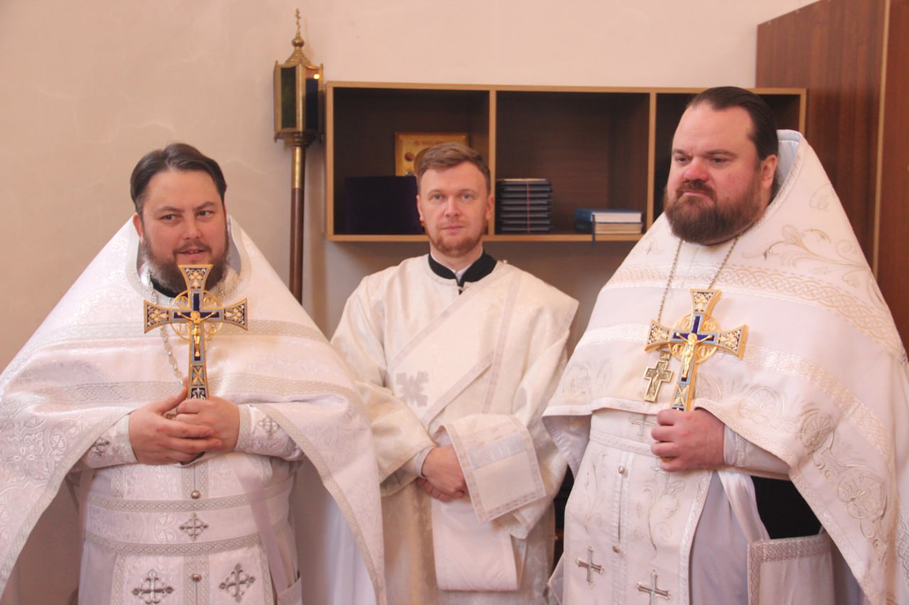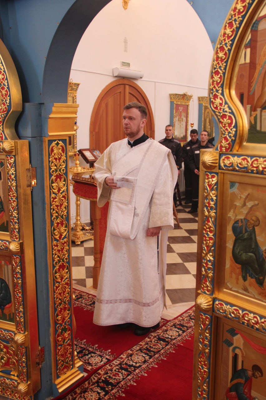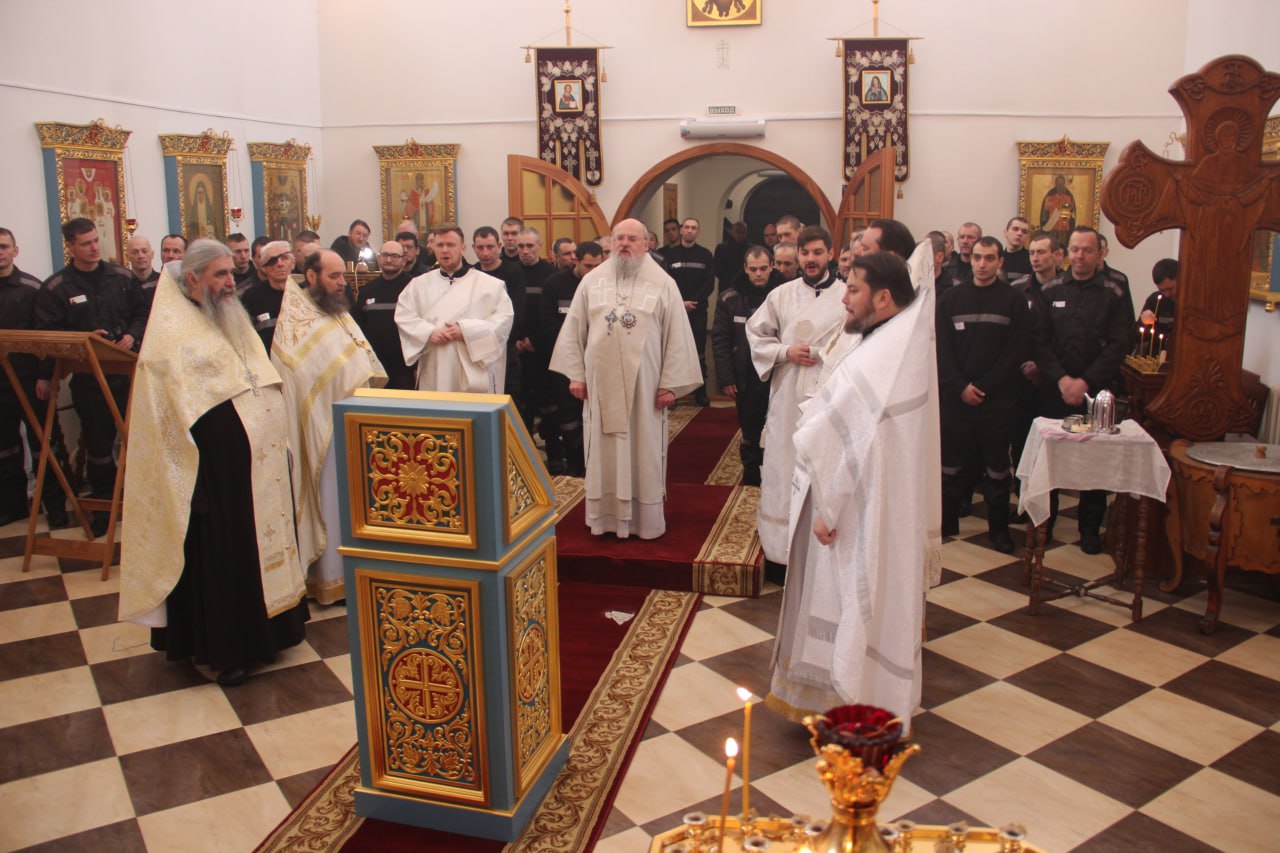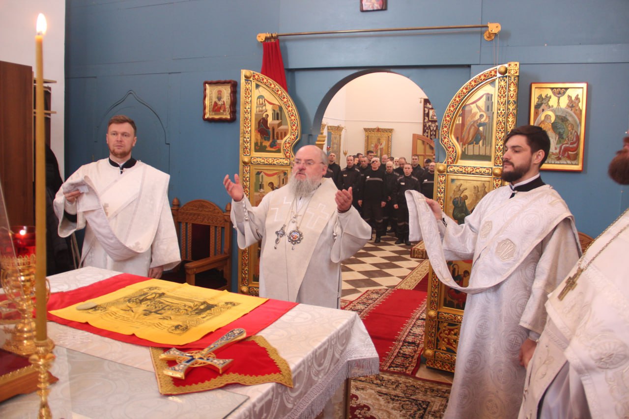 Архипастырю сослужили: протоиерей Дмитрий Сахаров – глава отдела по работе с исправительными учреждениями Козельской епархии, протоиерей Сергий Сычев, протоиерей Антоний Хатунцев, диакон Евгений Ковригин и  диакон Евгений Васильев, а также  иеромонах Силуан (Межинский) – насельник монастыря Оптина Пустынь, окормляющий осужденных.