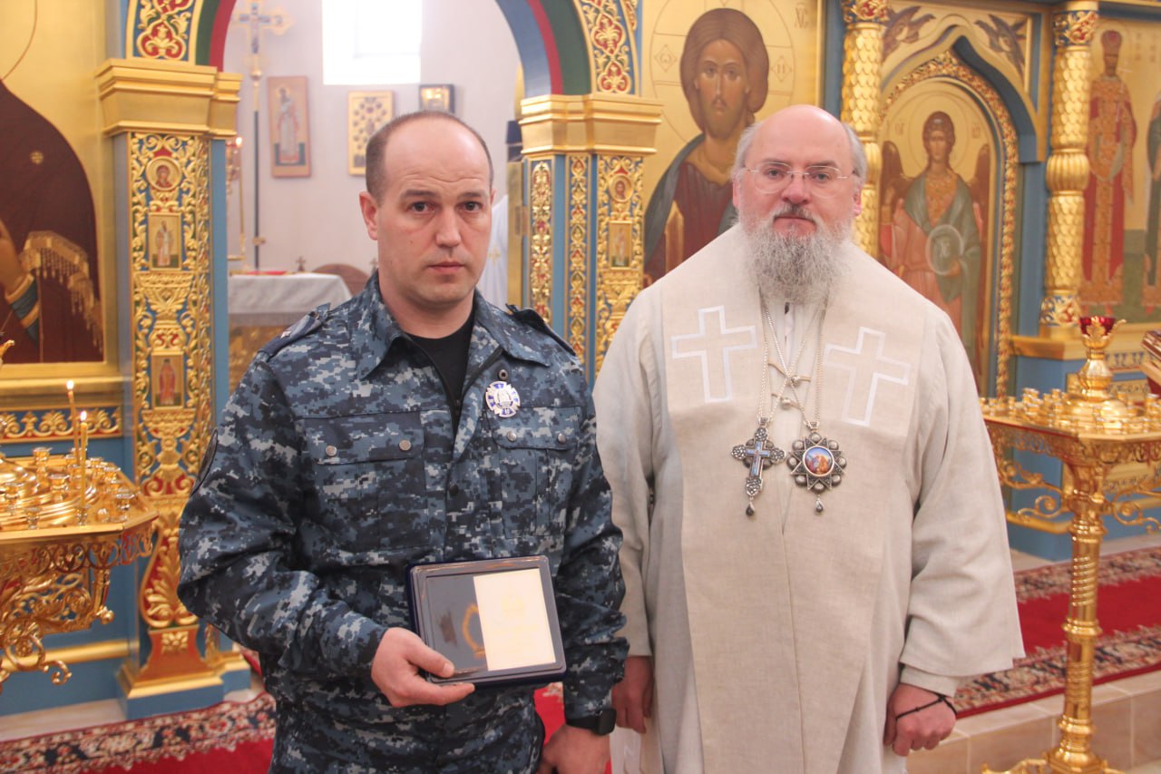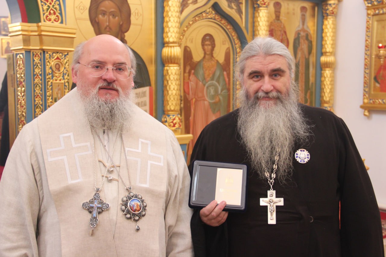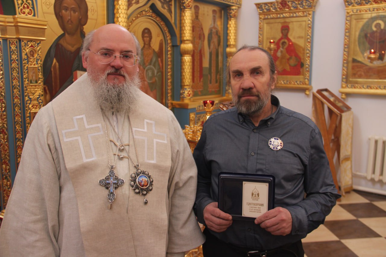 Архипастырь вручил юбилейные знаки «10-летия образования Козельской епархии» начальнику колонии майору Николаю Валерьевичу Лапшину, иеромонаху Силуану (Межинскому) и Александру Викторовичу Чумакову.