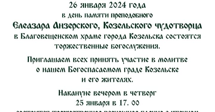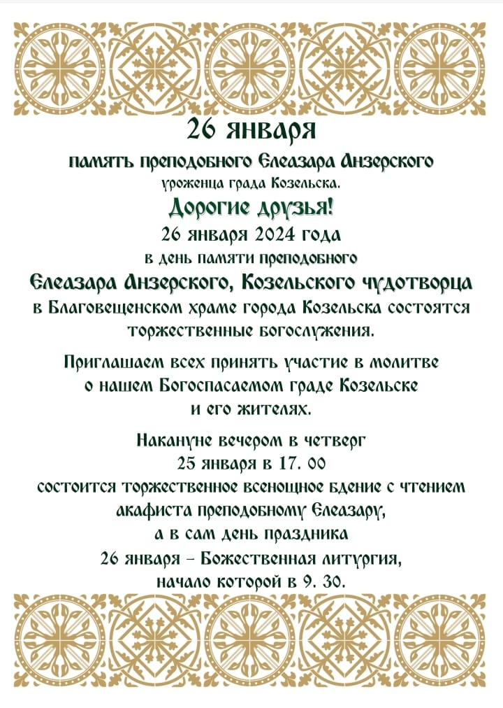 26 января 2024 года в день памяти преподобного Елеазара Анзерского, Козельского чудотворца  в Благовещенском храме города Козельска состоятся торжественные богослужения.