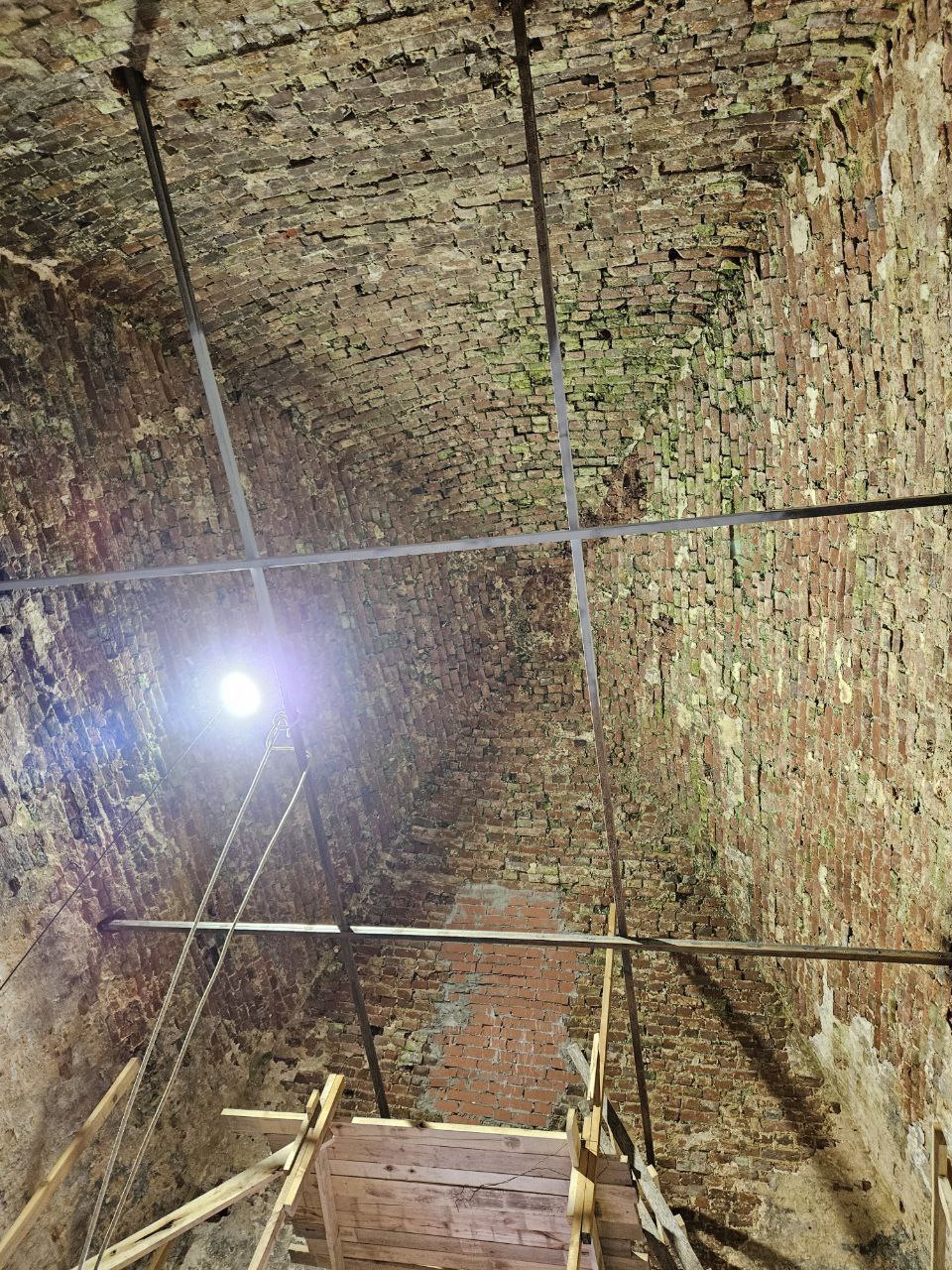 Также, одно из главных, что нужно было сделать, чтобы остановить разрушение храма — восстановить связи между сводами (железные перемычки под потолком храма — они не дают сводам разъехаться от нагрузки в разные стороны).