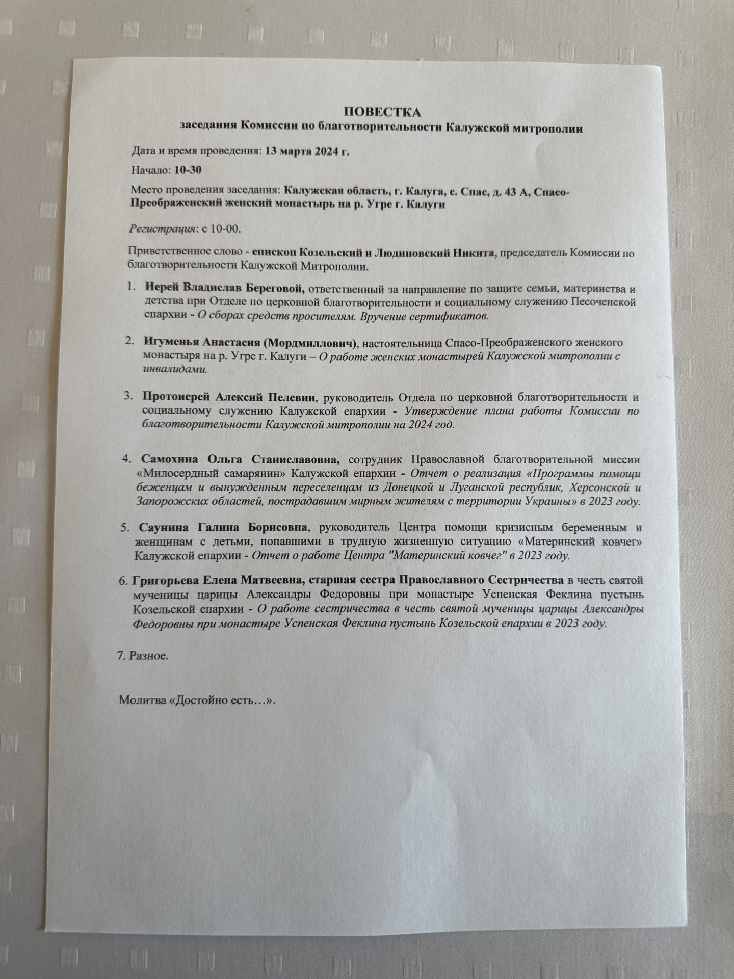 13 марта 2024 года в Спасо-Преображенском женском монастыре на реке Угре в городе Калуге, под председательством Преосвященнейшего Никиты, епископа Козельского и Людиновского, состоялось первое в 2024 г. заседание Комиссии по благотворительности Калужской митрополии.