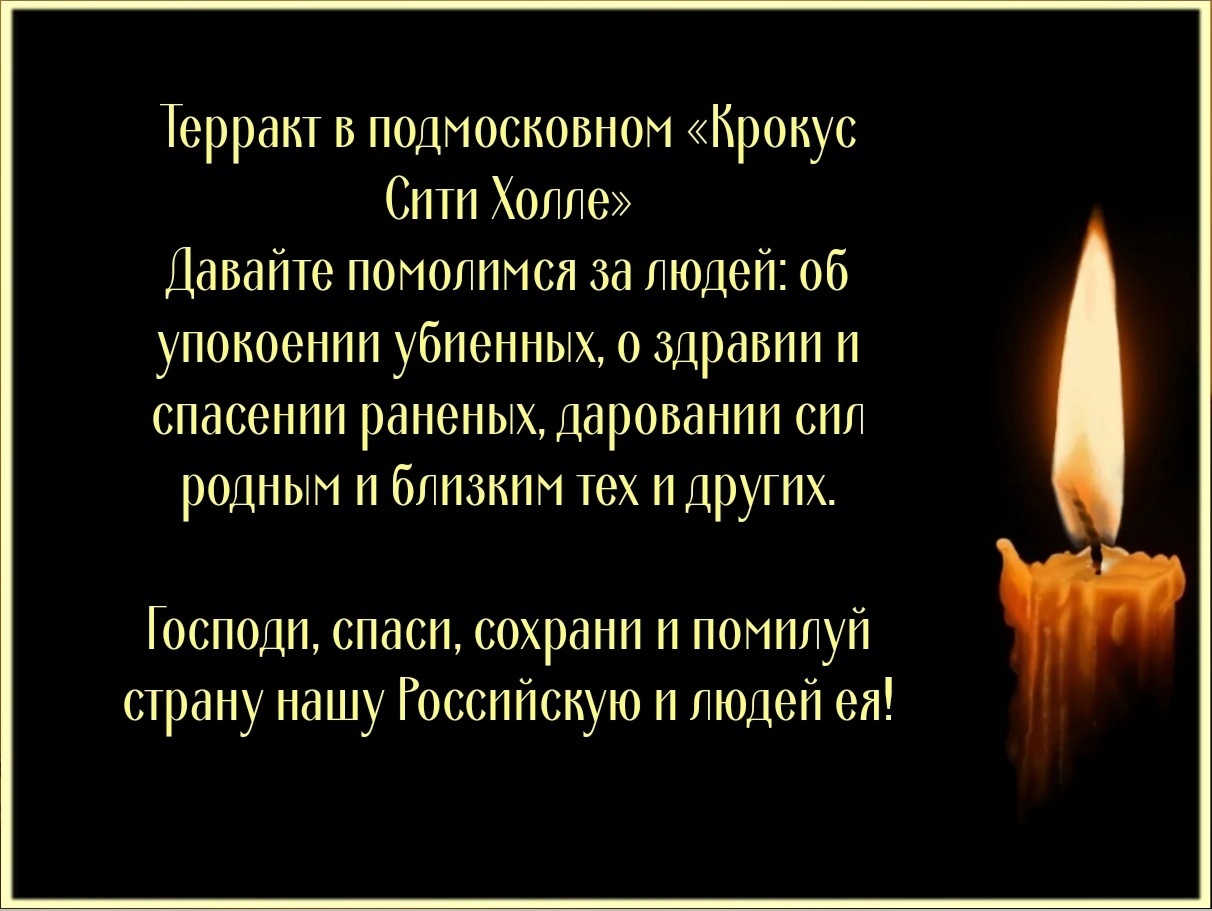 По благословению епископа Козельского и Людиновского Никиты  сегодня, 23 марта,  за богослужением во всех храмах Козельской епархии будет возноситься молитва о погибших в «Крокус сити холл» в Москве