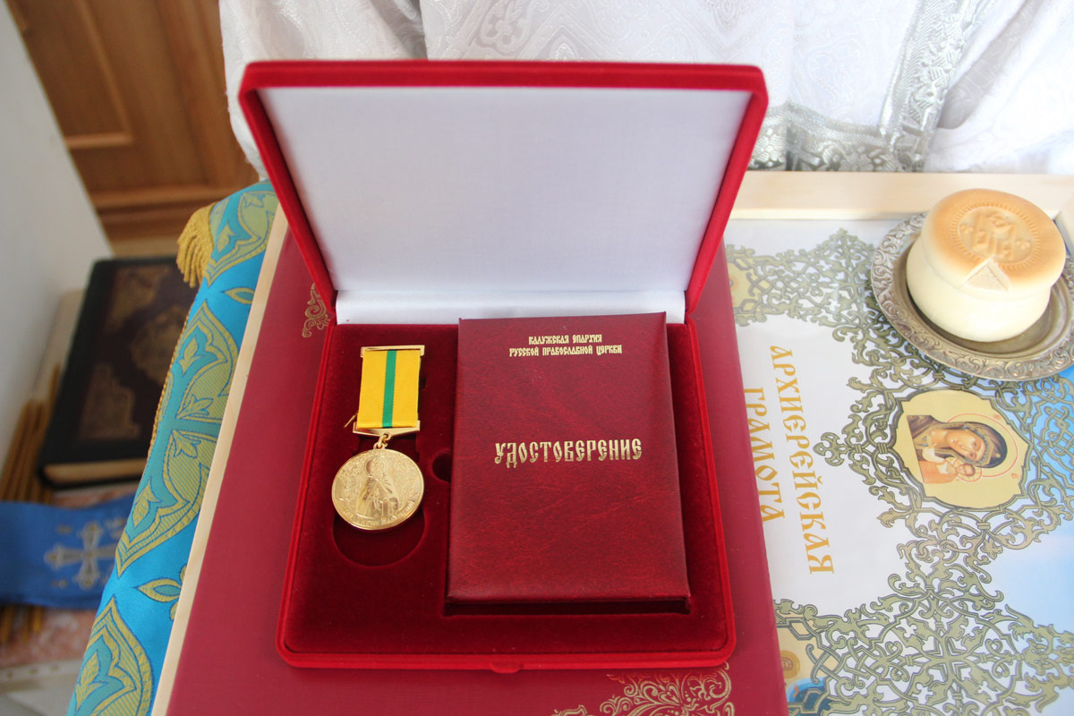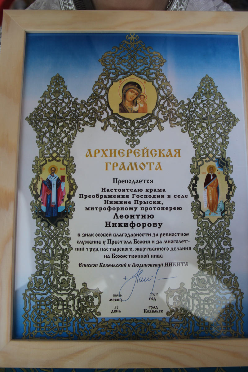 По окончании Литургии перед образом Богородицы и преподобного Леонтия, Владыка возглавил чин славления, после которого зачитал поздравительное письмо от митрополита Калужского и Боровского Климента. Затем епископ Никита лично поздравил юбиляра, отметив особые заслуги перед святой Церковью, и преподнес ему медаль Калужской митрополии Тихона Калужского I степени и Архиерейскую грамоту. В ответ отец настоятель поблагодарил всех за поздравление и теплые слова. После все были приглашены на обед, где батюшку поздравил благочинный Козельского района протоиерей Владимир Бахаев. На торжественном застолье был показан биографический фильм, подготовленный специально к юбилею настоятеля.