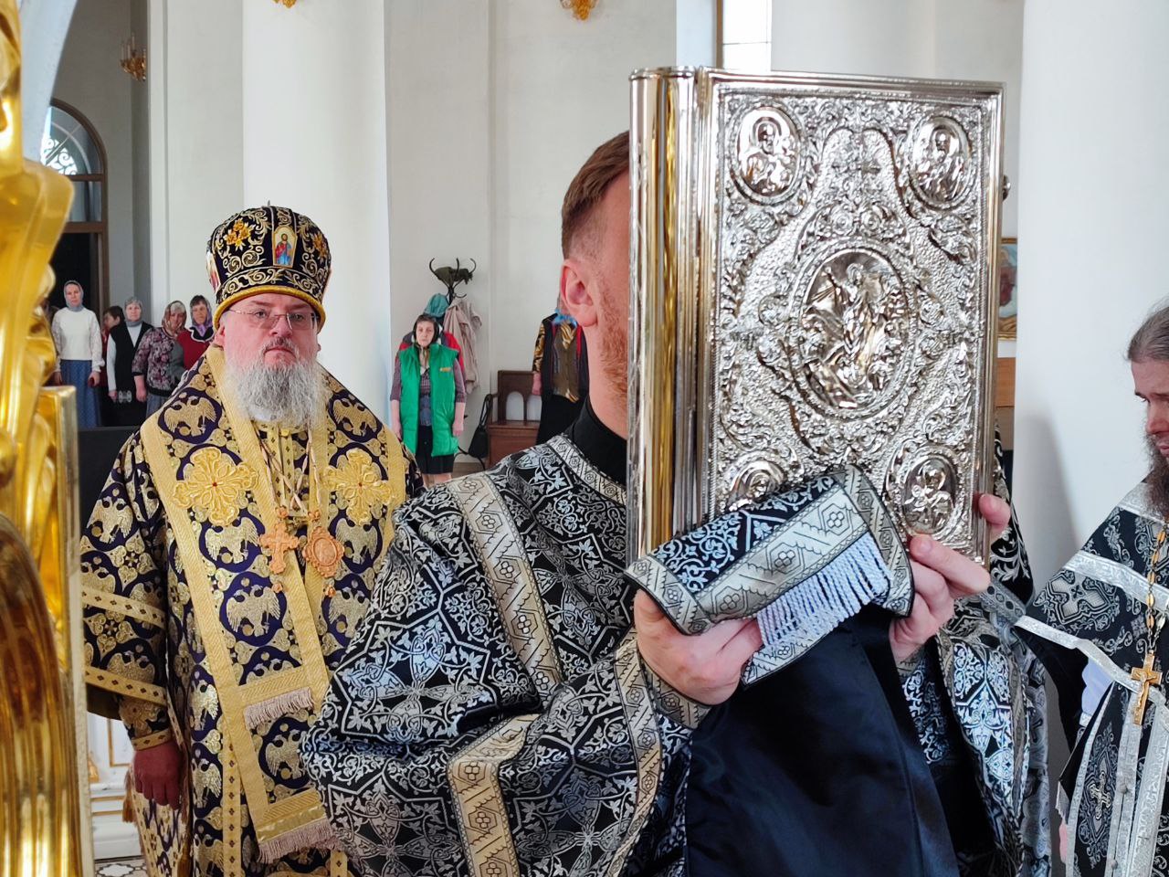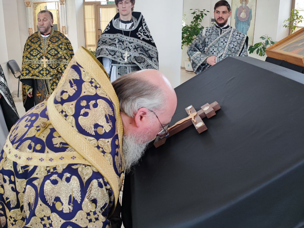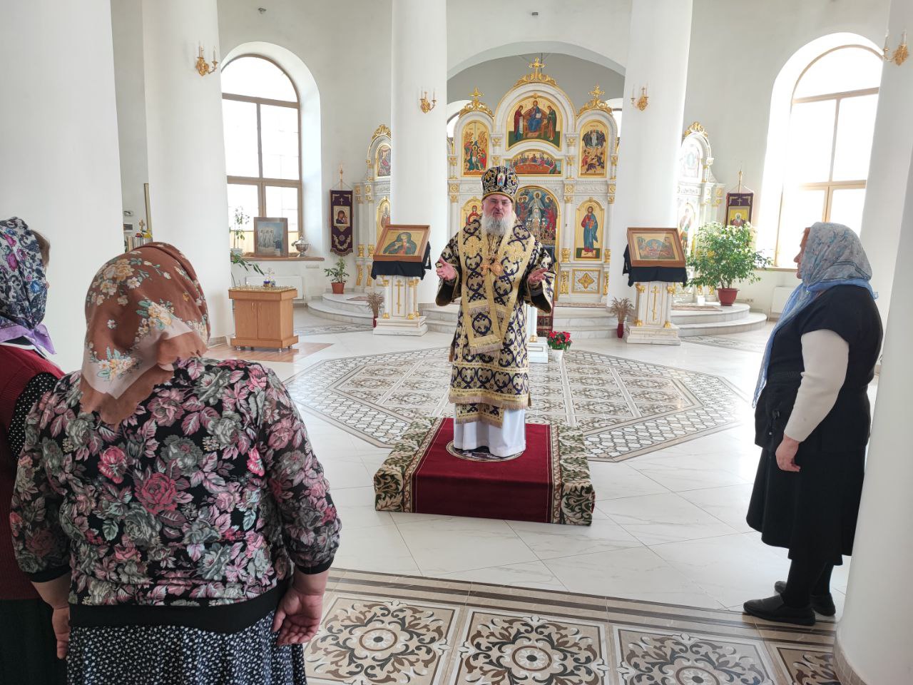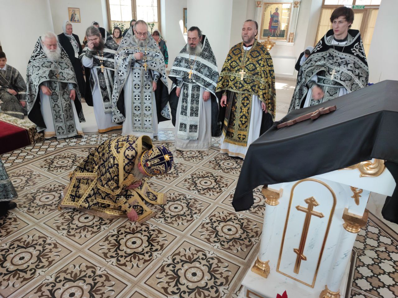 По отпусте литургии священнослужители совершили поклонение Кресту, а затем владыка обратился к богомольцам с архипастырским словом.