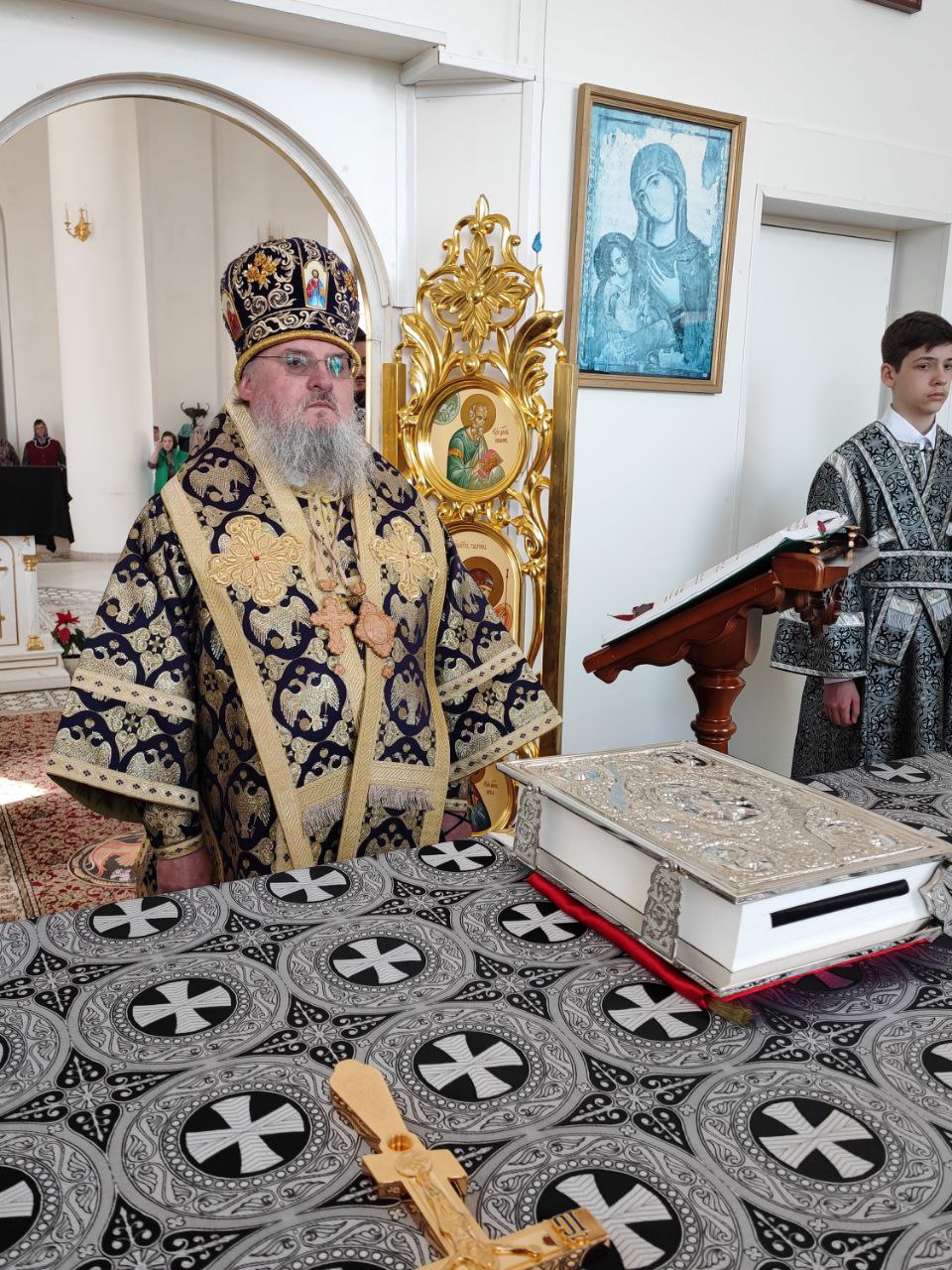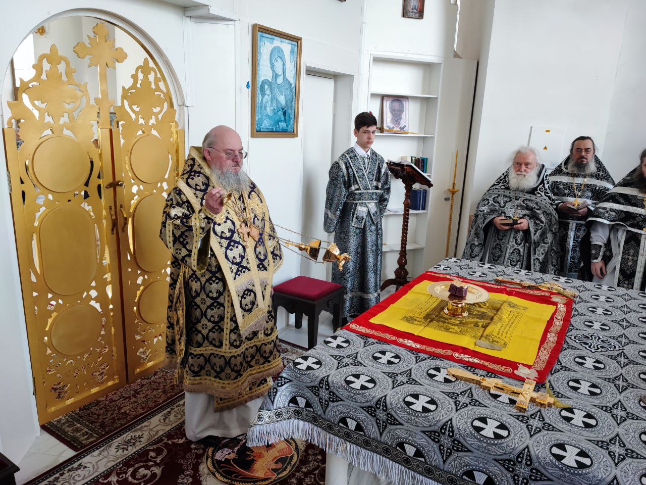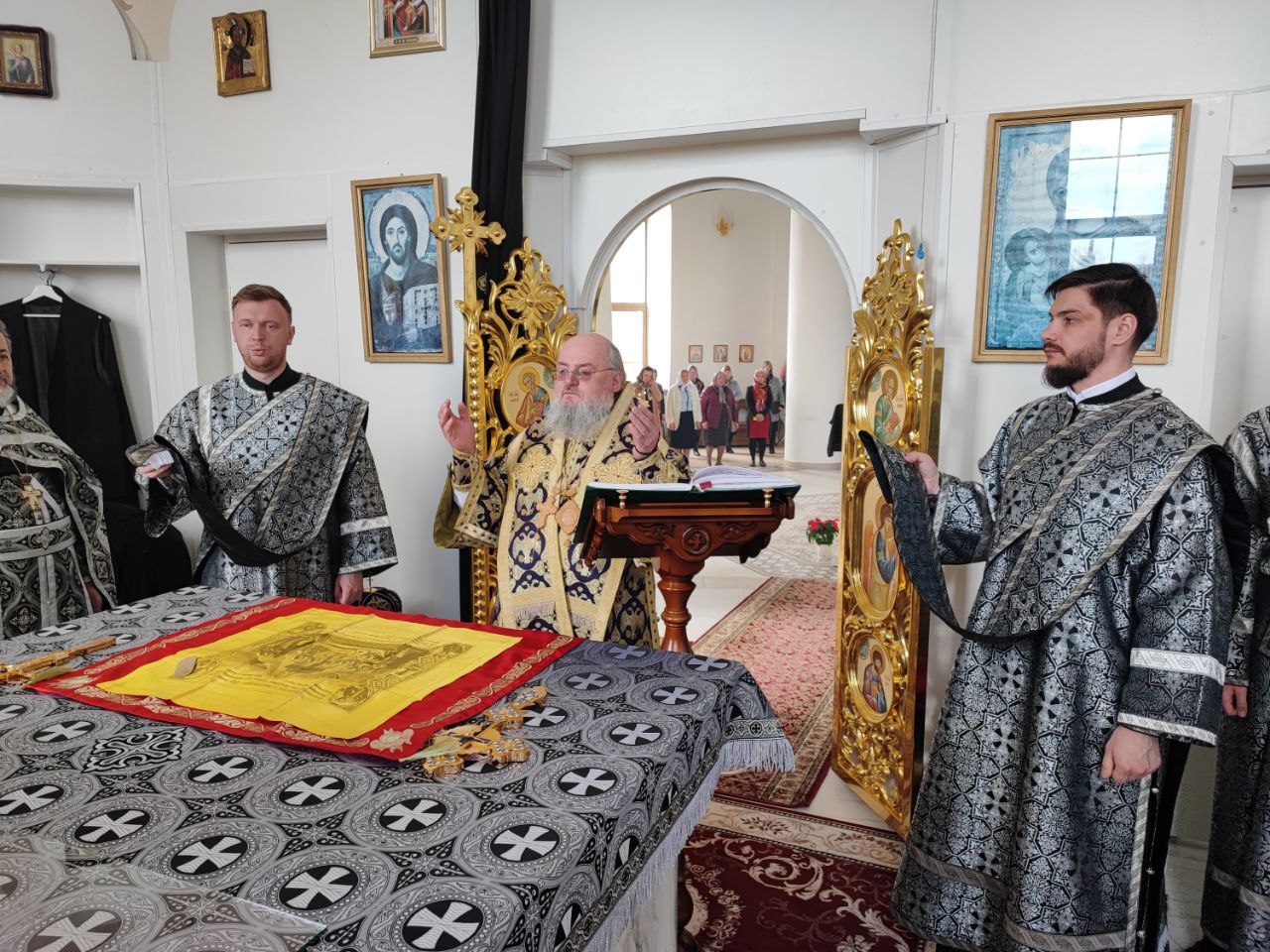 По отпусте литургии священнослужители совершили поклонение Кресту, а затем владыка обратился к богомольцам с архипастырским словом.