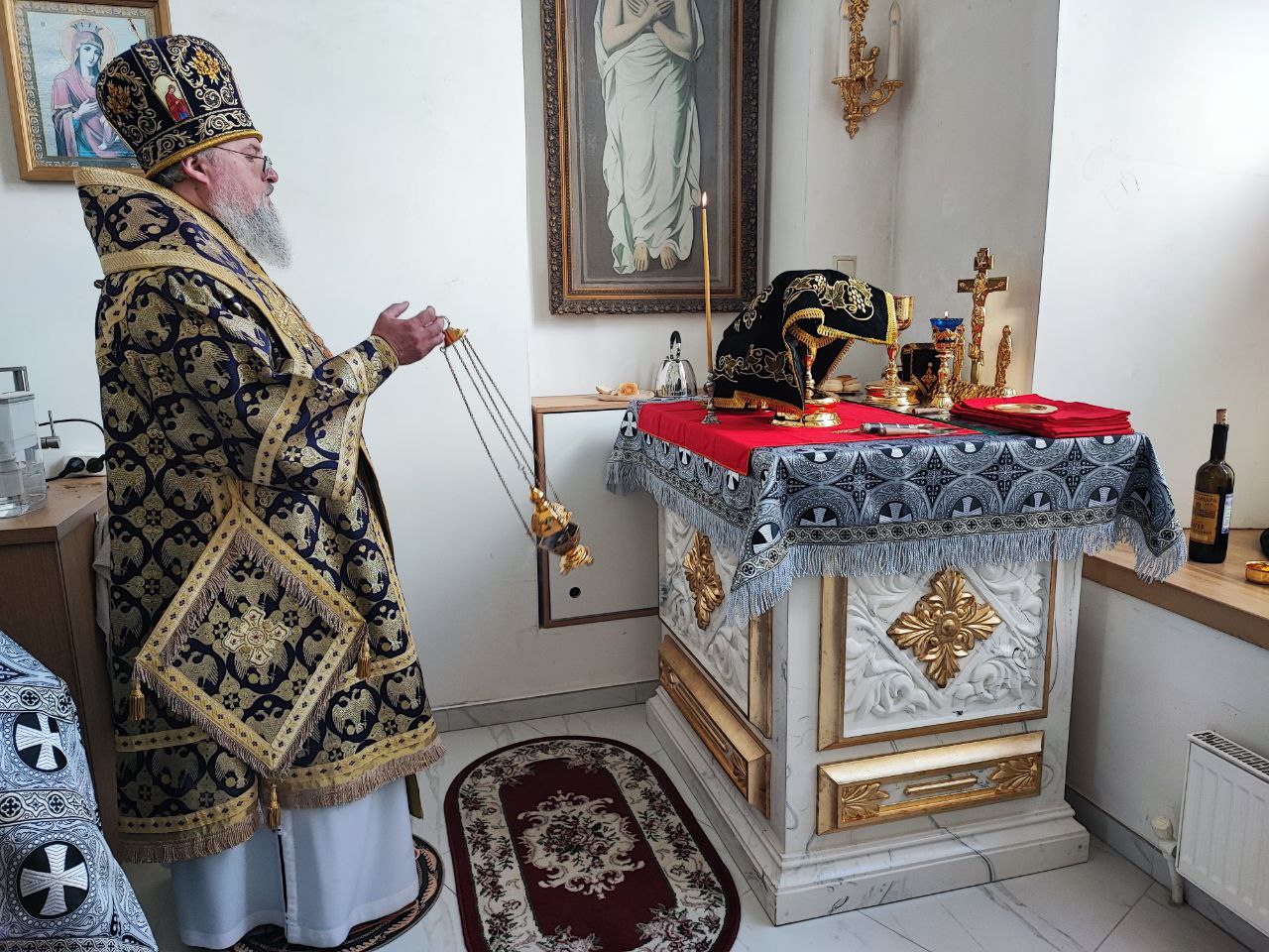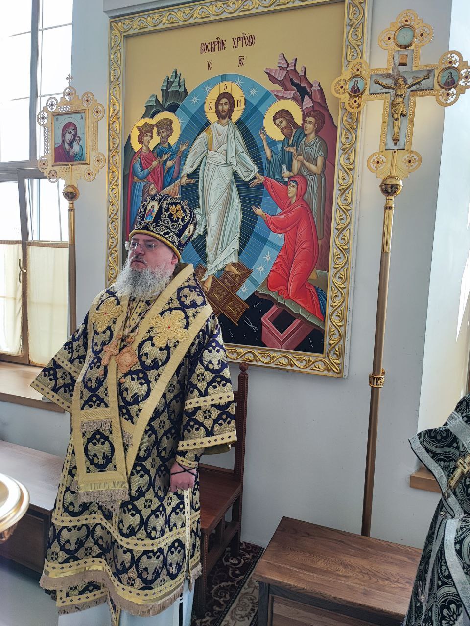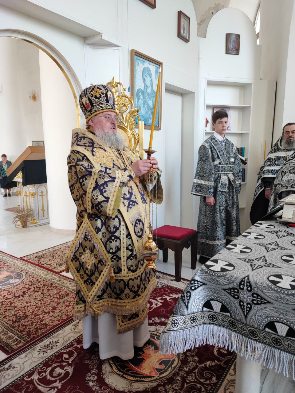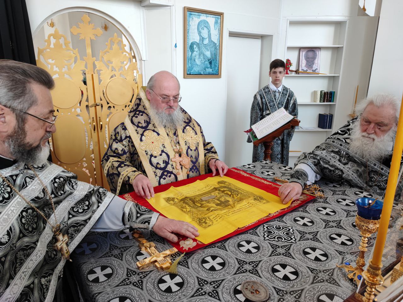 По отпусте литургии священнослужители совершили поклонение Кресту, а затем владыка обратился к богомольцам с архипастырским словом.