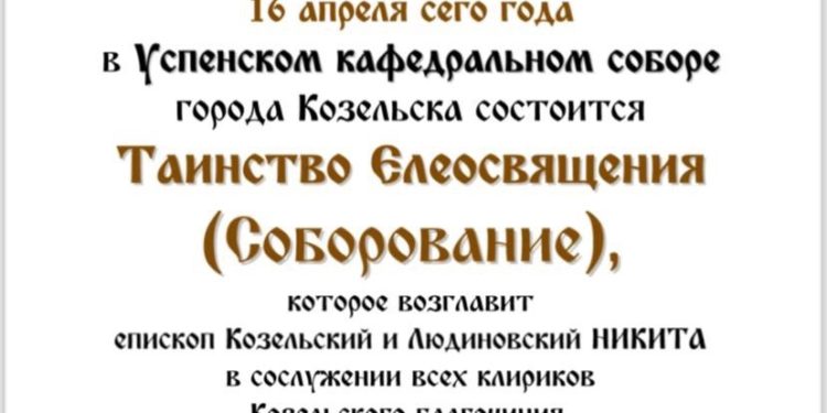 Дорогие братья и сестры! 16 апреля сего года в Успенском кафедральном соборе города Козельска состоится таинство Елеосвящения (СОБОРОВАНИЕ), которое возглавит епископ Козельский и Людиновский НИКИТА в сослужении всех клириков Козельского благочиния. Начало богослужения в 16.30.
