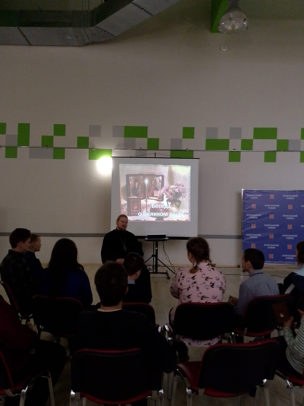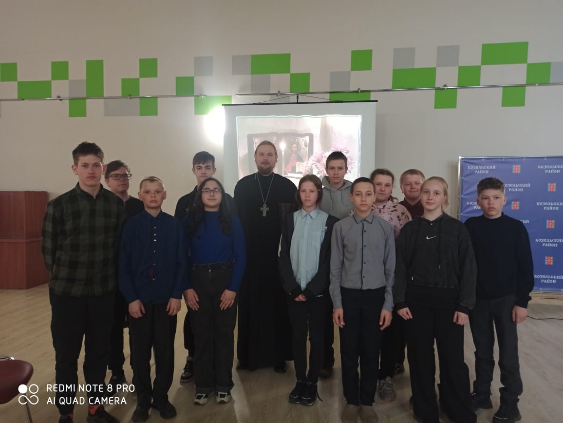 18 апреля, в дни  Великого поста, в Культурно-досуговом центре Козельского района состоялась встреча иерея Сергея Барыкина настоятеля храма в честь Благовещения Пресвятой Богородицы города Козельска с учащимися ГКОУКО Козельской школы-интерната. Духовно-нравственная беседа помогла детям расширить знания о Великом посте как «пути к Пасхе», одному из этапов ежегодного цикла: Масленица – Великий пост – Пасха, формирования отношения к Посту как времени очищения души и духовного роста.