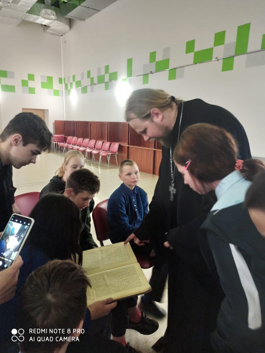В тёплой, непринуждённой обстановке дети задавали вопросы. Так же батюшка напомнил о стремлении быть добрыми, помогать и заботиться о близких. Кроме того у детей была возможность взять старинную книгу, которой около 200 лет, и потренироваться прочитать несколько строк на церковно- славянском языке.