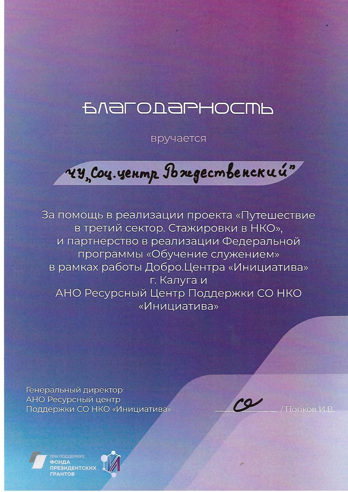 Директор Социального центра «Рождественский» участвовала в Совещании по развитию системы оказания социальных услуг населению в муниципальных образованиях Калужской области. Во встрече приняли участие руководители подразделений экономического блока и заинтересованные сотрудники администраций муниципальных районов и городских округов Калужской области, а также представители активных НКО региона. М. В. Куклиной была вручена Благодарность за помощь и участие «Рождественского» в проекте «Путешествие в третий сектор».