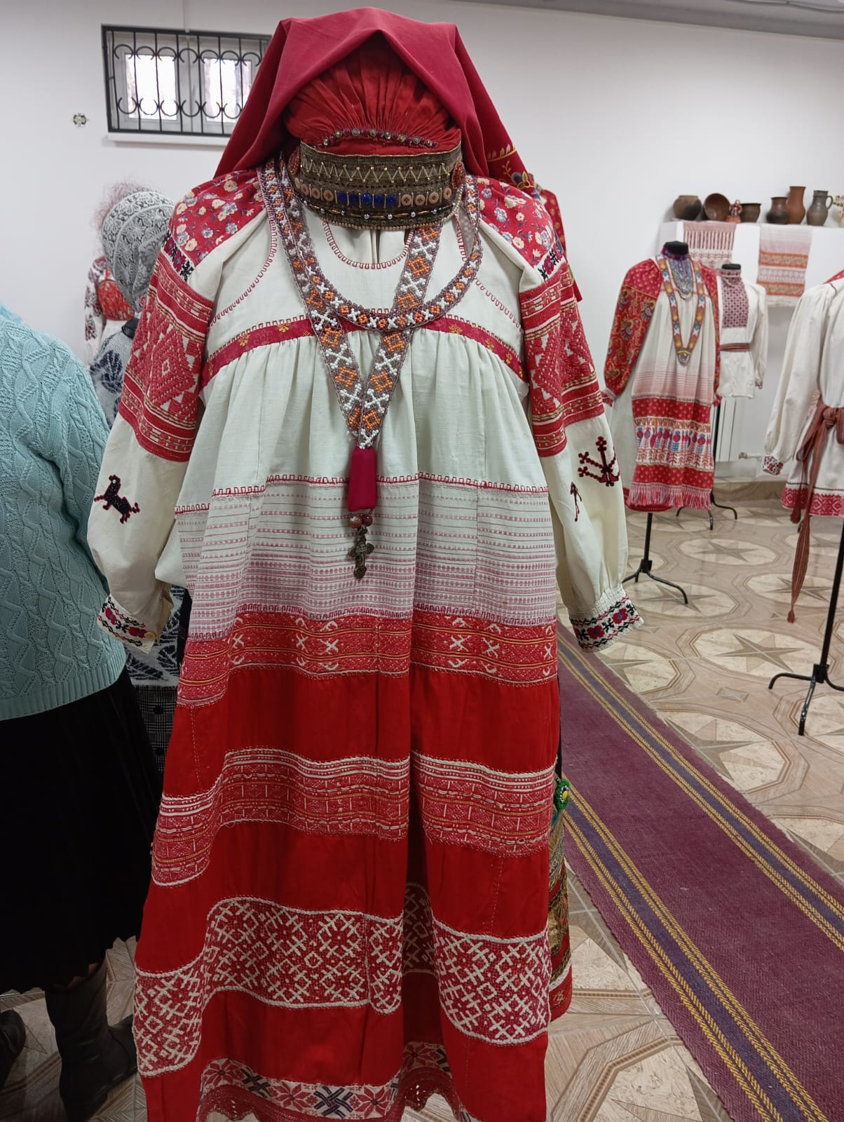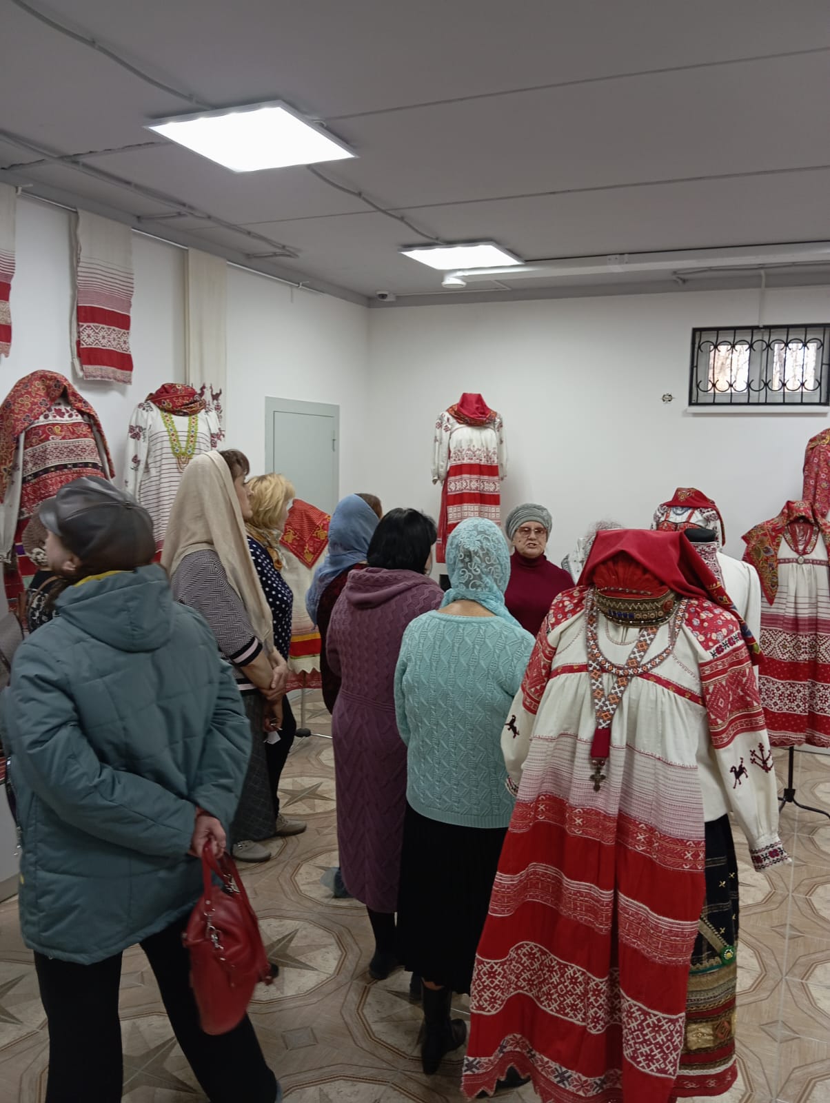 В цокольном этаже Воскресной школы Галина Федоровна с любовью оформила выставку народного костюма, где из фондов музея выставили порядка 30 повседневных и праздничных костюмов жителей деревень Чёрный Поток, Савино Людиновского района, а также самобытные костюмы деревень Кировского района прошлого столетия. Все они были бережно собраны настоятелем храма Казанской иконы Божией Матери протоиереем Алексием Жигановым. Большое место в экспозиции отвели расшитым рушникам, которыми украшали на праздник дом, подавали кушания, утирались и на которых держали хлеб-соль при благословении молодых брачующихся.