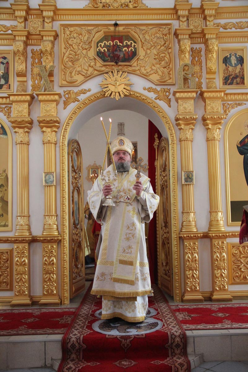 Архипастырю сослужили: иеромонах Паисий Курмаз, иеромонах Иеремия (Ильченко) – настоятель храма, иерей Артемий Арутюнян и диакон Тихон Худяков.