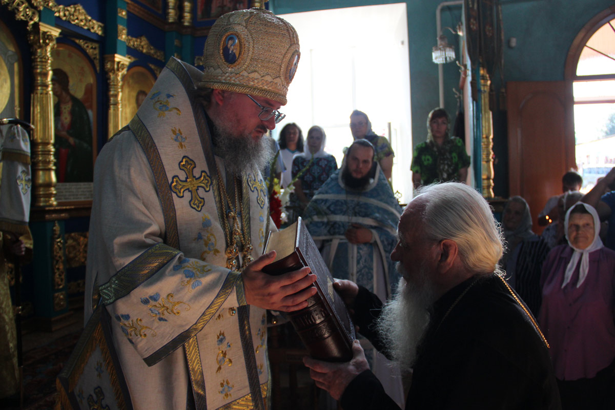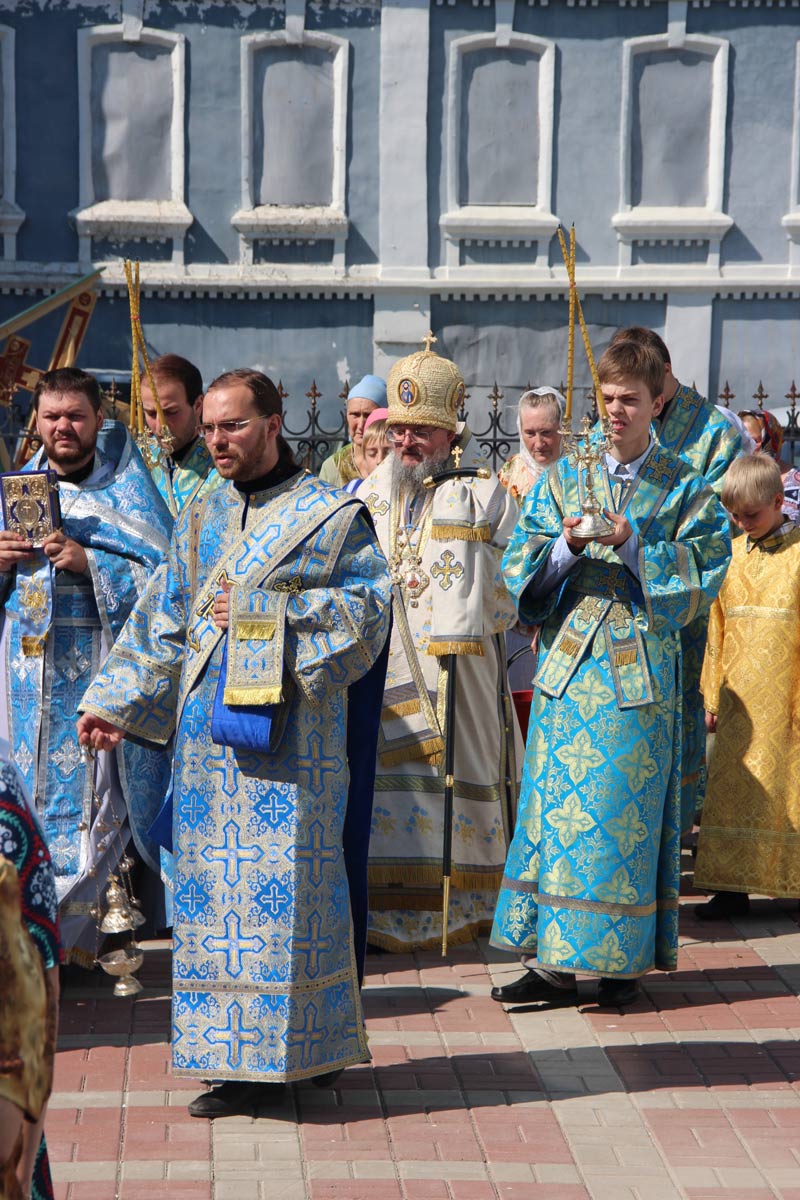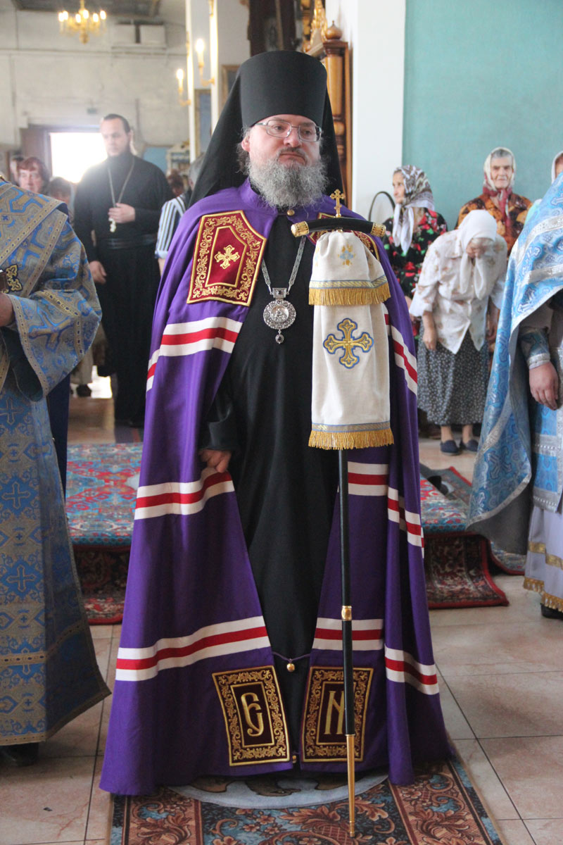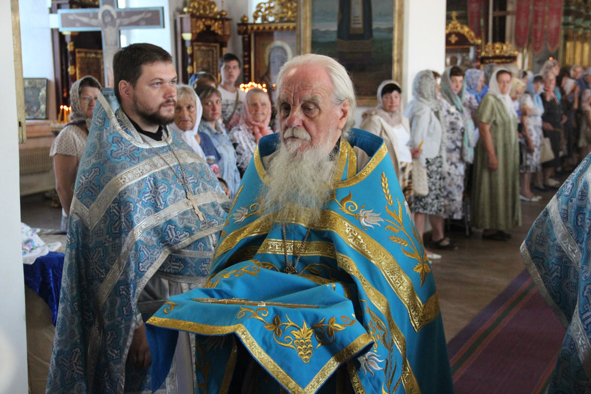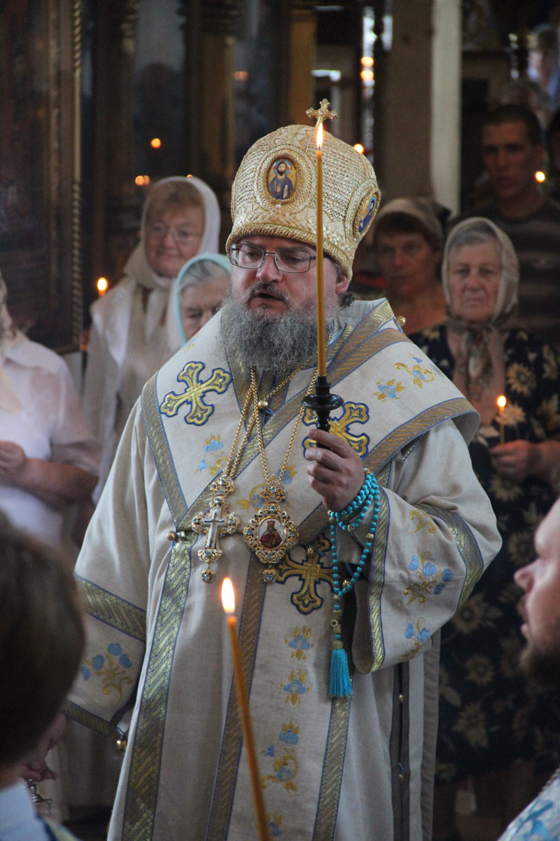 Архипастырю сослужили: почетный настоятель храма протоиерей Николай Казаков, настоятель храма, благочинный округа – протоиерей Алексий Казаков, иерей Степан Колбасин, иерей Антоний Демин, иеромонах Паисий (Курмаз) и диакон Тихон Худяков. После отпуста литургии священнослужители совершили праздничный молебен и крестный ход вокруг храма, в завершении которого, вознеся молитву ко Пресвятой Богородице, архипастырь обратился к богомольцам со словом назидания.