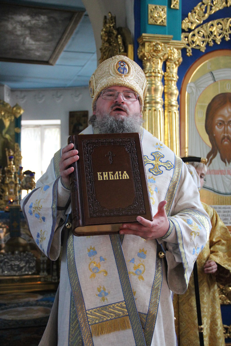 Владыка поздравил почетного настоятеля храма протоиерея Николая Казакова с юбилеем – восьмидесятипятилетием со дня рождения и преподнес ему подарочное издание Библии. Архипастырь также вручил памятное издание Священного Писания Нового Завета клирику храма – иерею Степану Колбасину, отмечающему двадцатипятилетний юбилей.