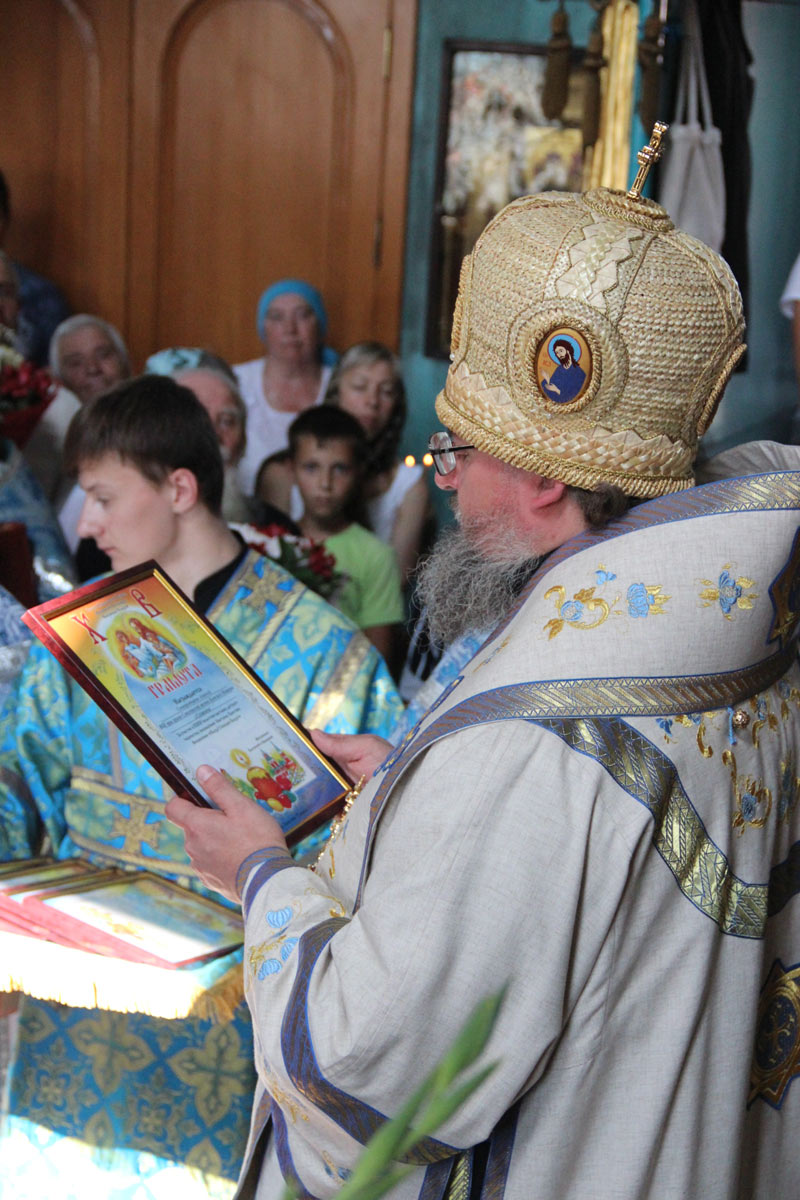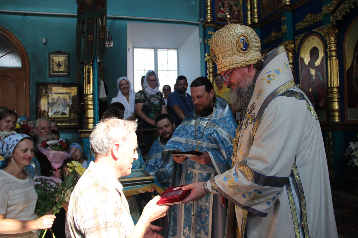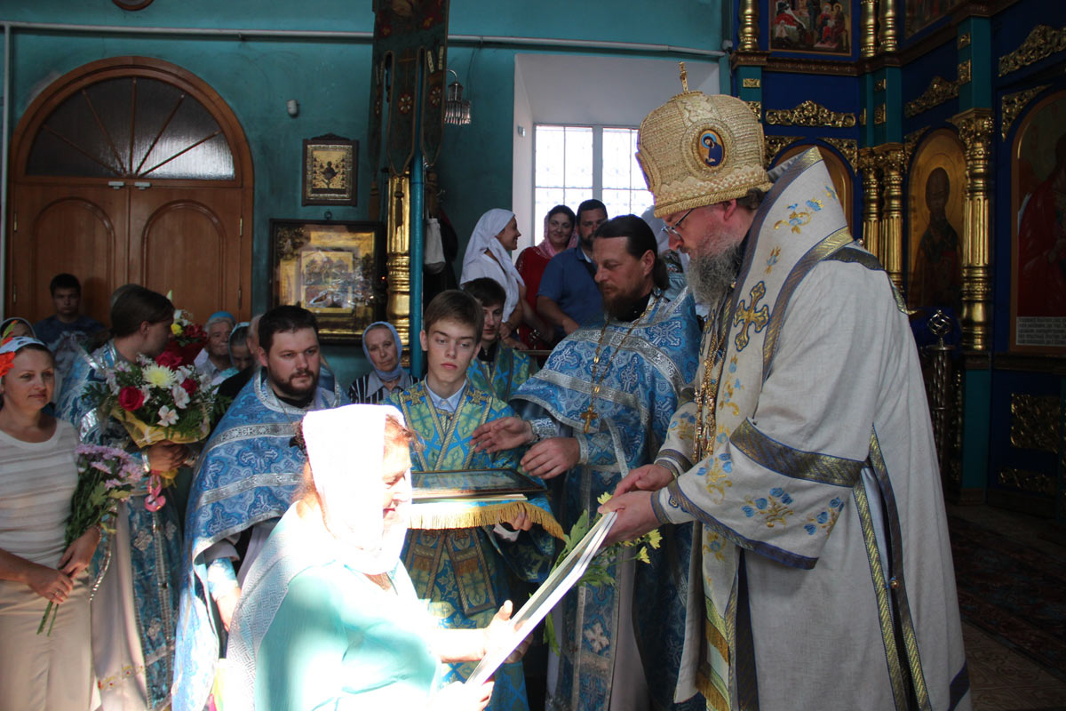 Владыка также поздравил и преподнес архиерейские благословенные грамоты прихожанам – юбилярам текущего года: Грудину Виктору Владимировичу; Панову Сергею Алексеевичу; Бушуевой Ларисе Николаевне; Танаки Евдокии Николаевне; Лешонковой Валентине Ефимовне; Соловьевой Лии Михайловне. Маленьким прихожанам храма, учащимся воскресной школы владыка вручил грамоты за участие в областной пасхальной выставке детского творчества и сладкие подарки.