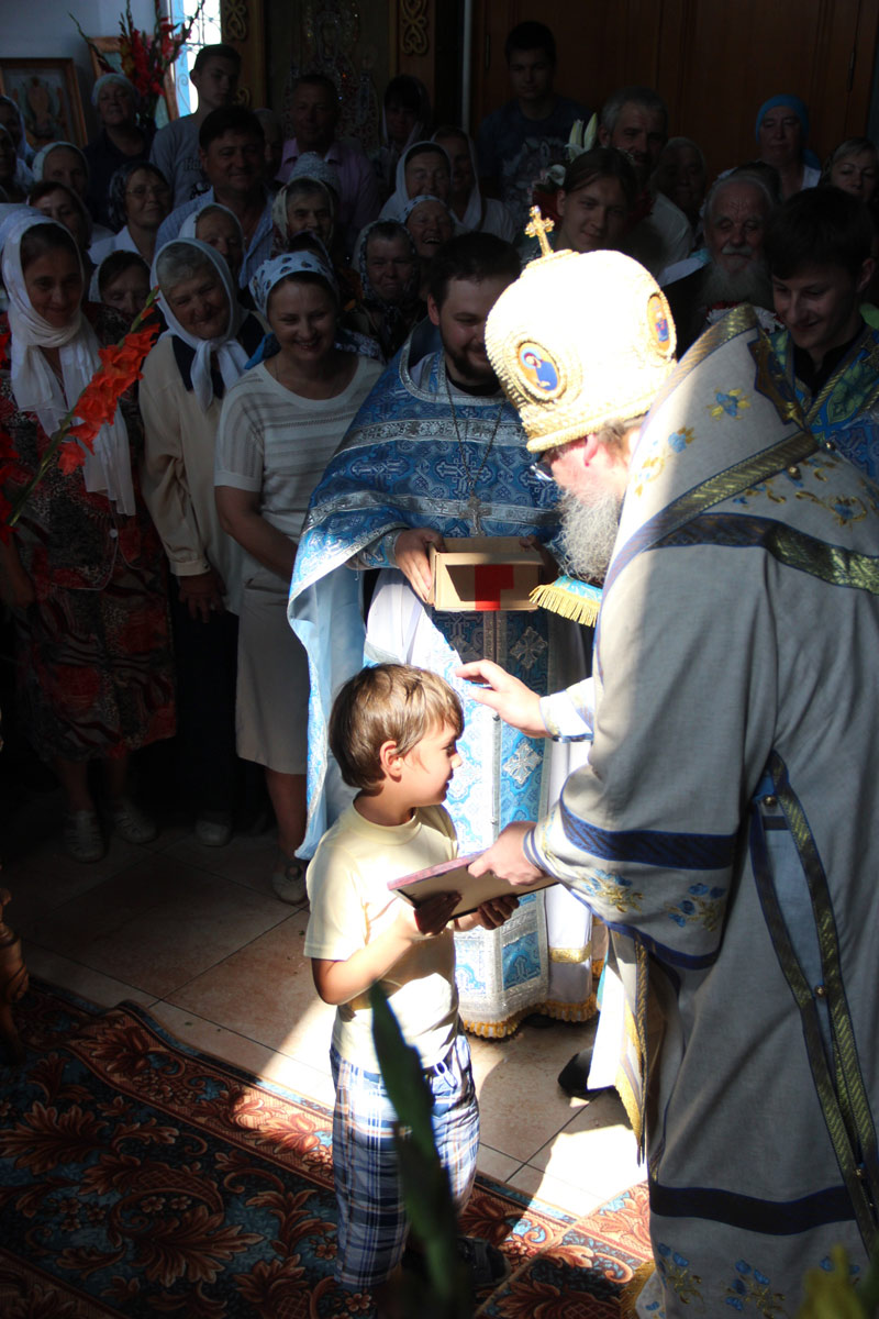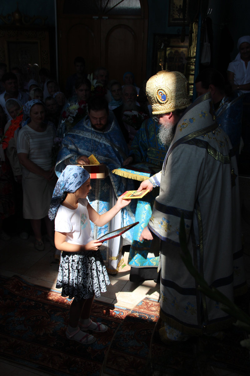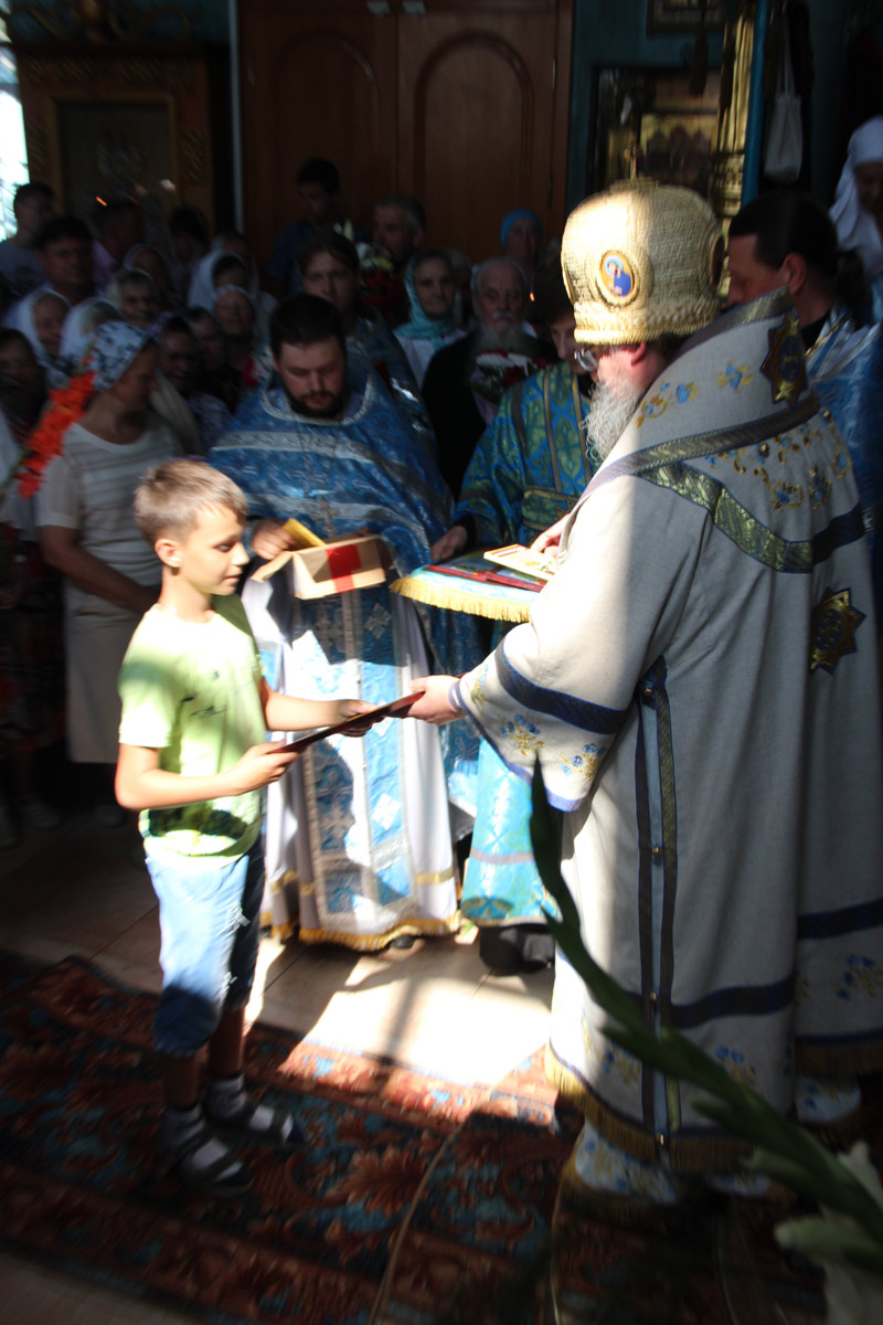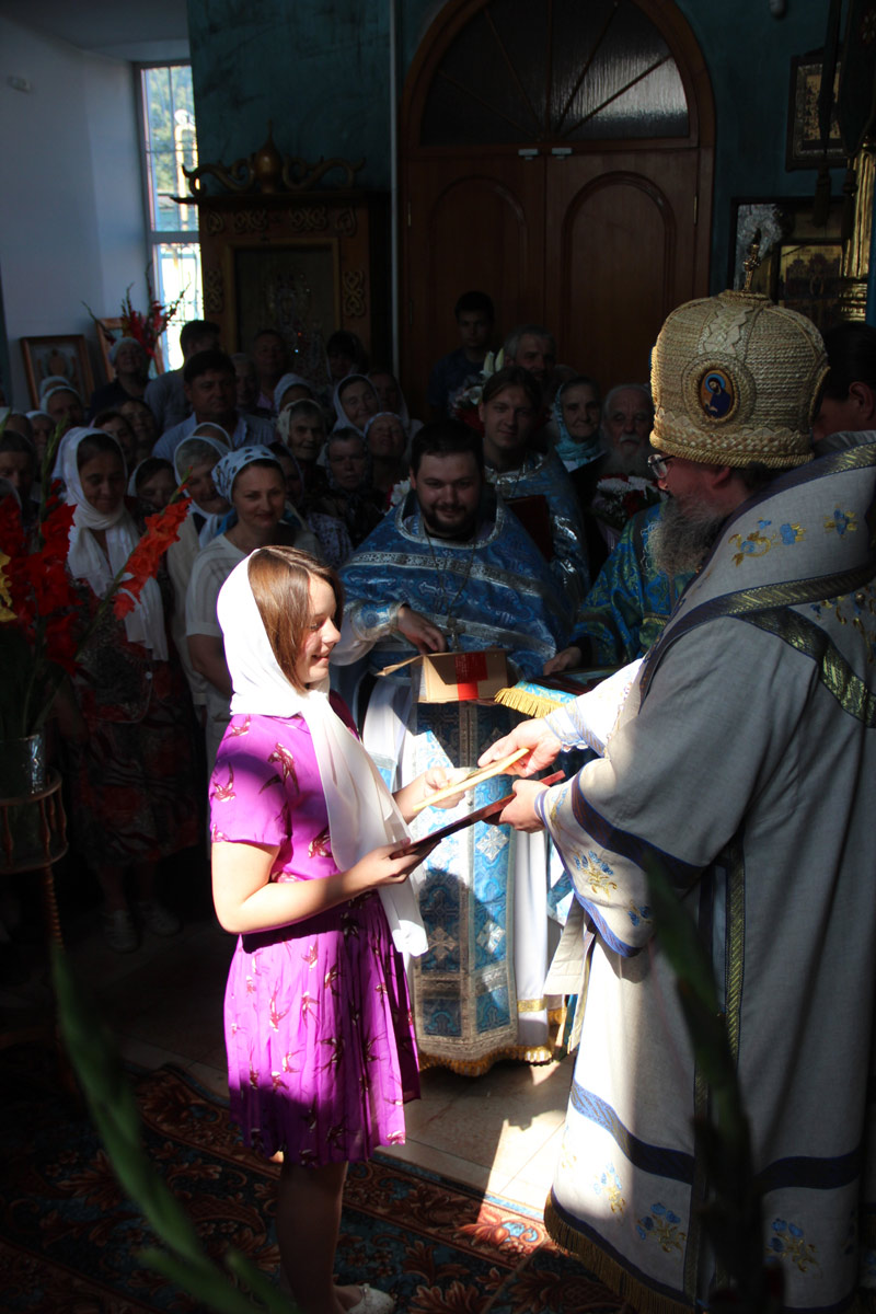 Владыка также поздравил и преподнес архиерейские благословенные грамоты прихожанам – юбилярам текущего года: Грудину Виктору Владимировичу; Панову Сергею Алексеевичу; Бушуевой Ларисе Николаевне; Танаки Евдокии Николаевне; Лешонковой Валентине Ефимовне; Соловьевой Лии Михайловне. Маленьким прихожанам храма, учащимся воскресной школы владыка вручил грамоты за участие в областной пасхальной выставке детского творчества и сладкие подарки.