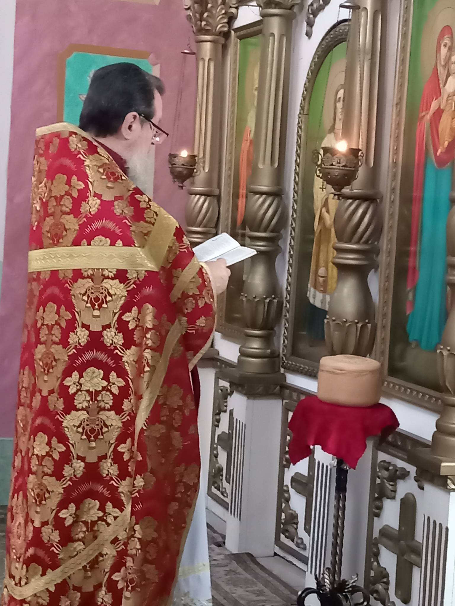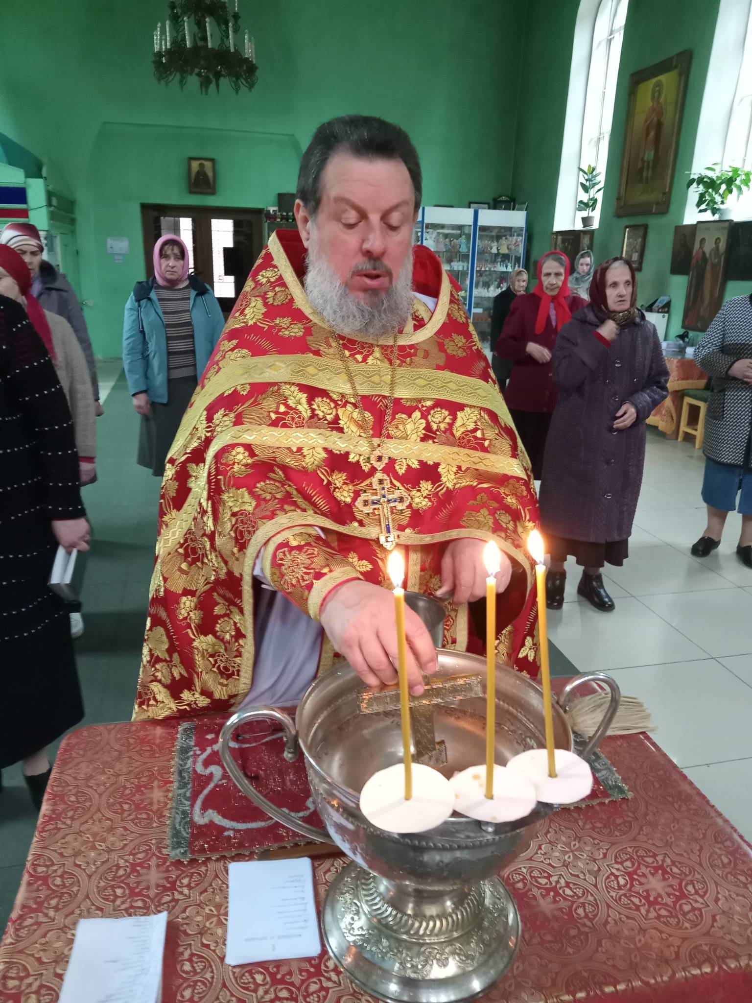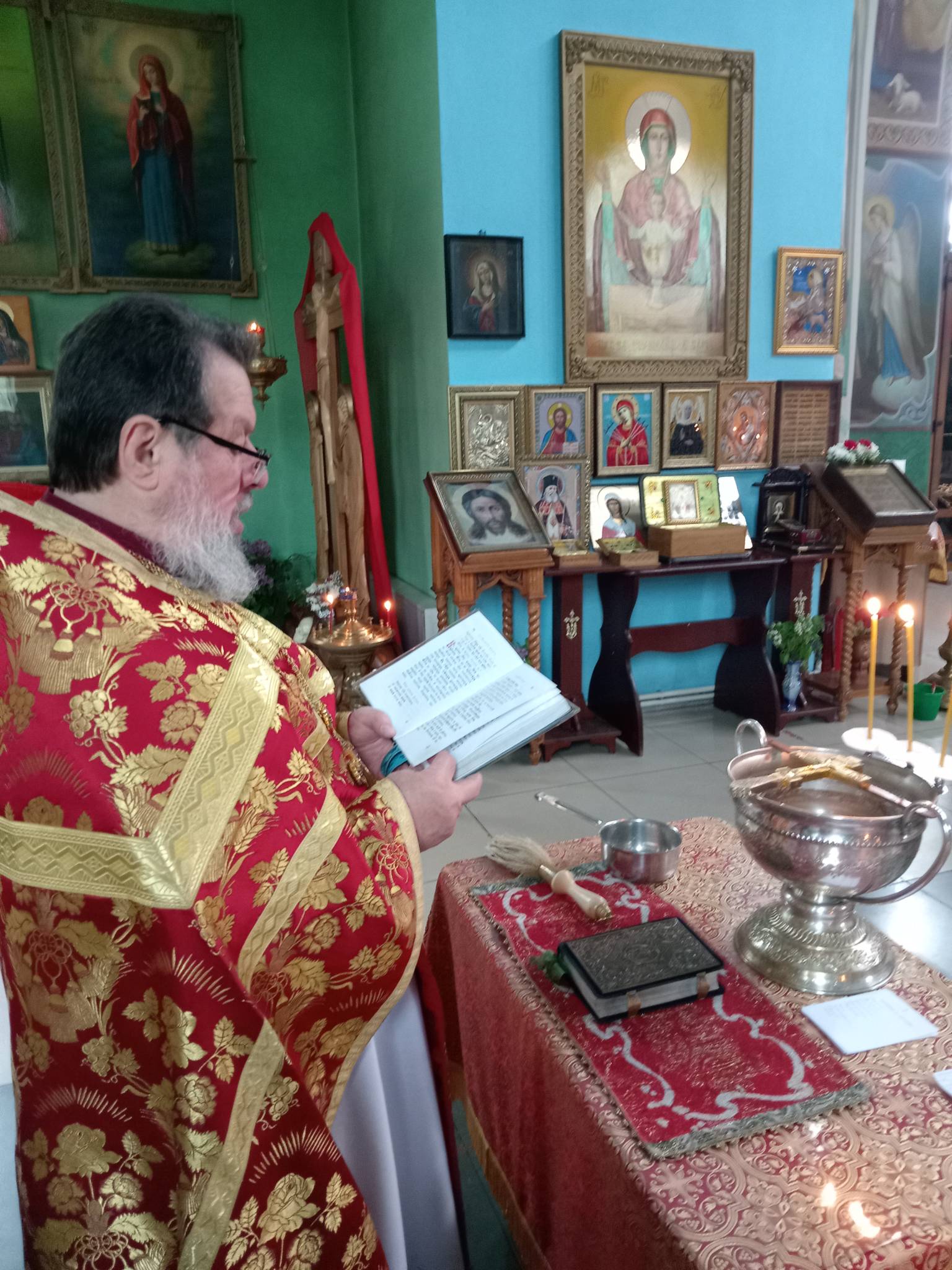 В Светлую пятницу, когда совершается празднование иконы Божией Матери «Живоносный Источник», после Литургии батюшка совершил малый чин освящения воды.