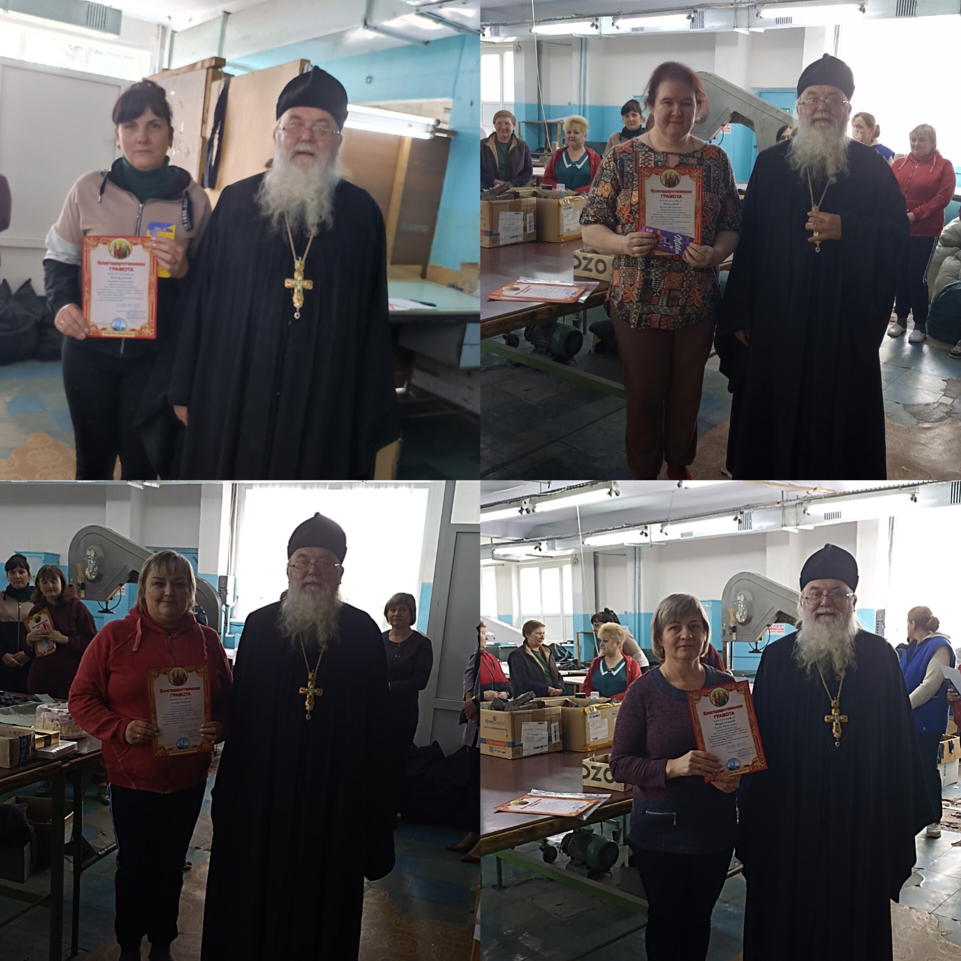 Настоятель поблагодарил всех тружениц Людиновской швейной фабрики за их участие в общем и нужном деле по плетению маскировочных сетей для наших воинов в зоне СВО, вручив благодарственные грамоты за их труды и шоколадки, поздравил женщин с предстоящим праздником — Днём Жен Мироносиц и рассказал о значении этого праздника.