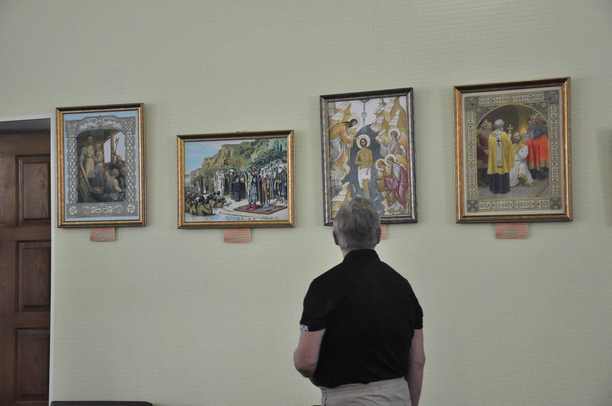 Выставка, включающая в себя иконы и репродукции картин, находится в Кинотеатре города Жиздры. Открыл выставку приветственным словом и небольшой экскурсией для собравшихся клирик Свято-Покровского храма иерей Алексей Ефименков, который рассказал слушателям о жизни святого князя Владимира, о важности выбора веры и ее сохранения. После открытия все были приглашены в зал, где был показана серия короткометражных фильмов о святом князе Владимире из цикла «Повесть временных лет».