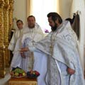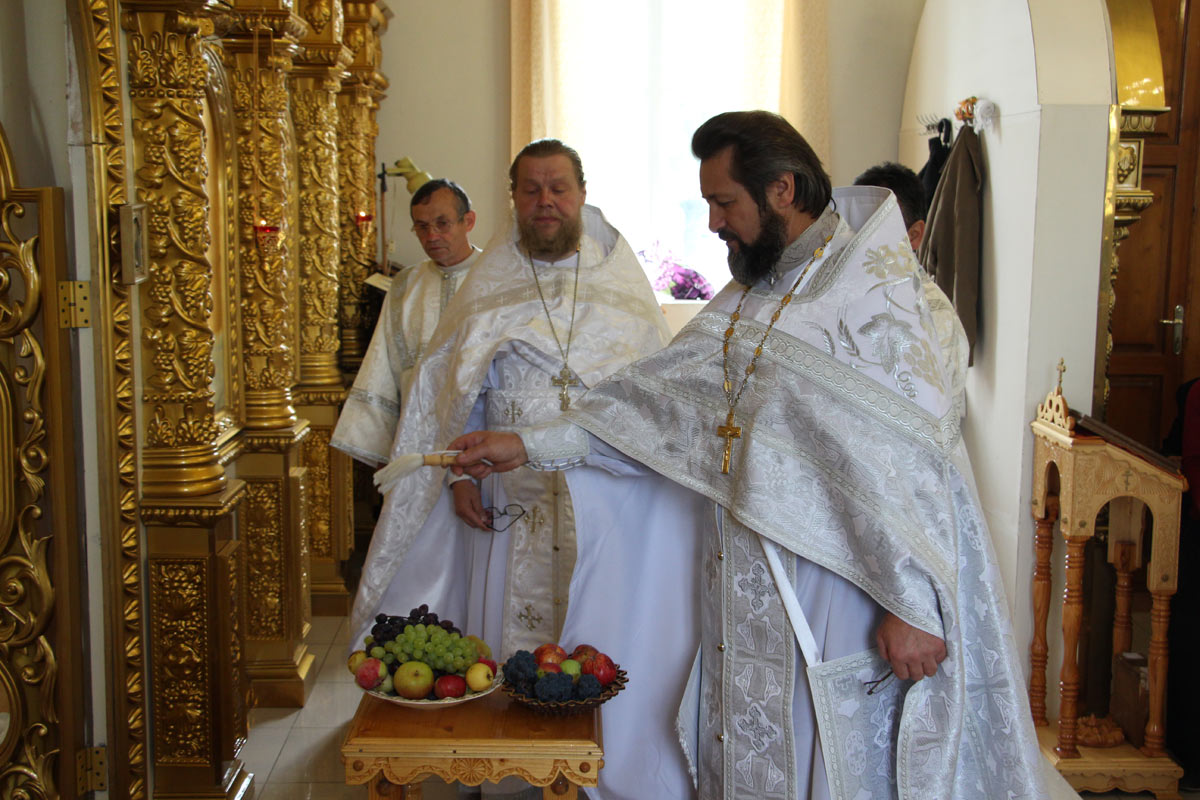 В праздник Преображения Господня в храме Космы и Дамиана п. Думиничи, Божественную литургию и уставное освящение плодов, совершил благочинный третьего округа, протоиерей Иоанн Староста в сослужении иеромонаха Никона Харькова.