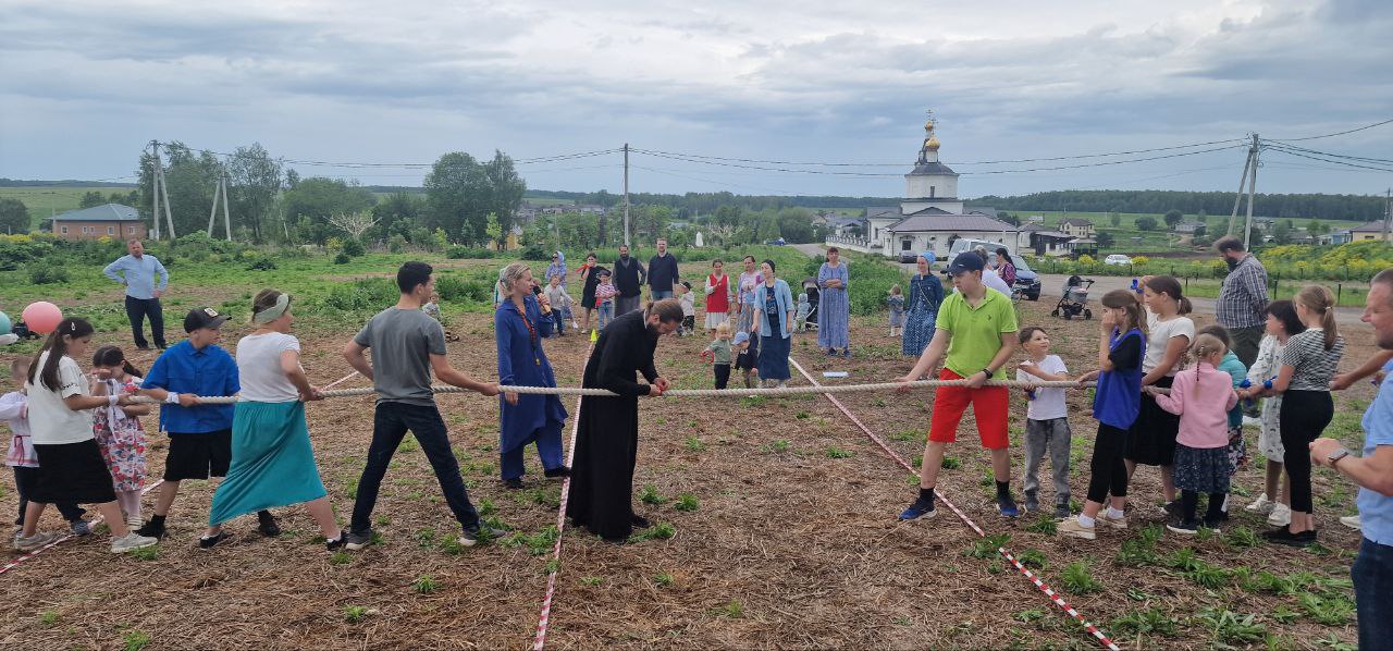 Далее праздничные мероприятия развернулись на импровизированном спортивном поле перед храмом, где сначала участники под руководством тренера Елены провели разминку, затем приступили к спортивным соревнованиям — Весёлым стартам.