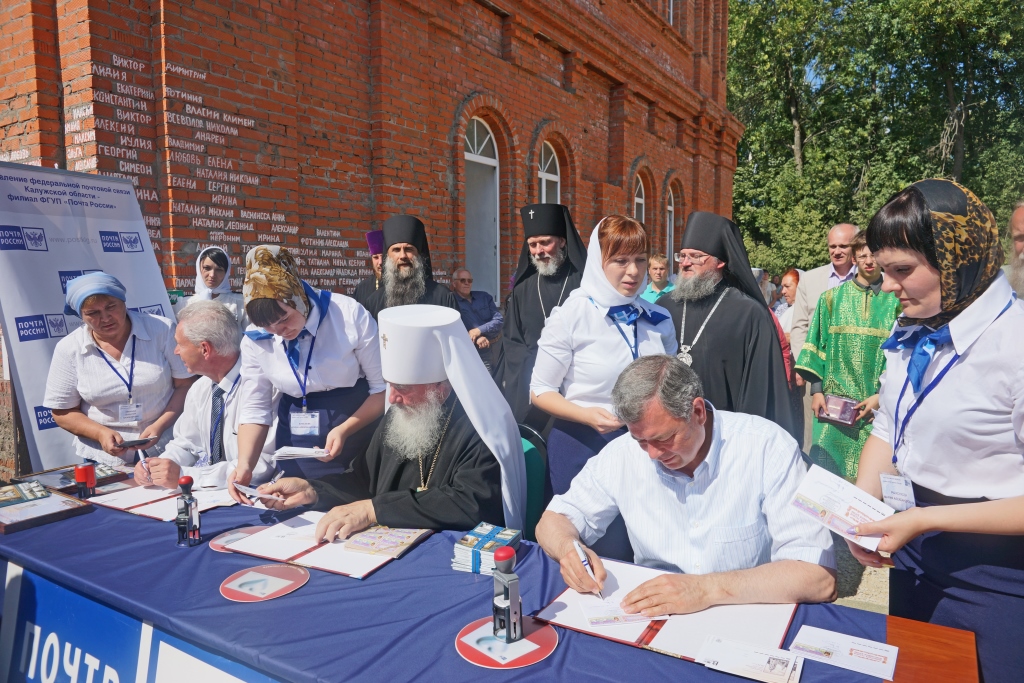 Затем состоялось специальное гашение марок, посвященных 500-летию Калужского Свято-Лаврентьева монастыря. В торжественной церемонии приняли участие, временно исполняющий обязанности губернатора Калужской области Анатолий Дмитриевич Артамонов и митрополит Калужский и Боровский Климент.