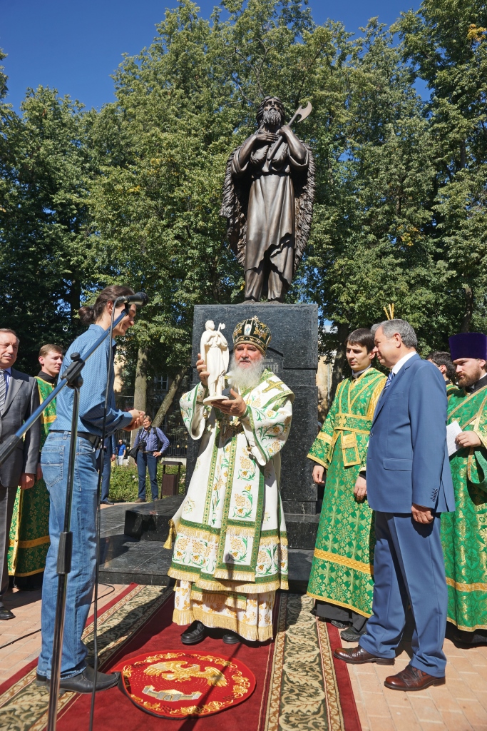 С инициативой поставить памятник выступила Калужская митрополия. Фигура памятника отлита из бронзы высотой более 3 метров. Скульптором и автором данного памятника является Алексей Леонов.