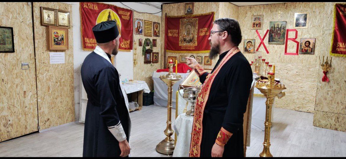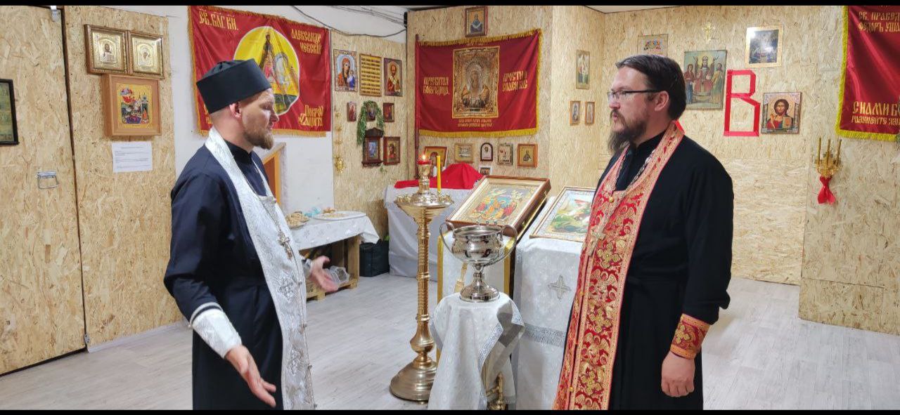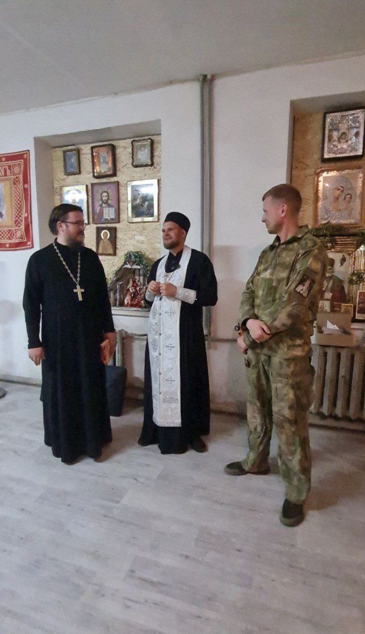 Иерей Дионисий совместно с настоятелем походного храма отцом Алексеем Барышевым отслужили благодарственный молебен. Отец Алексий провел экскурсию по храму, рассказал о святынях и особо чтимых иконах, находящихся в нём. В дальнейшем батюшка с бойцами познакомил гостей с тем, как живут военнослужащие.