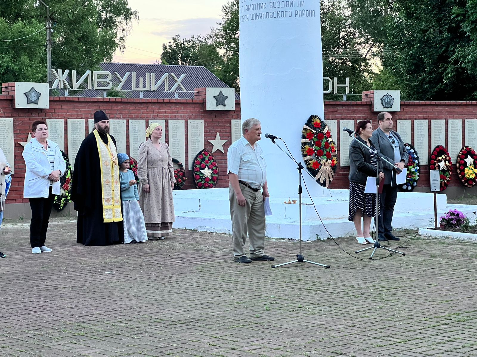 21 июня на мемориале в селе Ульяново прошла акция памяти начала Великой Отечественной Войны 1941- 1945 годов. На митинге, проведённом работниками районного Досугова Центра, выступил директор музея Азаров Геннадий Сергеевич. Он рассказал о том, как проходили первые дни войны в районе. Благочинный Ульяновского благочиния протоиерей Максим Садовников совершил заупокойную литию по погибшим воинам и всем во время Великой Отечественной войны убиенным, почившим и умученным. После минуты молчания, прозвучал церковный колокол.