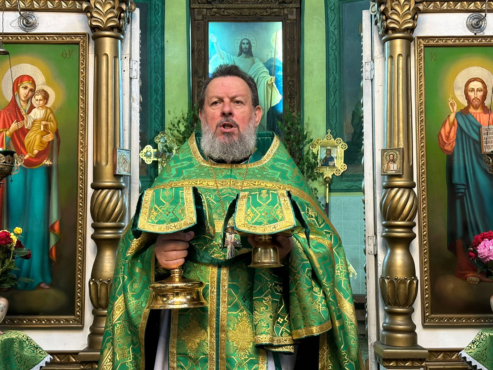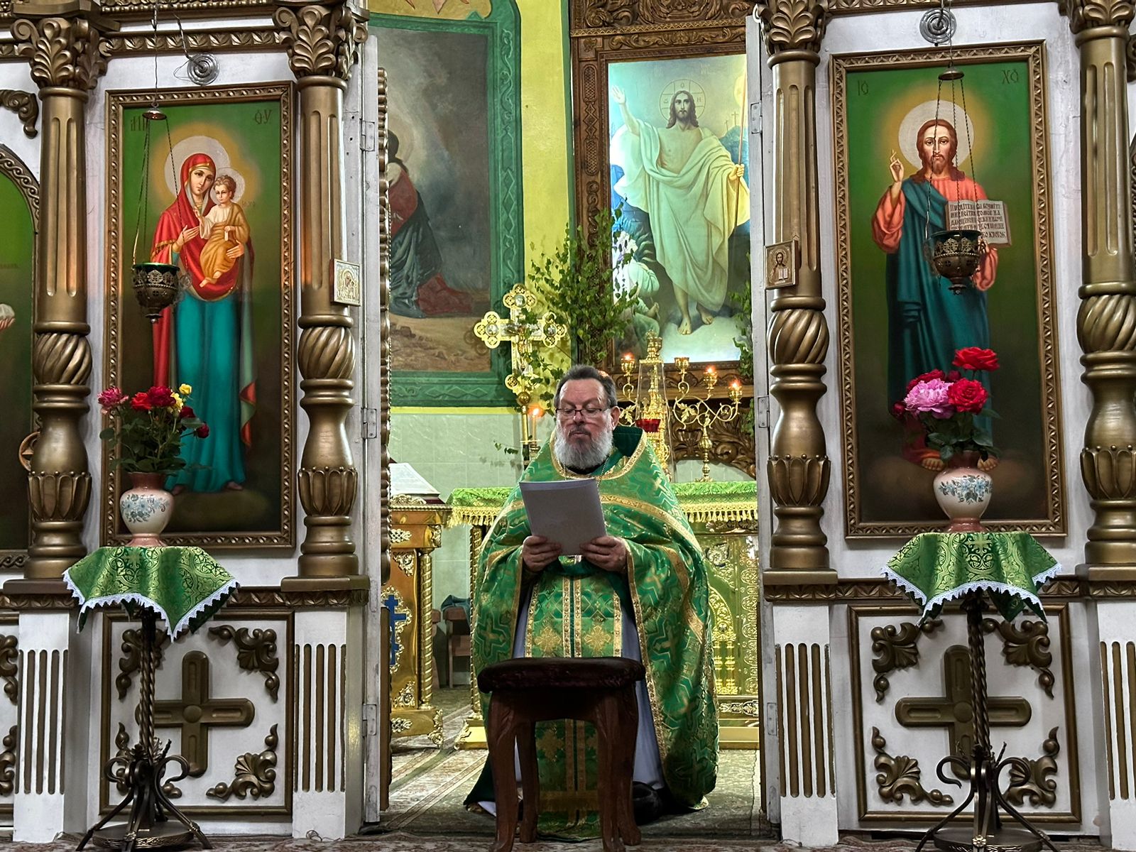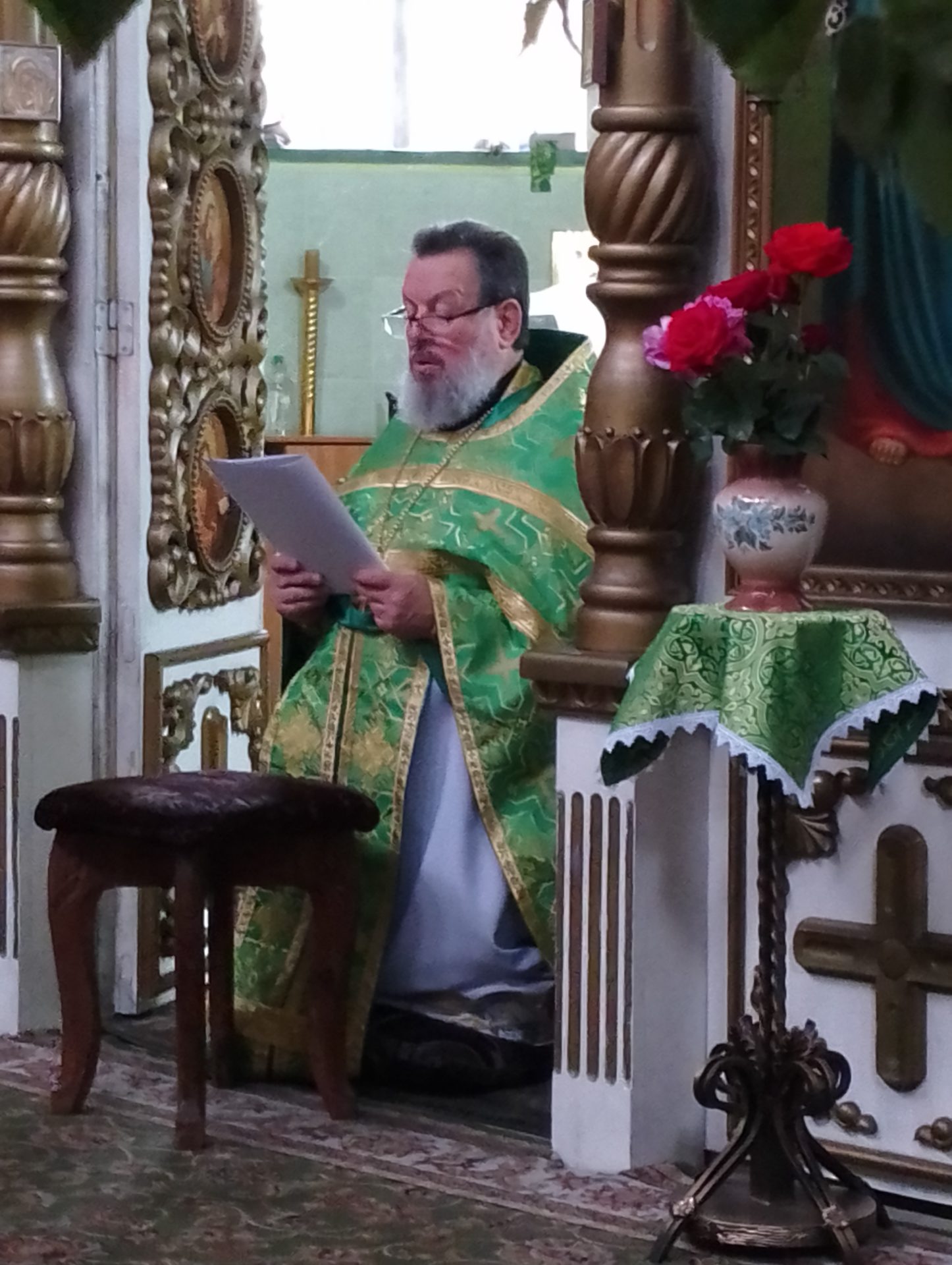 В завершении богослужения, протоиерей Василий обратился к молящимся с проповедью. «Всех вас, дорогие братья и сестры, сердечно поздравляю с Днем Святой Троицы Этот день – день действительного основания христианской Церкви, или христианского общества спасаемых во Христе.  С этого события Дух Святой через святых апостолов и их святых преемников распространил проповедание  Евангелия по всему миру и через эту проповедь возрастил и расширил Церковь по всей вселенной, умудрил святых отцов низложить все заблуждения еретиков, составить богомудрые писания и сохранил веру нашу святой и непорочной до наших дней. Дух Святой чрезвычайным образом излился на апостолов. Но и прочим членам Церкви Христовой преподан Святой Дух через покаяние, крещение и другие таинства. Дух Святой соделал святыми и прославил чудесами и нетлением мощей бесчисленное множество благоугодивших Богу людей и доселе содействует спасению каждого из нас. Все, что мы сейчас имеем в Святой Церкви, все ее духовное богатство, вся благодать, исходящая от молитв и таинств ее, – все это берет начало со дня Святой Пятидесятницы. Поэтому-то так радостен нынешний праздник, поэтому-то так особенно и чувствуем мы себя в этот день.
