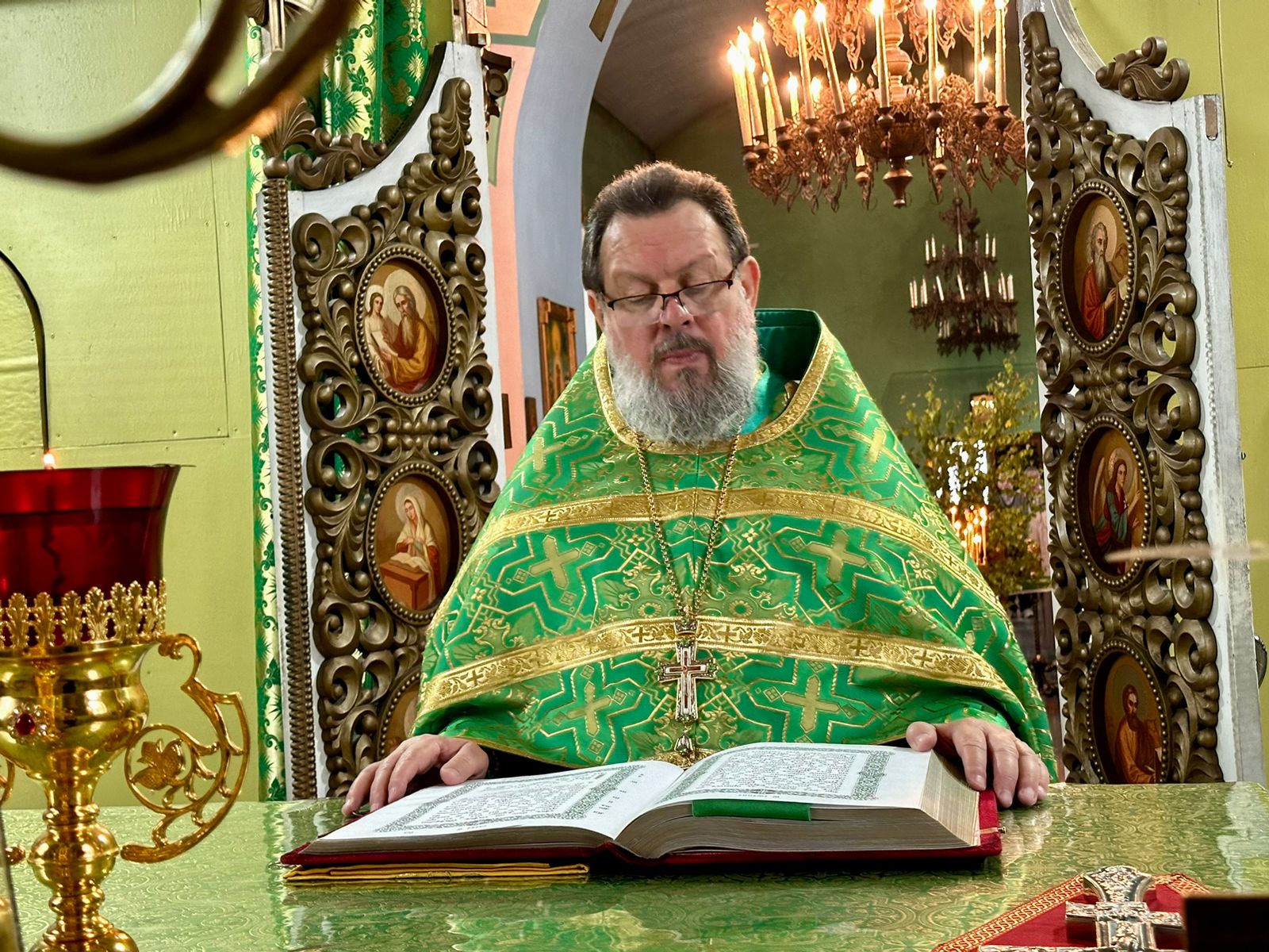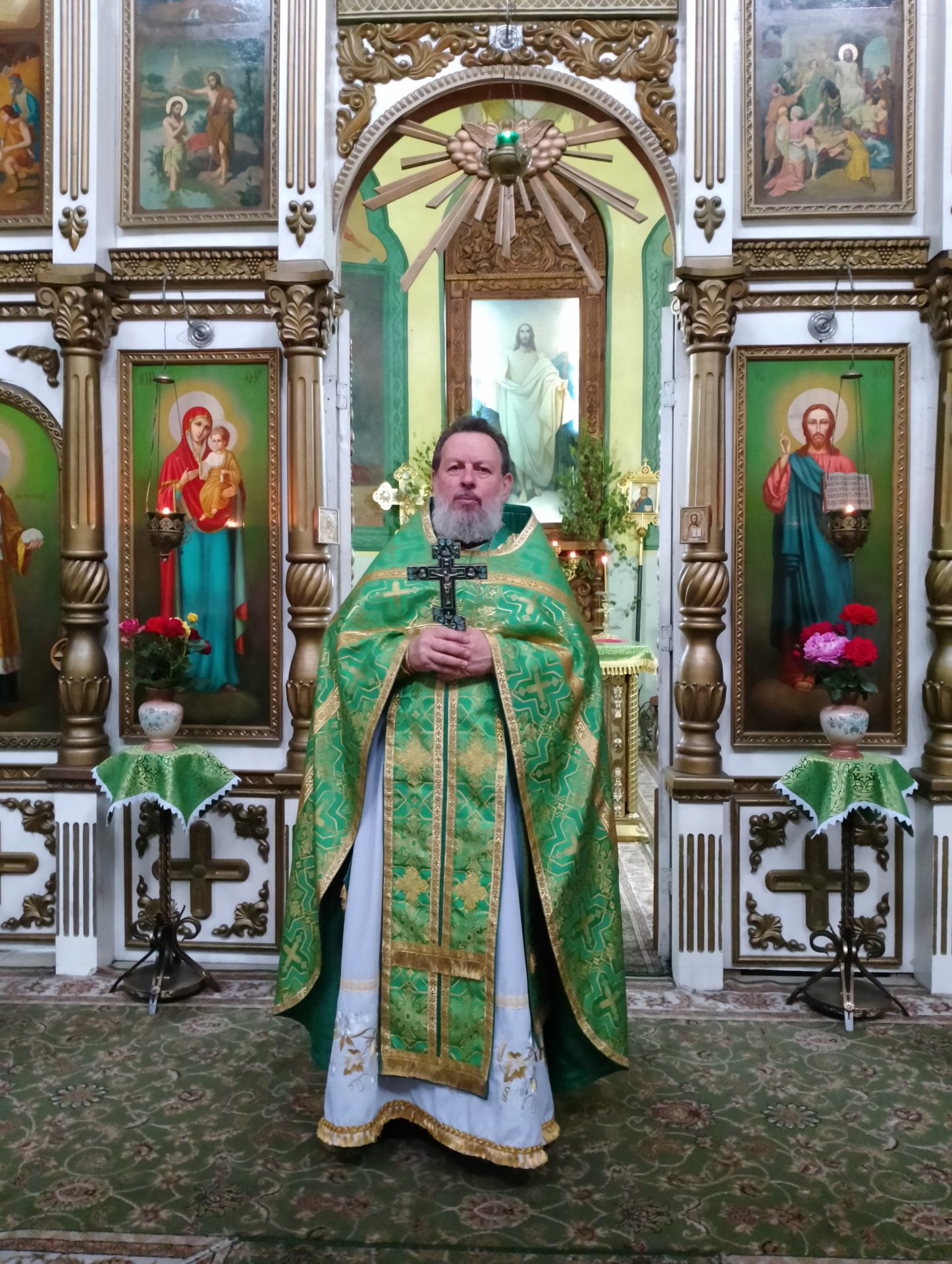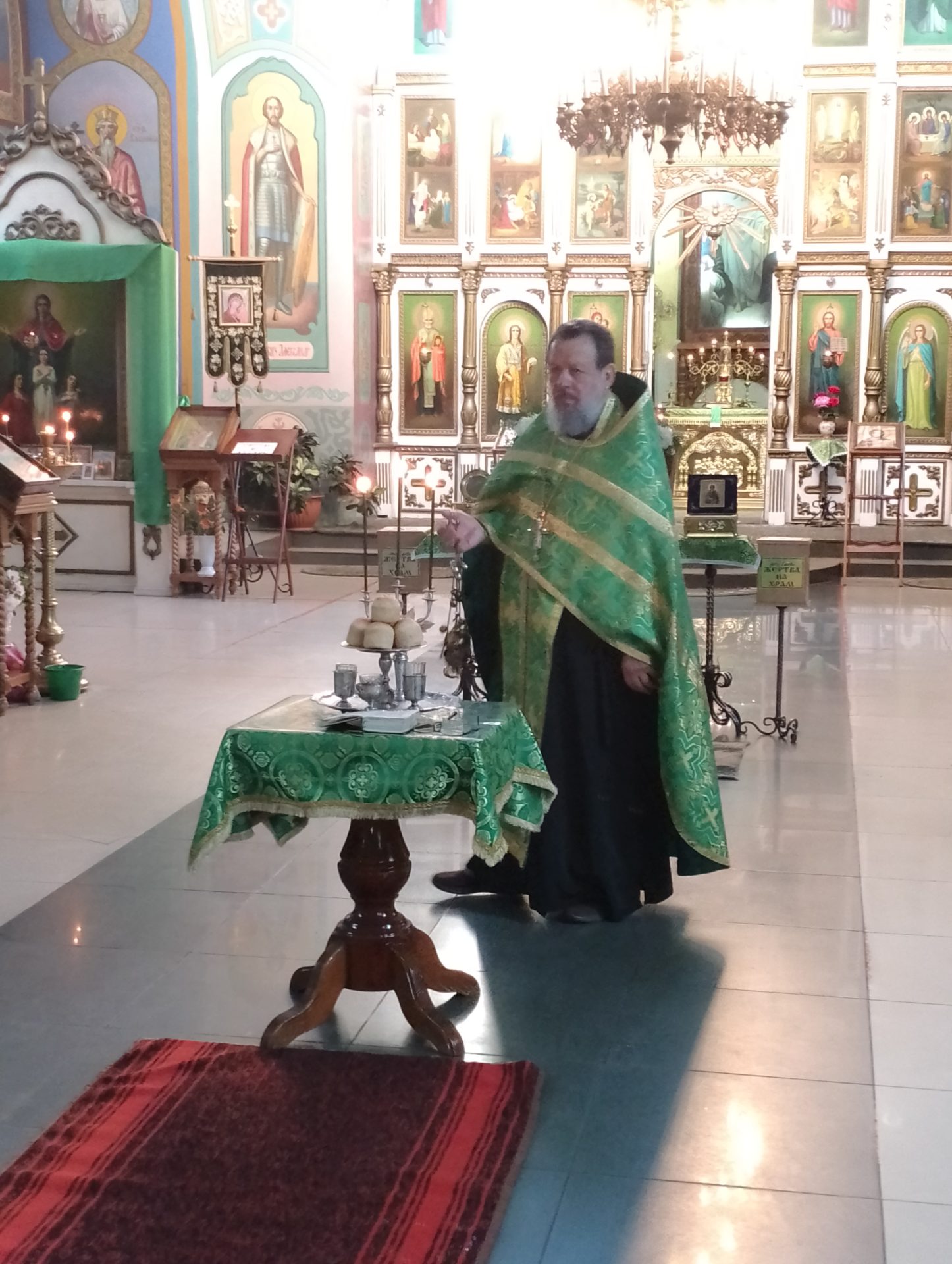 В завершении богослужения, протоиерей Василий обратился к молящимся с проповедью. «Всех вас, дорогие братья и сестры, сердечно поздравляю с Днем Святой Троицы Этот день – день действительного основания христианской Церкви, или христианского общества спасаемых во Христе.  С этого события Дух Святой через святых апостолов и их святых преемников распространил проповедание  Евангелия по всему миру и через эту проповедь возрастил и расширил Церковь по всей вселенной, умудрил святых отцов низложить все заблуждения еретиков, составить богомудрые писания и сохранил веру нашу святой и непорочной до наших дней. Дух Святой чрезвычайным образом излился на апостолов. Но и прочим членам Церкви Христовой преподан Святой Дух через покаяние, крещение и другие таинства. Дух Святой соделал святыми и прославил чудесами и нетлением мощей бесчисленное множество благоугодивших Богу людей и доселе содействует спасению каждого из нас. Все, что мы сейчас имеем в Святой Церкви, все ее духовное богатство, вся благодать, исходящая от молитв и таинств ее, – все это берет начало со дня Святой Пятидесятницы. Поэтому-то так радостен нынешний праздник, поэтому-то так особенно и чувствуем мы себя в этот день.