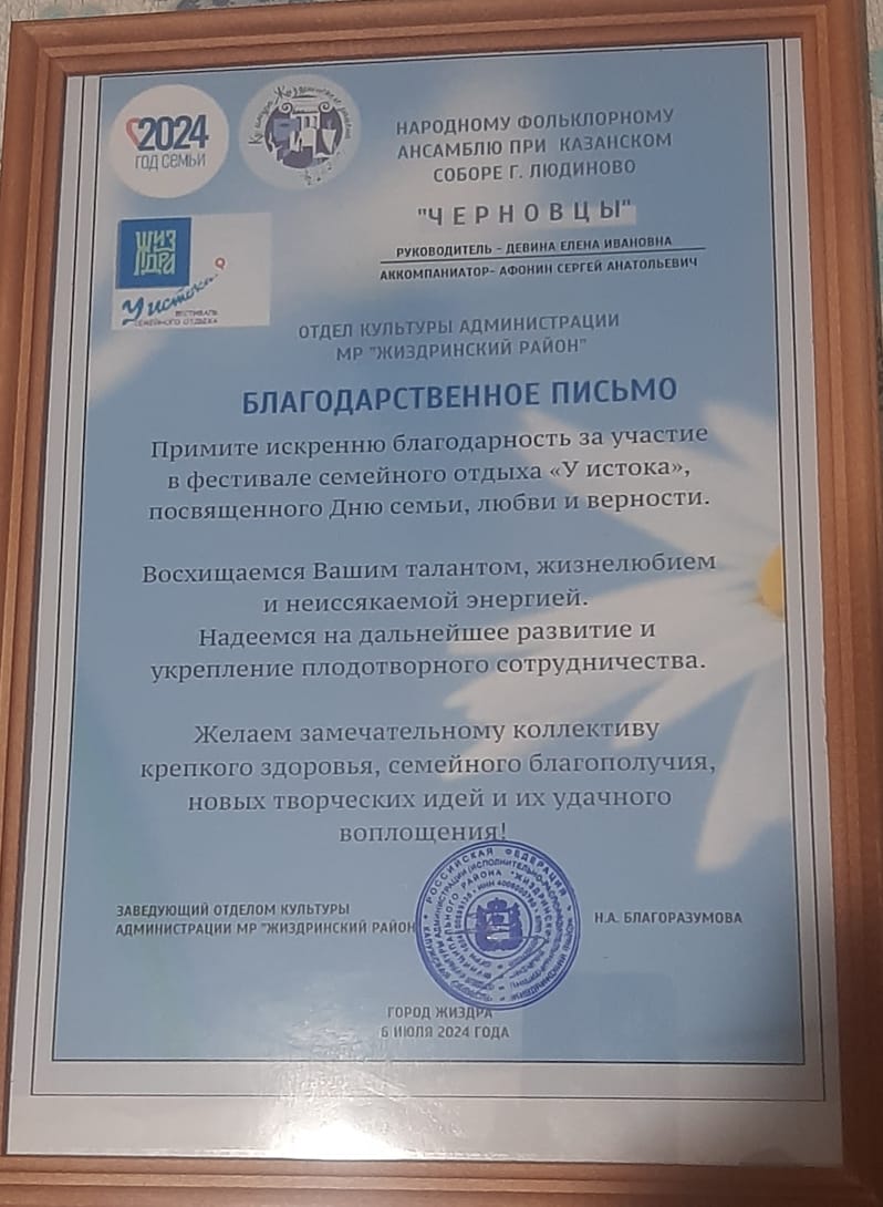 6 июля 2024 года, в преддверии Дня семьи, любви и верности, в парке города Жиздра прошёл фестиваль семейного отдыха «У истока». На фестиваль администрация Жиздры пригласила народный фольклорный ансамбль «Черновцы» (руководитель Елена Девина) при Казанском соборе города Людиново. По благословению благочинного Людиновского округа Козельской епархии настоятеля Казанского собора города Людиново протоиерея Алексия Жиганова творческий коллектив «Черновцы» выступил со своим репертуаром русских народных песен на фестивале в Жиздре, став, как и другие выступающие, украшением торжества. Задорные, хороводные, лирические песни звучали в исполнении ансамбля «Черновцы», радуя зрителей и присутствующие семьи города Жиздры, которых чествовали в этот день. За участие в фестивале семейного отдыха «У истока» творческому коллективу от администрации города Жиздра были вручены благодарственное письмо и подарок.