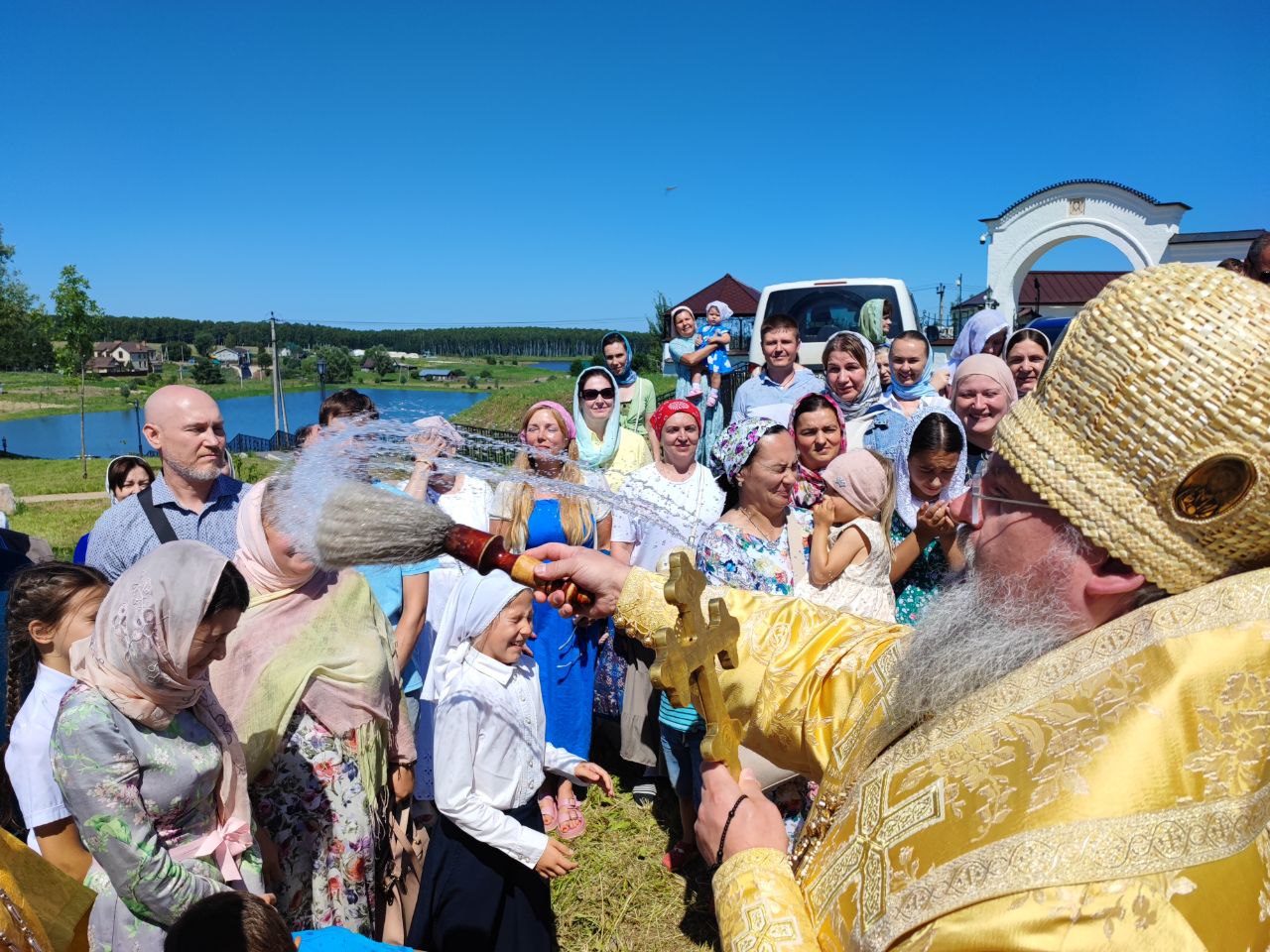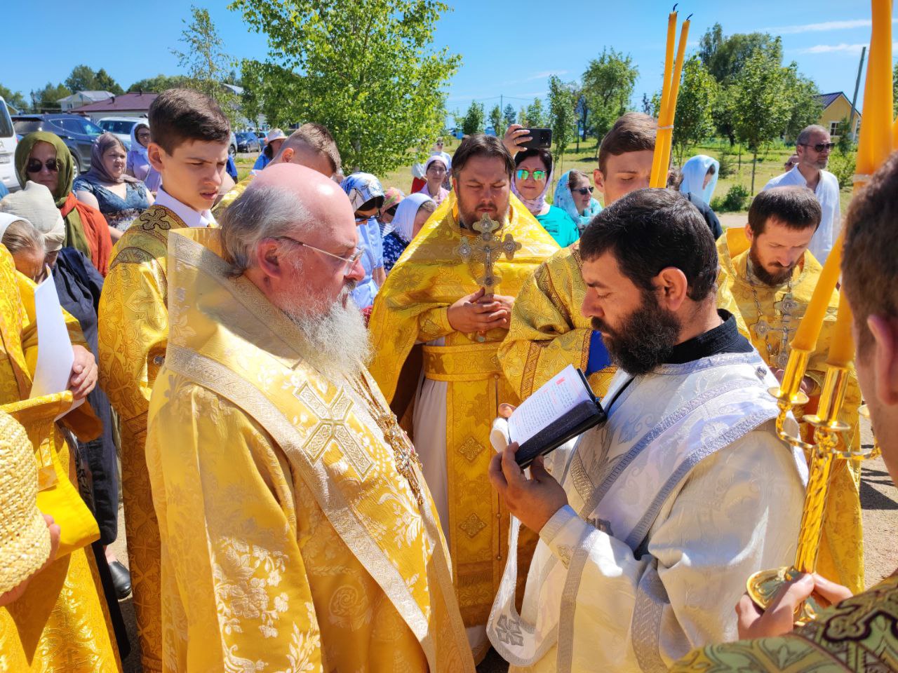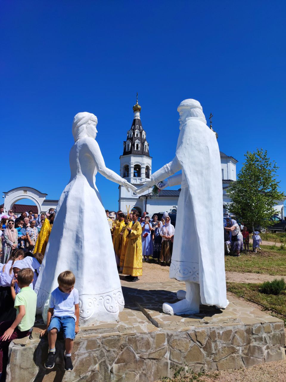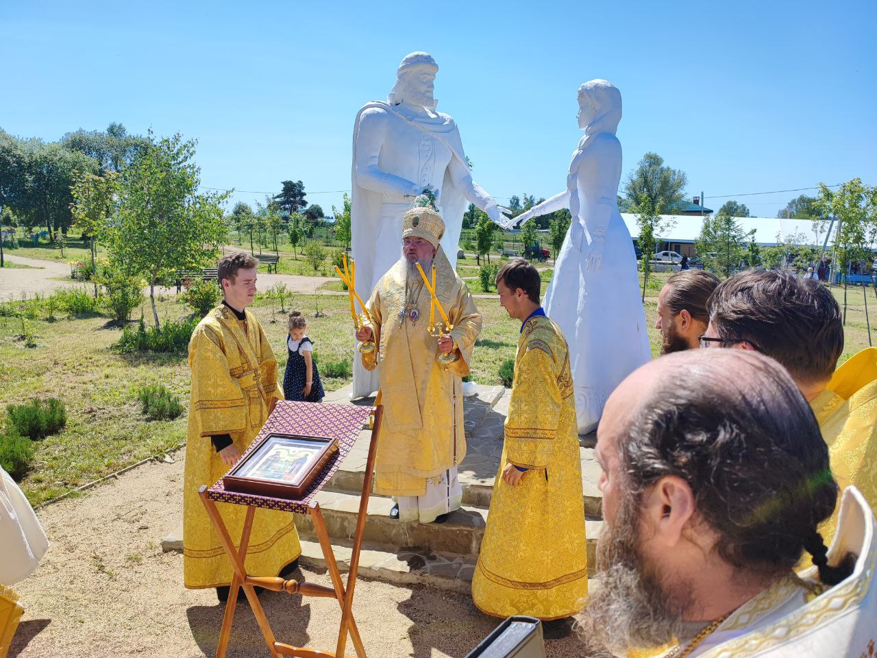 По отпусте литургии священнослужители совершили крестный ход к памятнику святым благоверным князьям Петру и Февронии, где был совершен праздничный молебен, а затем, вознеся молитву угодникам Божиим, владыка обратился к богомольцам с архипастырским словом.