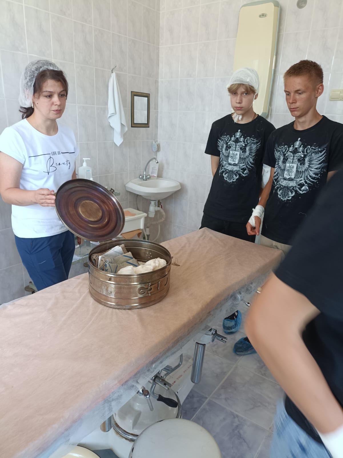 Дети из Епархиального Социального центра помощи семье и детям «Рождественский» на базе медицинского батальона Козельской дивизии учились правильному наложению кровоостанавливающих жгутов на разные конечности. На муляже Васе тренировались делать непрямой массаж сердца. Не все сразу получалось-как в любом деле есть много тонкостей, нарушая которые можно нанести вред, а не пользу пострадавшим. На все это военные медики обращали внимание детей. Операционные, перевязочные, оборудование-все было интересно детям в хирургическом отделении. Наложение давящих повязок, «шапочка Гиппократа» и другие повязки показали медицинские сестры, а дети тут же все повторяли. Два дня занятий с медиками, это конечно мало, но какие-то навыки дети приобрели. Верим, в критической ситуации не растеряются и окажут минимальную помощь пострадавшим. После занятий в хирургическом отделении мальчишки и девчонки пообедали в солдатской столовой. Благодарим военных медиков за внимание к детям, а поваров за вкусный обед.
