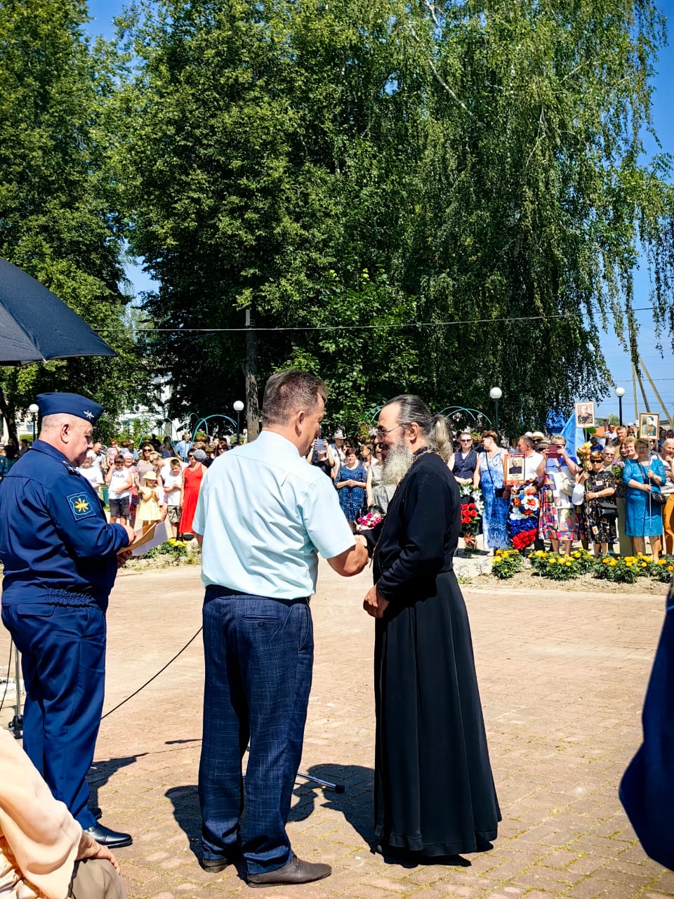 Также на митинге присутствовал военный комиссар военного комиссариата Хвастовического и Ульяновского районов Калужской области, гвардии-подполковник запаса Игорь Викторович Черкасов. Он поздравил всех с Днем Освобождения района и вручил священникам района медали. Благочинному Ульяновского округа, протоиерею Максиму Садовникову медаль «ЗА ВЕРУ И ТРУД». Иерею Алексею Сорокину, настоятелю храма Казанской иконы Божией Матери села Дудоровский и иерею Стахию Гайсину, настоятелю храма святых мучениц Евдокии, Евдокии, Дарьи и Марии села Уколица — медали «ЗА ПОМОЩЬ ФРОНТУ».