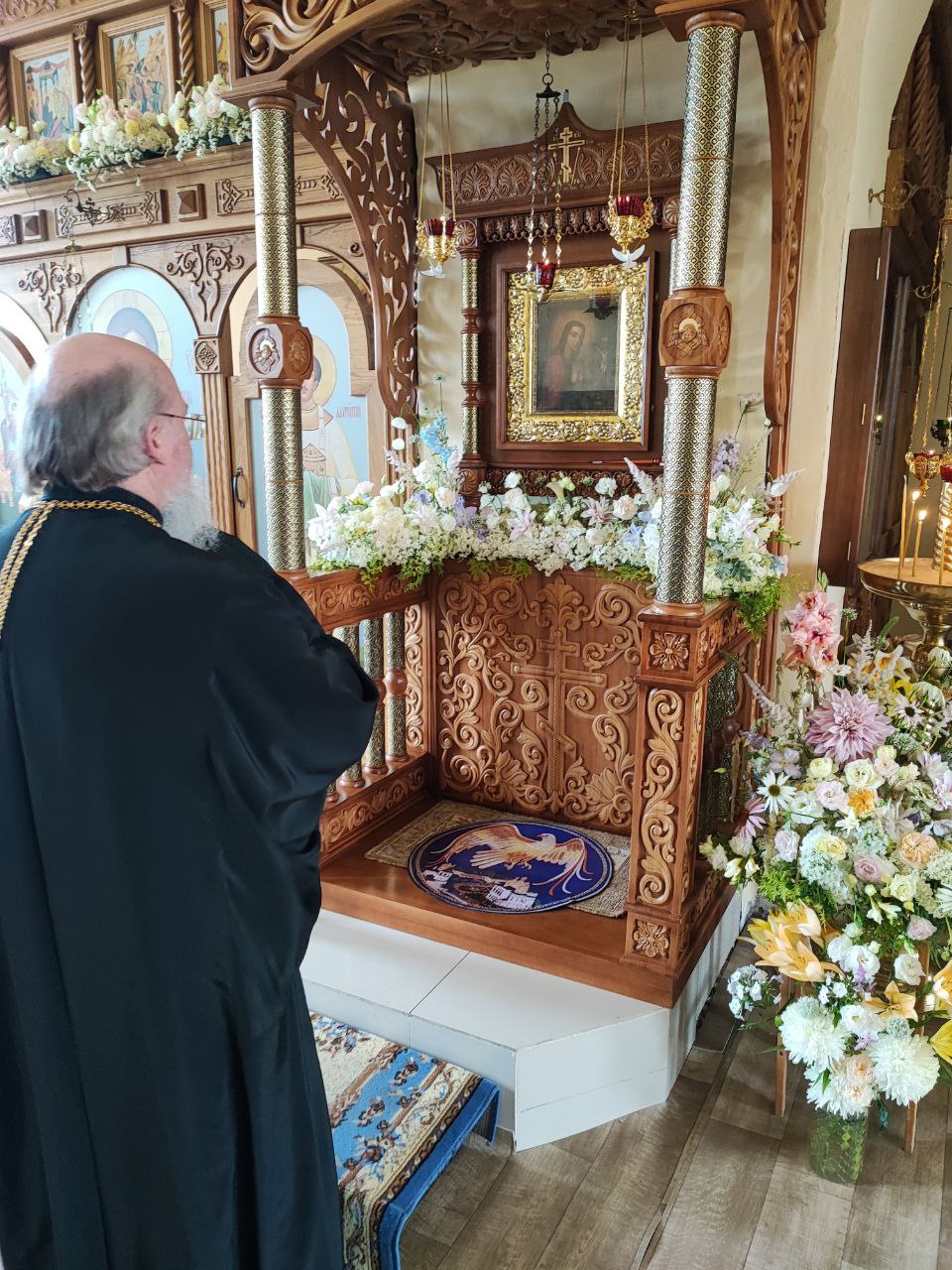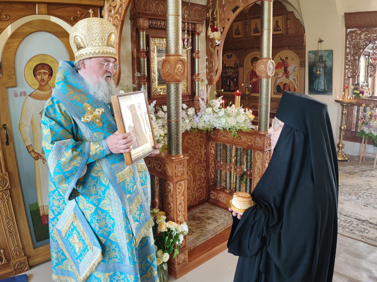 По отпусте литургии священнослужители совершили славление Пресвятой Богородице, а затем, вознеся молитву Божией Матери, владыка обратился к богомольцам с архипастырским словом.