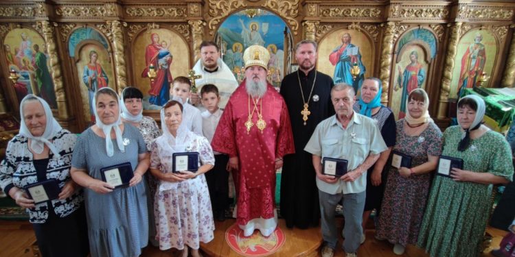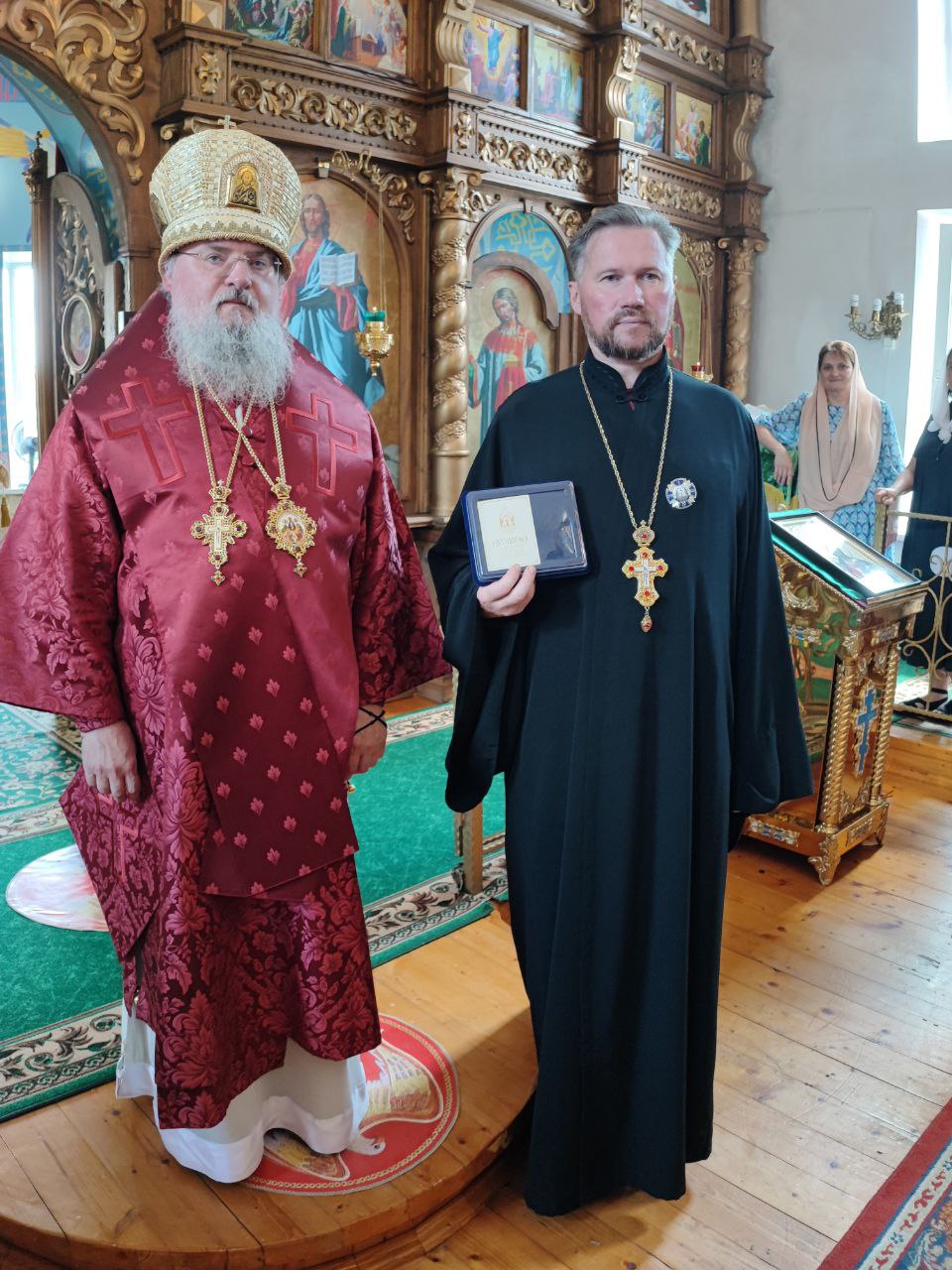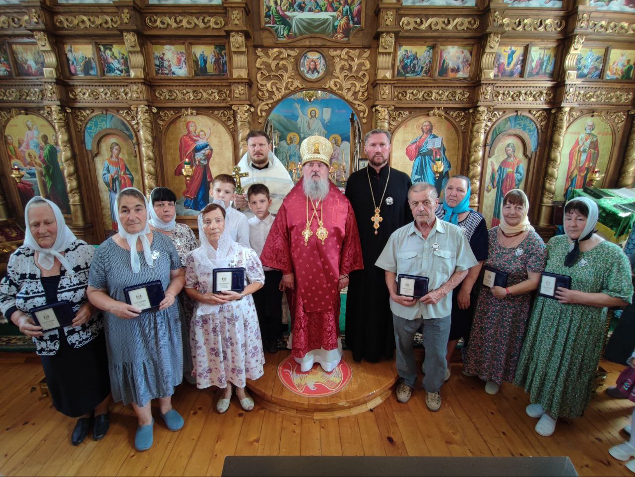 Епископ Никита поздравил настоятеля прихода протоиерея Александра Карпова с сорокопятилетием и вручил ему святую просфору памятный подарок. Также настоятель и ряд прихожан были удостоены памятного юбилейного знака 10-летия образования Козельской епархии.