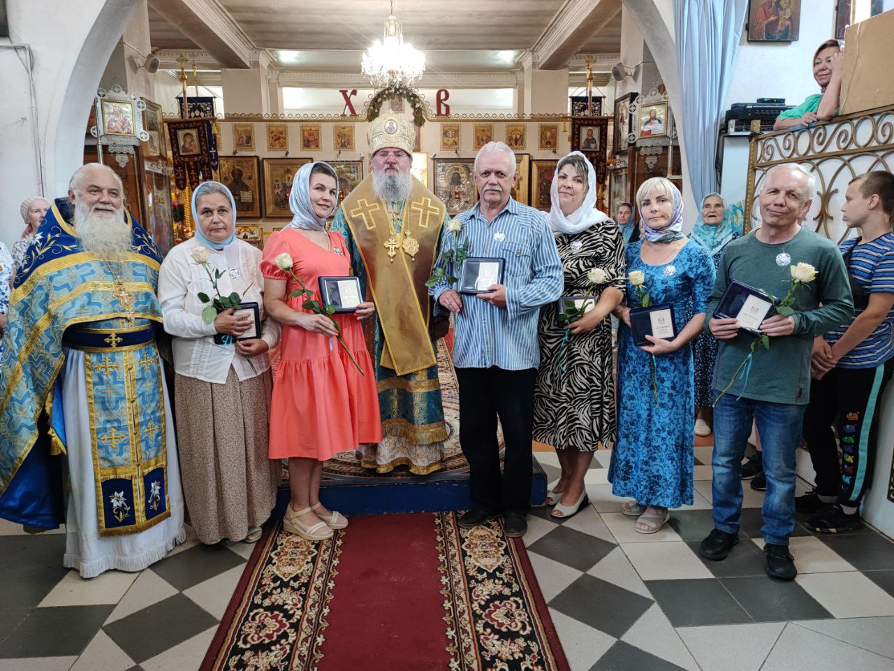 Здесь же во внимание к трудам во славу Святой Церкви Епископ Никита вручил юбилейные нагрудные знаки «10-летия образования Козельской епархии» следующим прихожанам и мирянам, активно участвующим в жизни Прихода Казанского собора: Богдану Галий, Александру Танакову, Александру Родину, Ирине Багмет, Марине Неверовской, Юлии Кондаковой, Анне Французовой.