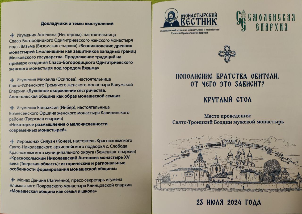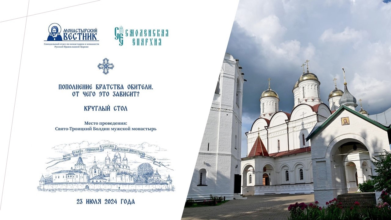 По благословению Святейшего Патриарха Московского и всея Руси Кирилла 23 июля 2024 года в Свято-Троицком Болдином мужском монастыре Смоленской епархии в очно-дистанционном формате состоялся Межрегиональный круглый стол «Пополнение братства обители. От чего это зависит?».