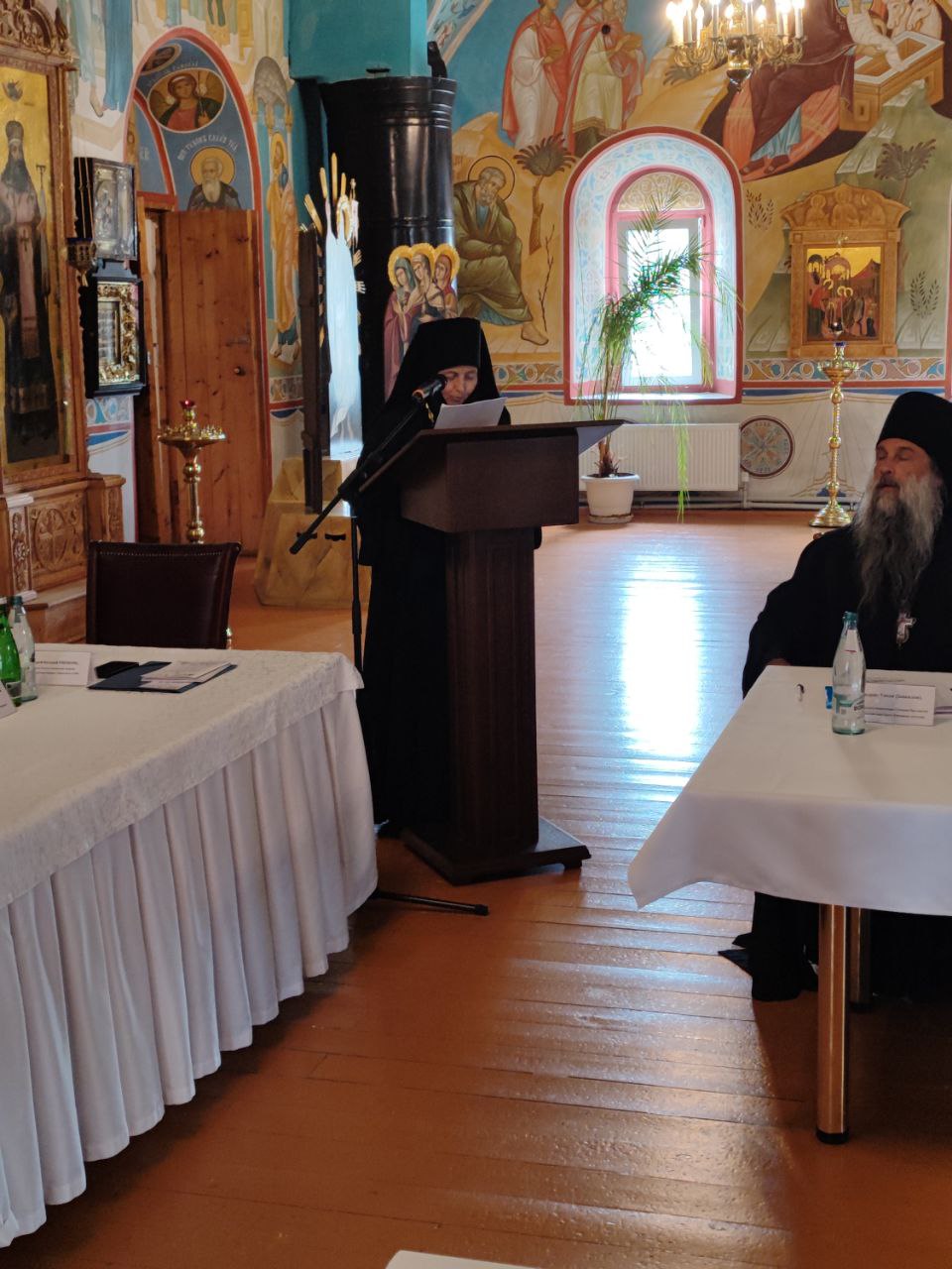 Игумения Михаила (Осипова), настоятельница Свято-Успенского Гремячего женского монастыря Калужской Епархии. Тема доклада — «Духовное окормление сестричества. Апостольская община как образ монашеской семьи».