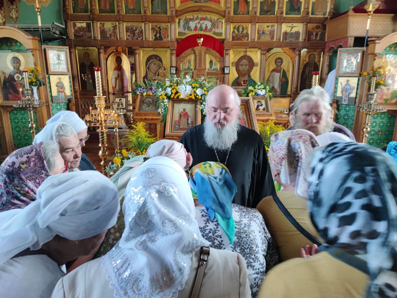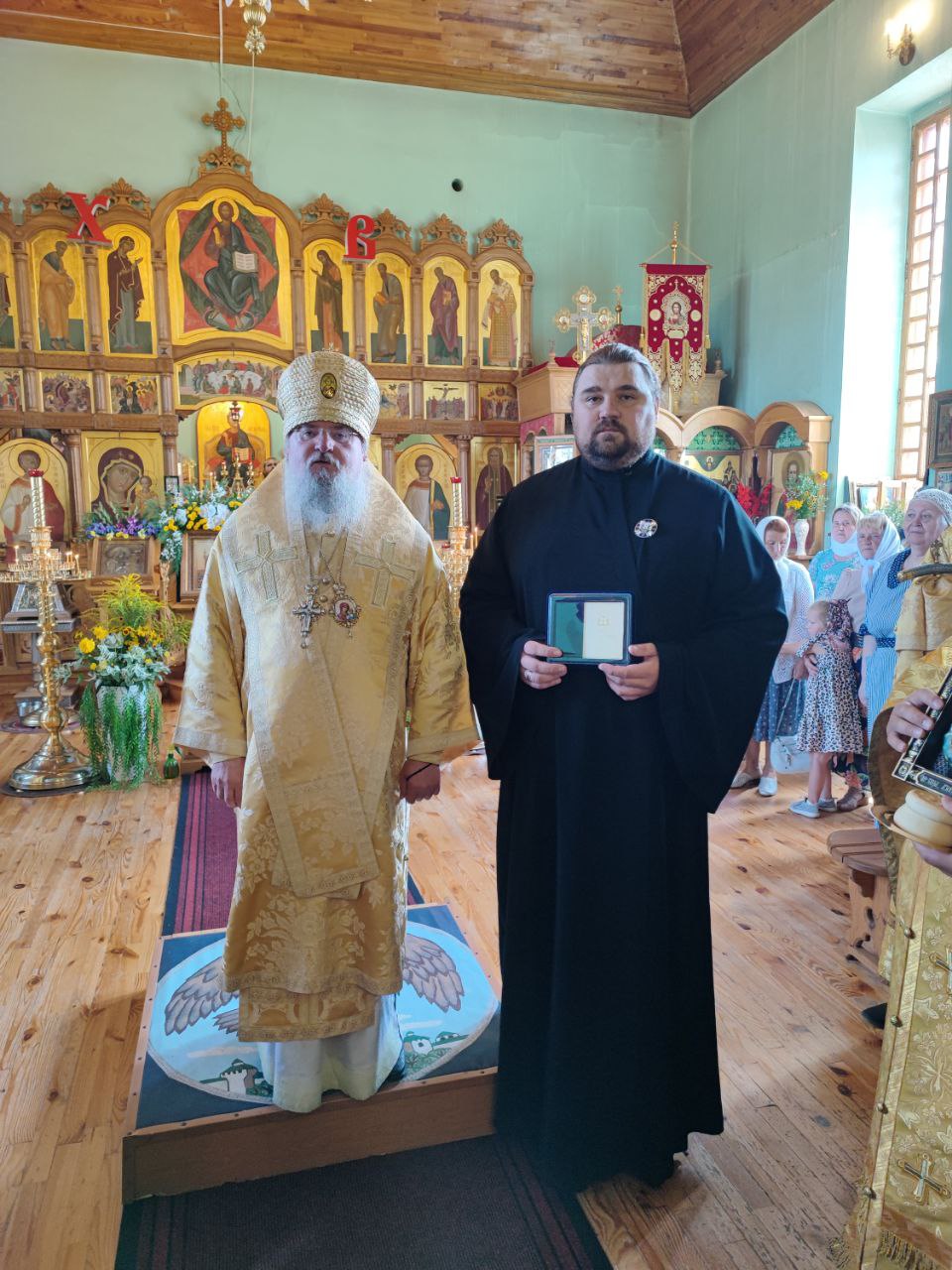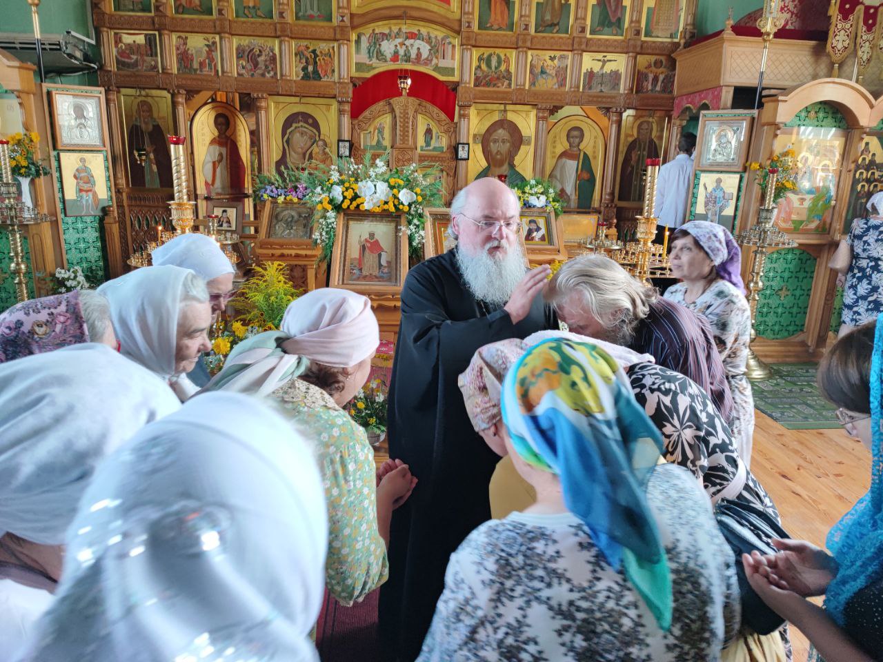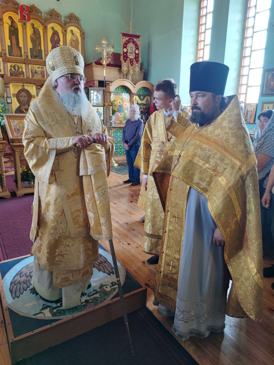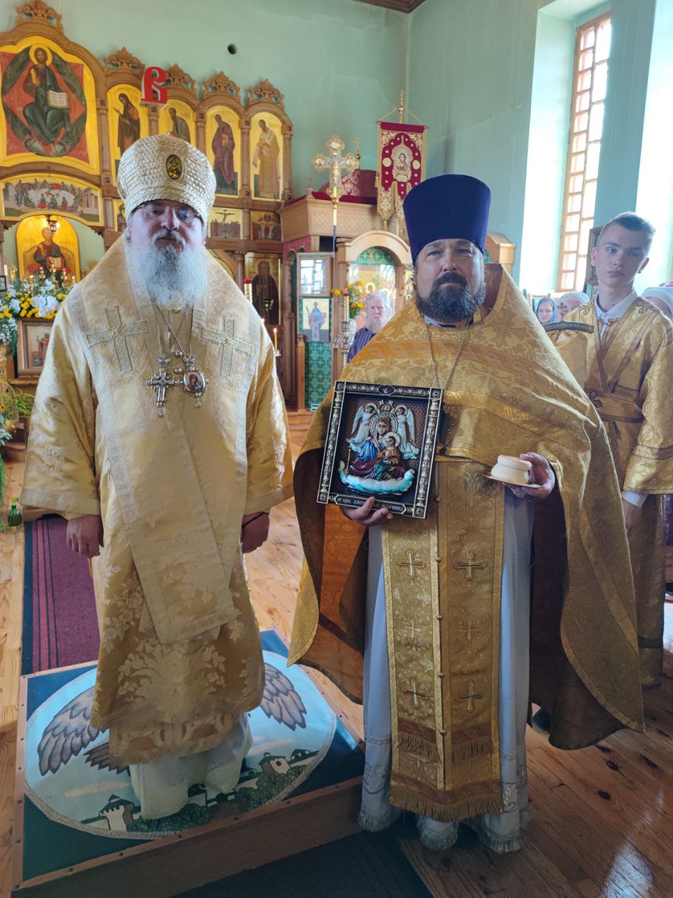 Архипастырь поздравил настоятеля храма протоиерея Владимира Бахаева с днем тезоименитства и преподнес ему святую просфору и икону Пресвятой Богородицы.